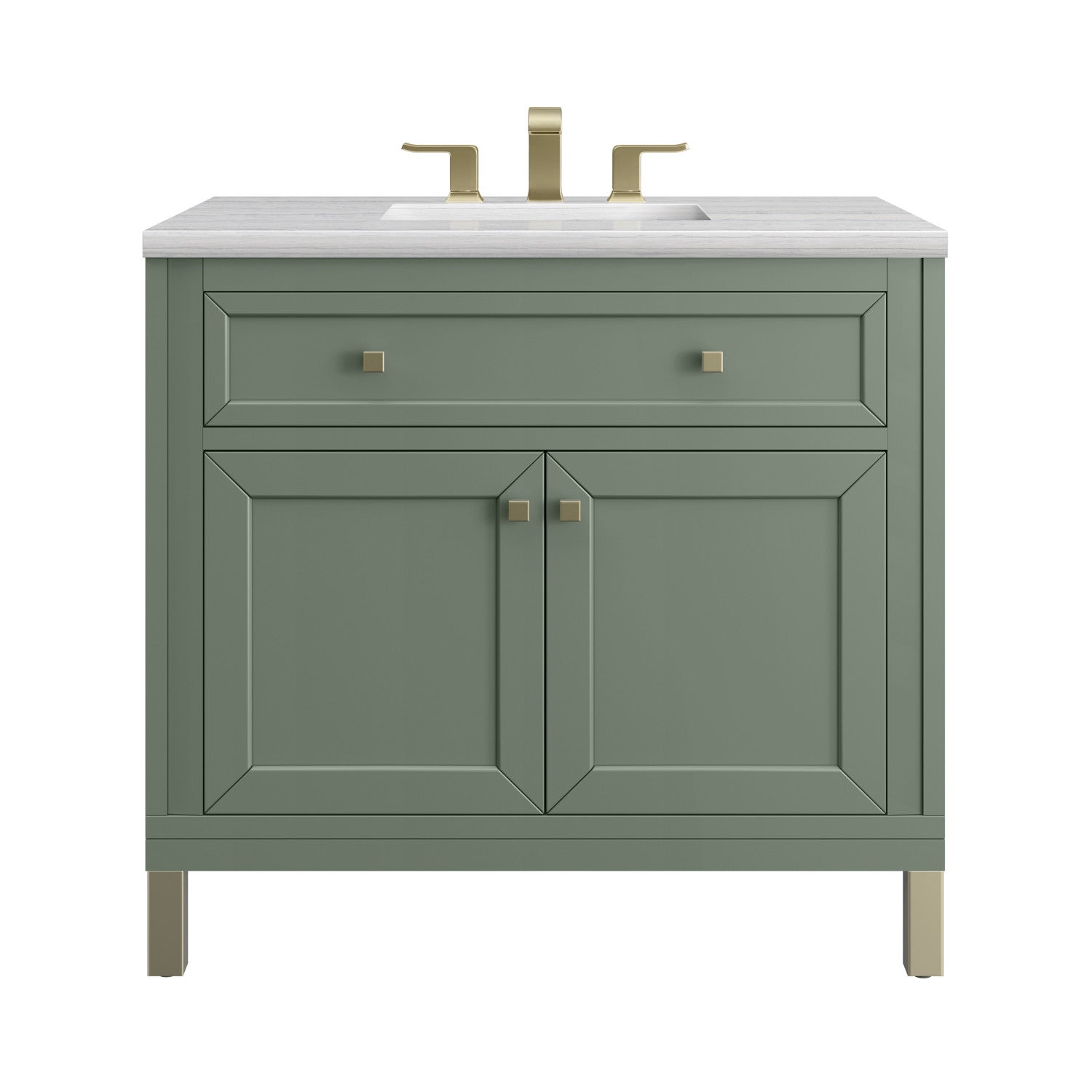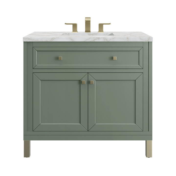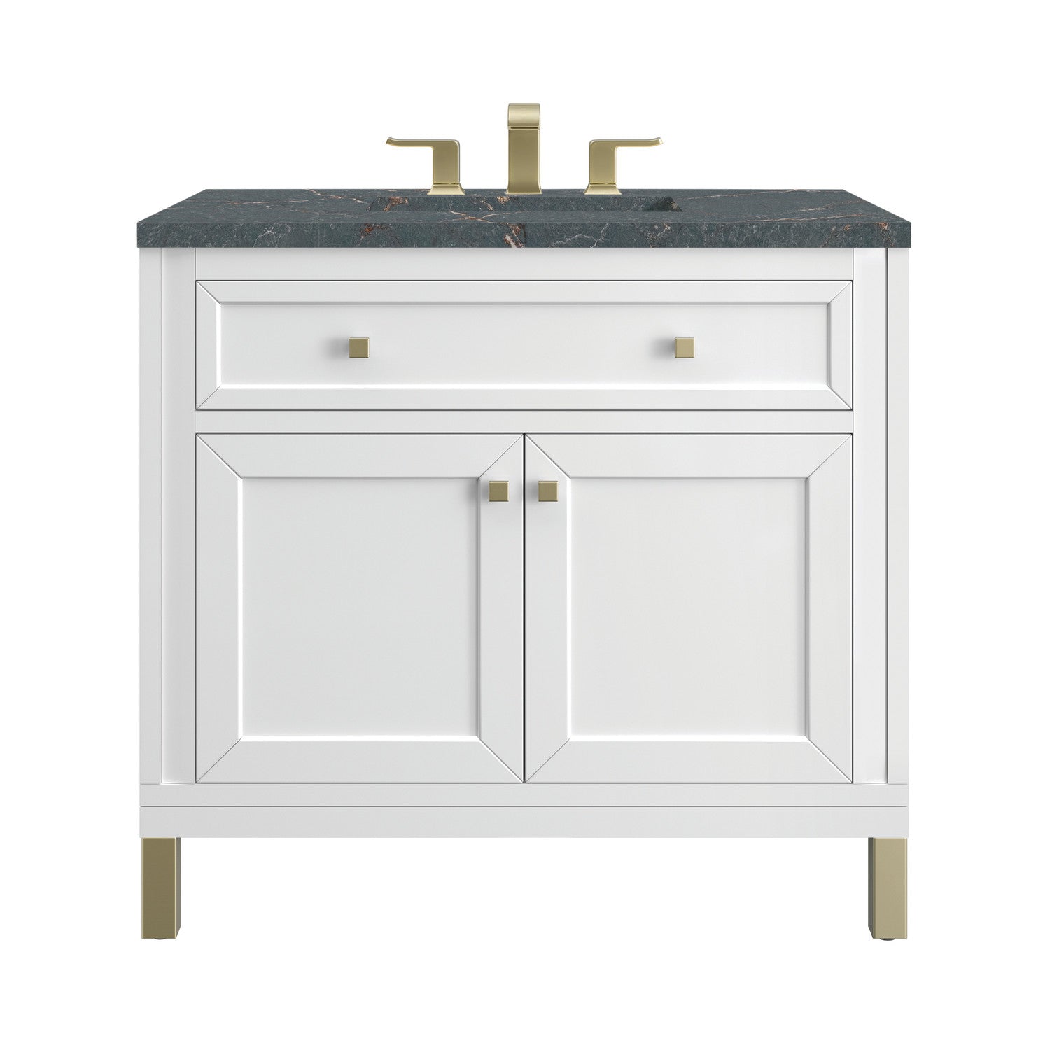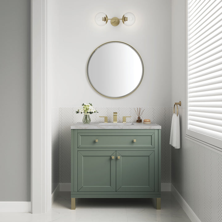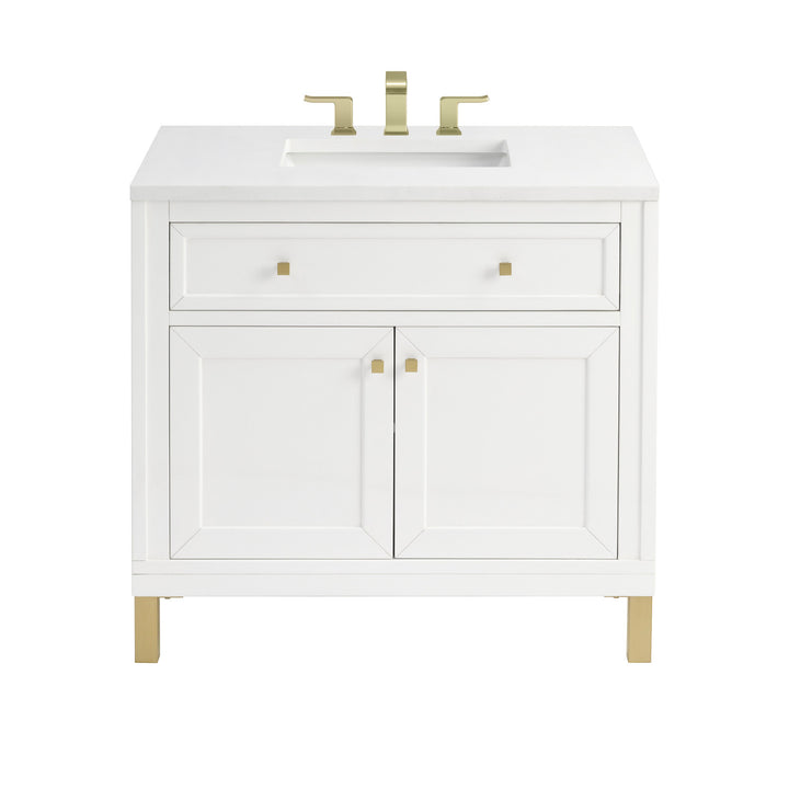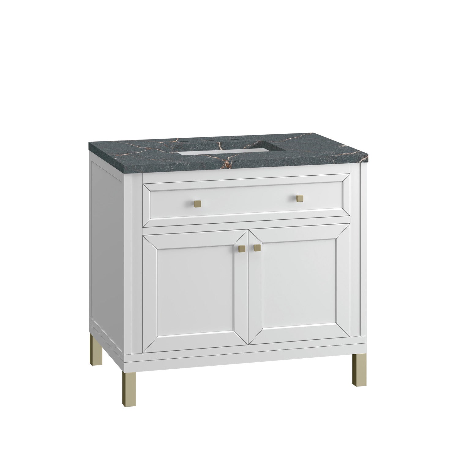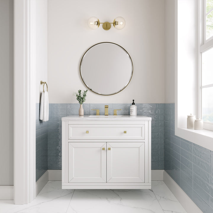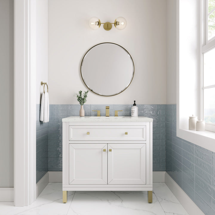 The sophisticated details and clean lines of the Chicago 36" Single Vanity by James Martin Vanities make it the perfect choice for any bathroom. Featuring a Glossy White, Smokey Celadon, or Walnut Whisper finish. This vanity offers ample storage with its two-door cabinet, adjustable interior shelf, and top-row tip-out drawer. Champagne Brass knobs and legs (in Glossy White, Smokey Celadon) or Satin Nickel knobs and legs (Walnut Whisper Only), or choose to forego the metal legs for a modern wall-mounted installation. Complete the look with one of our 3 cm tops.