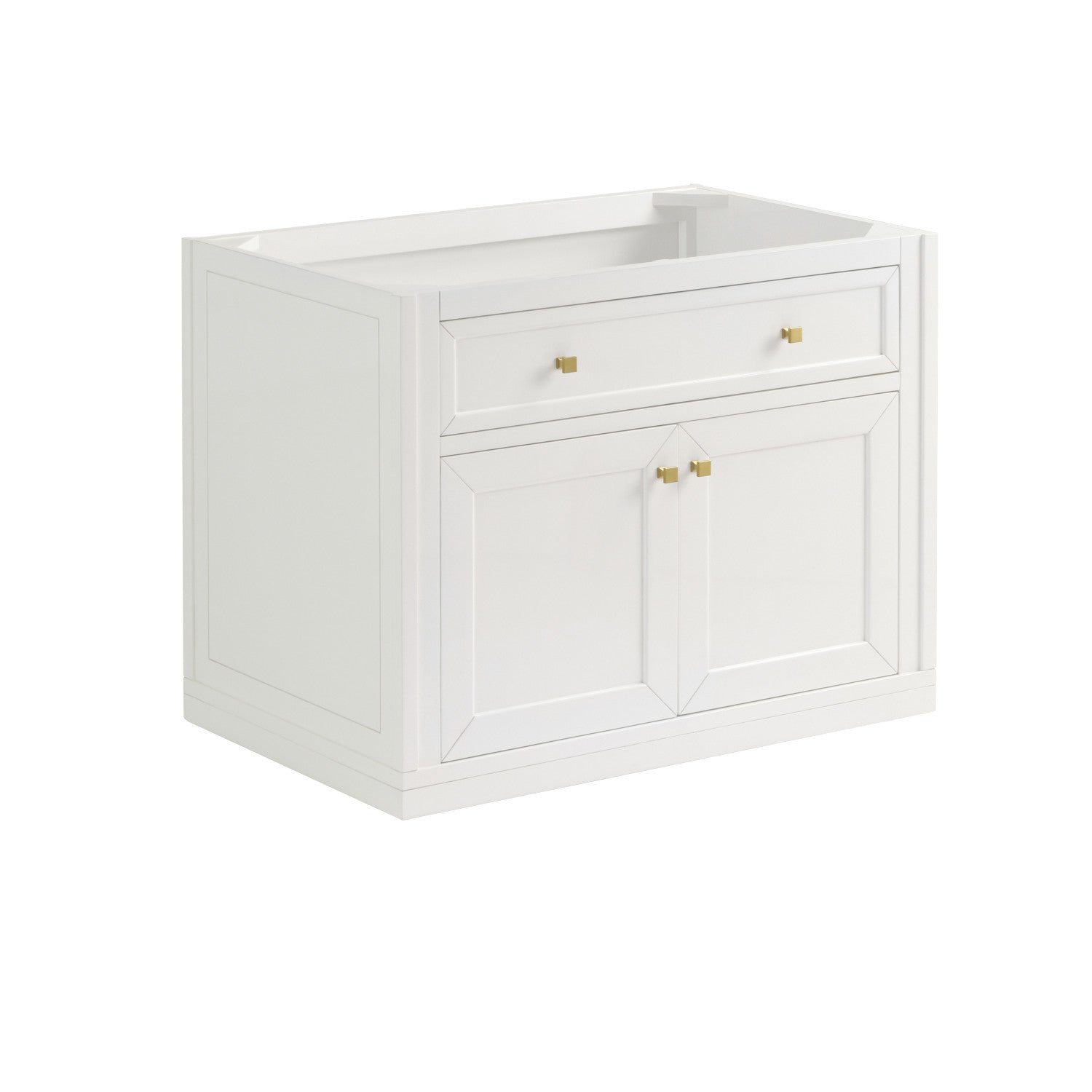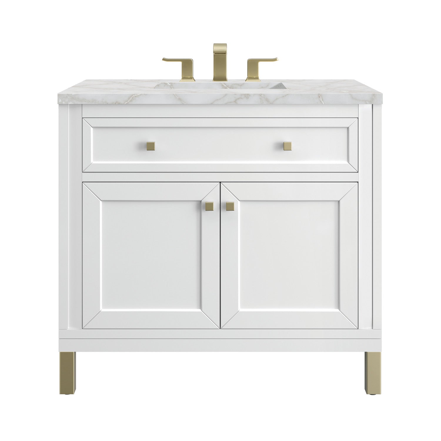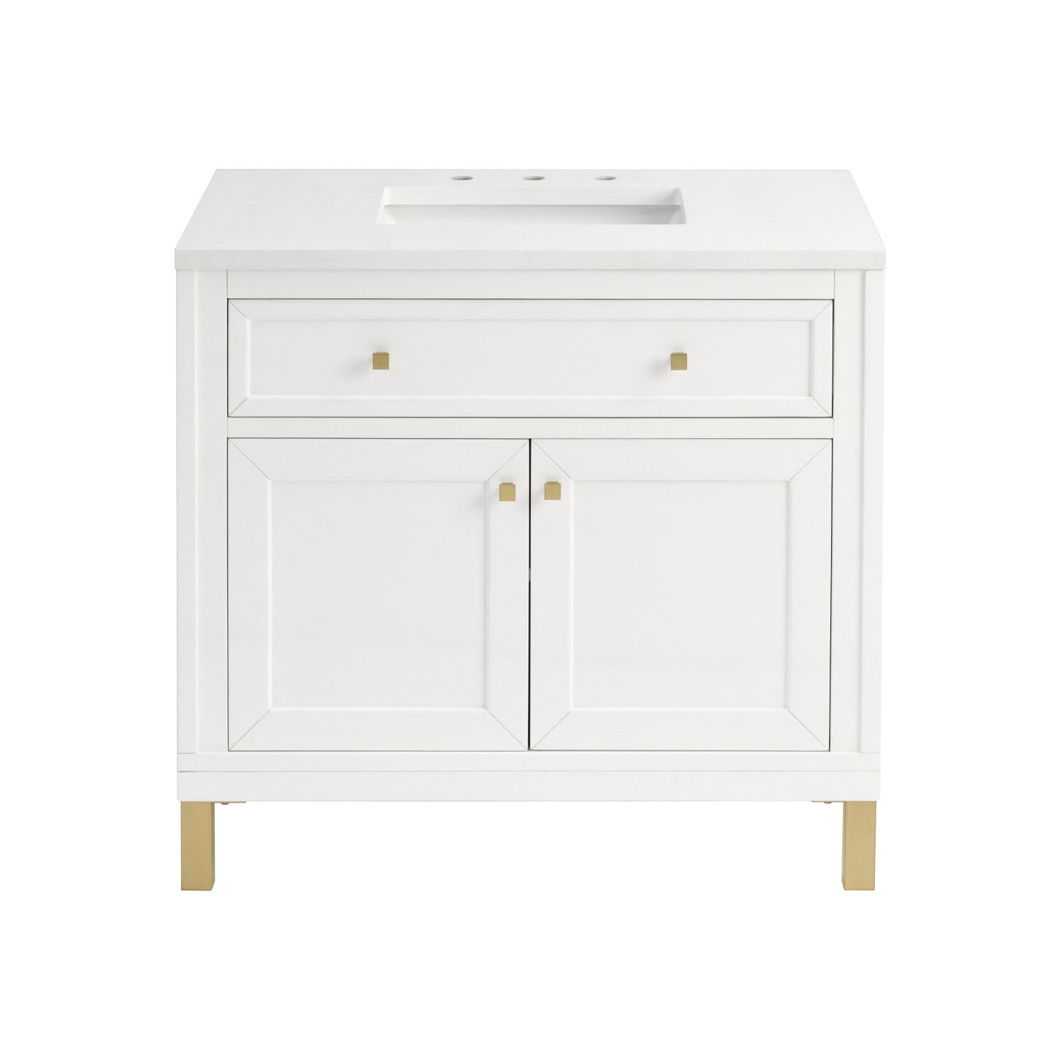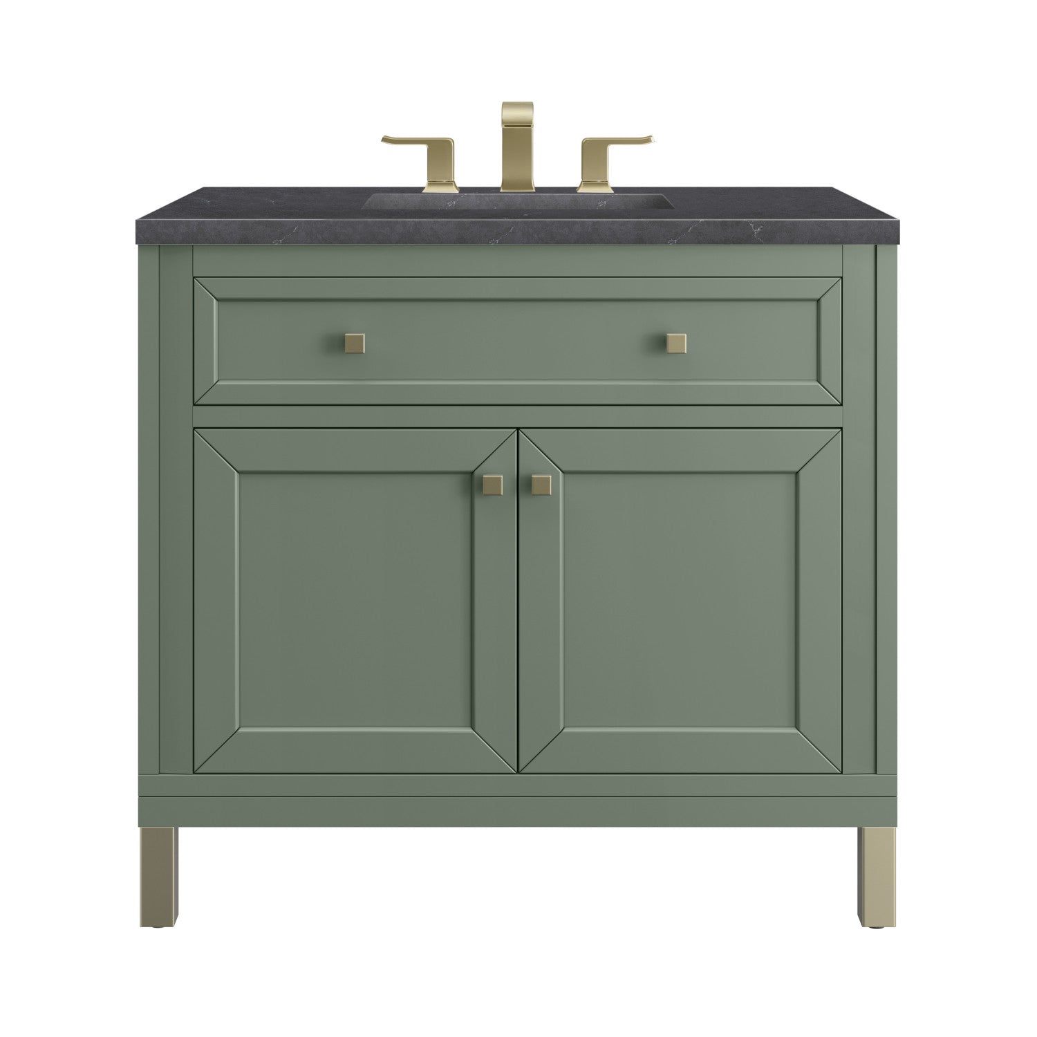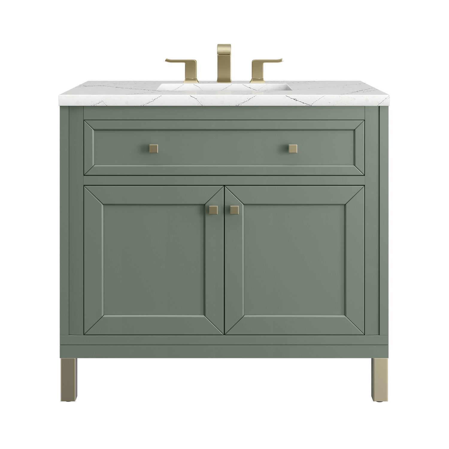 The sophisticated details and clean lines of the Chicago 36" Single Vanity by James Martin Vanities make it the perfect choice for any bathroom. Featuring a Glossy White, Smokey Celadon, or Walnut Whisper finish. This vanity offers ample storage with its two-door cabinet, adjustable interior shelf, and top-row tip-out drawer. Champagne Brass knobs and legs (in Glossy White, Smokey Celadon) or Satin Nickel knobs and legs (Walnut Whisper Only), or choose to forego the metal legs for a modern wall-mounted installation. Complete the look with one of our 3 cm tops.