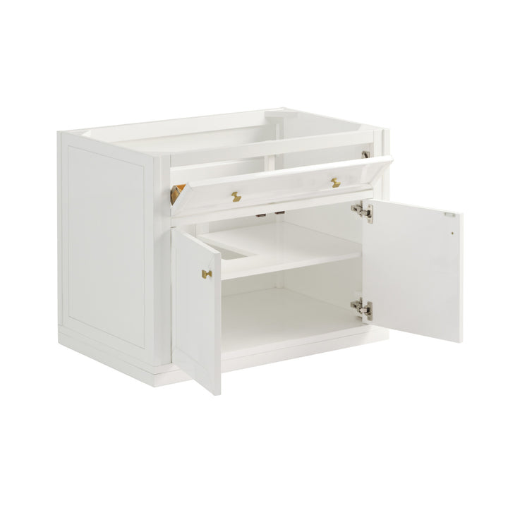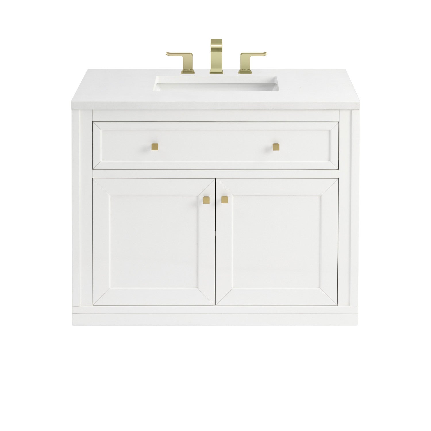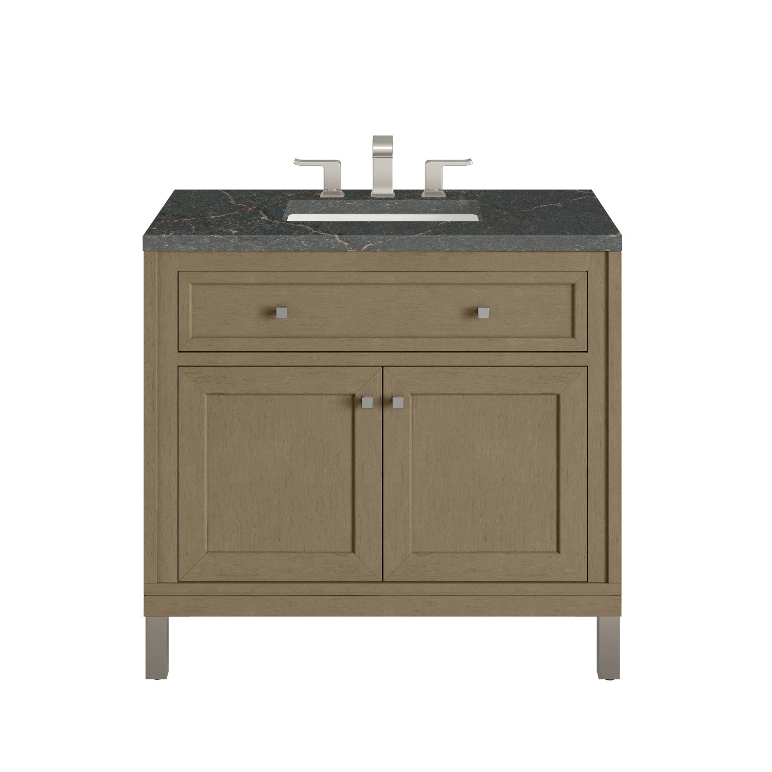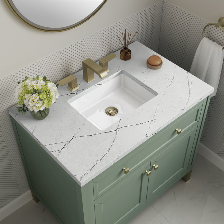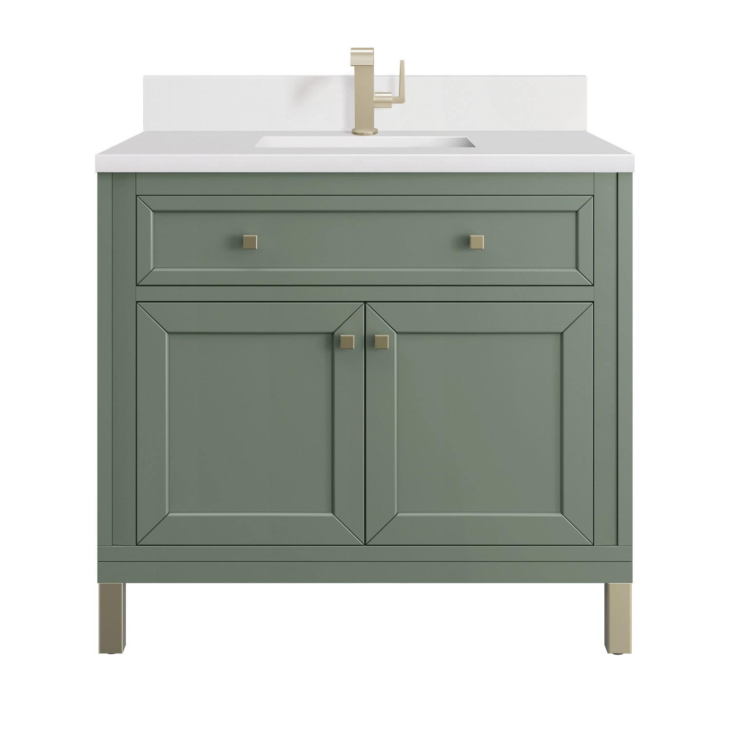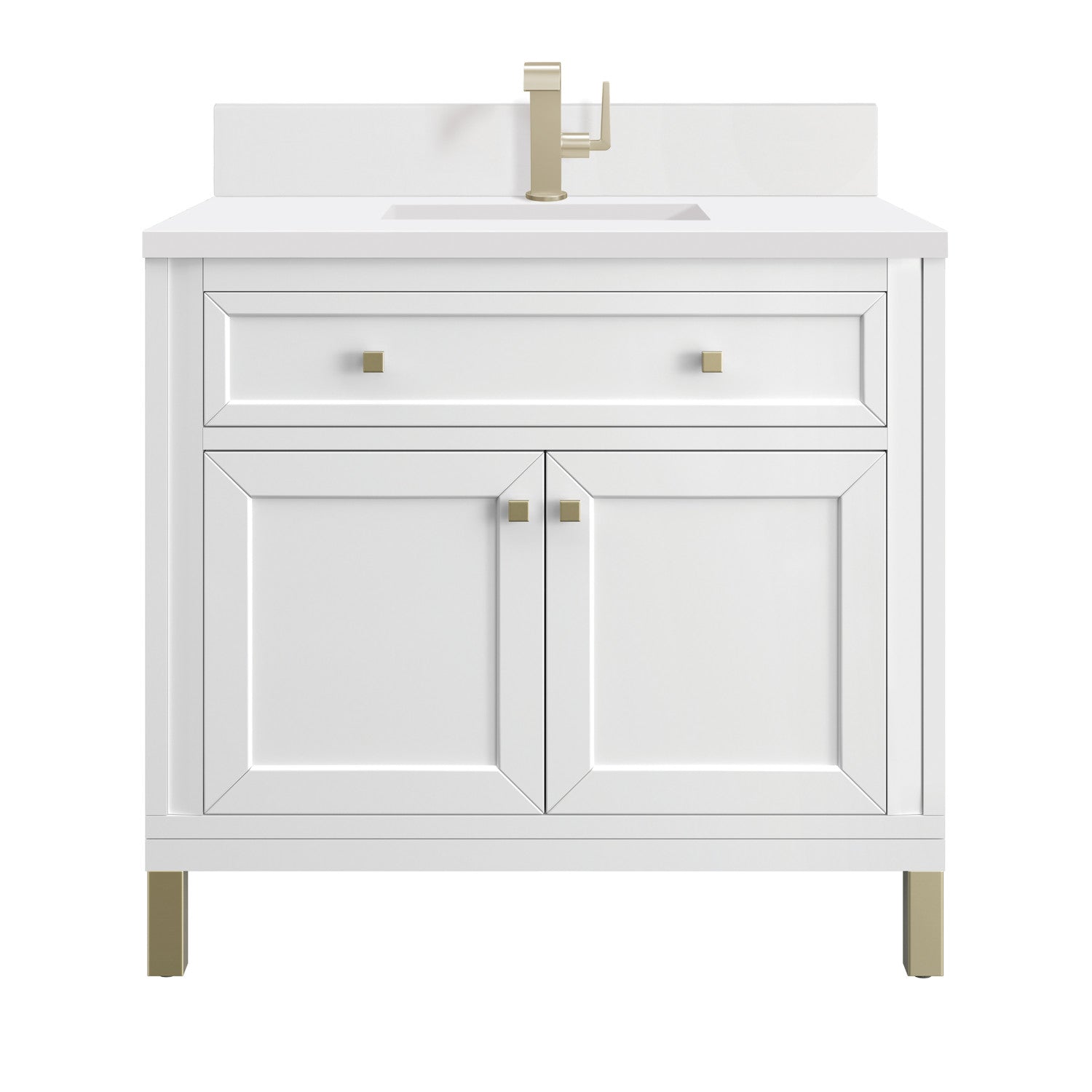 The sophisticated details and clean lines of the Chicago 36" Single Vanity by James Martin Vanities make it the perfect choice for any bathroom. Featuring a Glossy White, Smokey Celadon, or Walnut Whisper finish. This vanity offers ample storage with its two-door cabinet, adjustable interior shelf, and top-row tip-out drawer. Champagne Brass knobs and legs (in Glossy White, Smokey Celadon) or Satin Nickel knobs and legs (Walnut Whisper Only), or choose to forego the metal legs for a modern wall-mounted installation. Complete the look with one of our 3 cm tops.