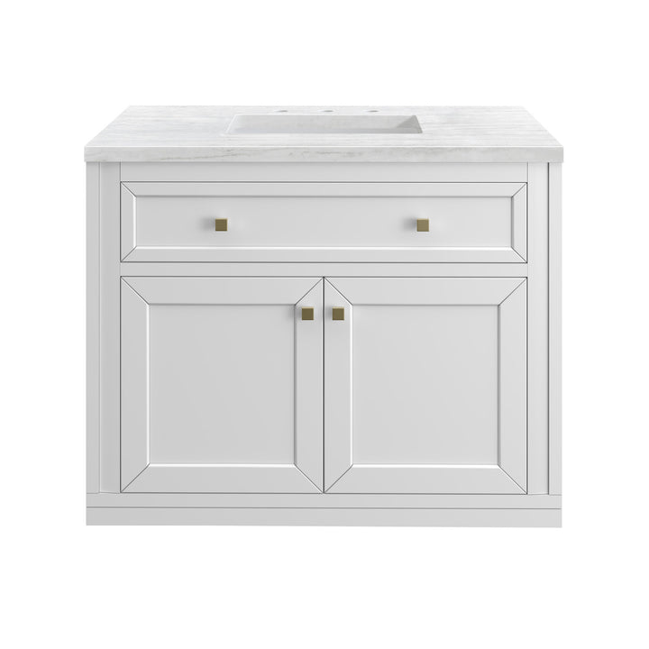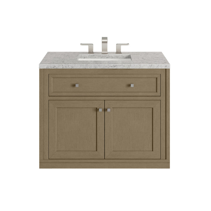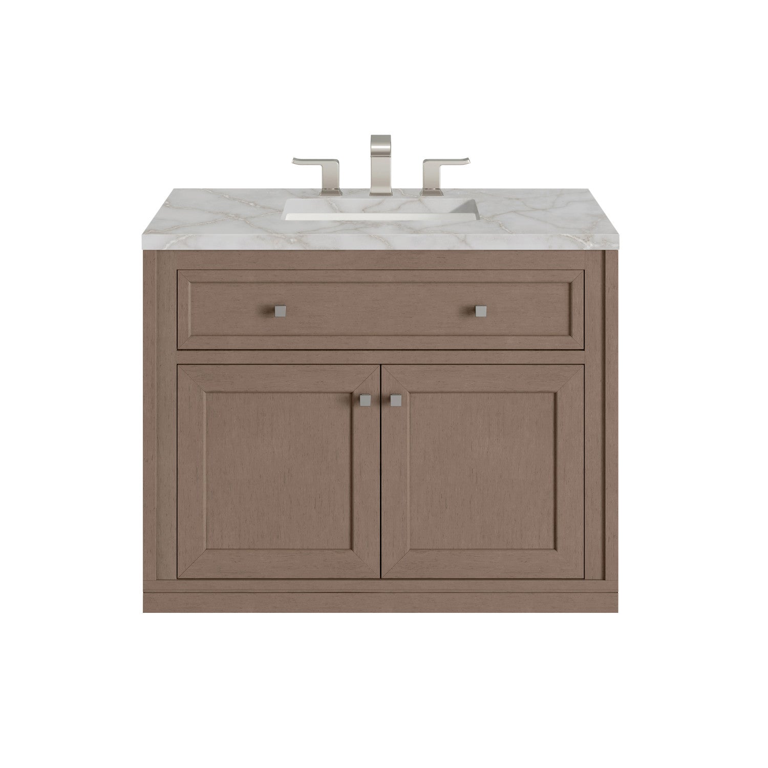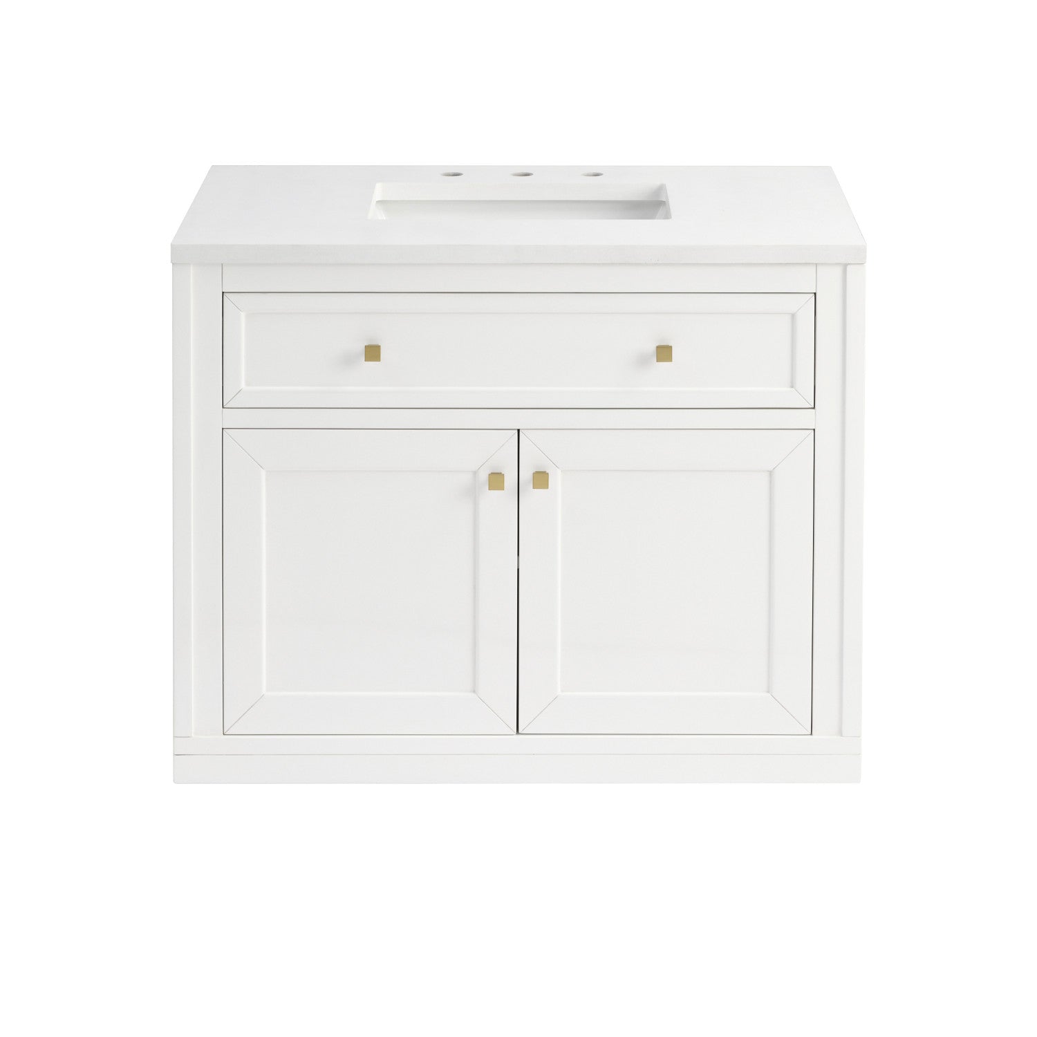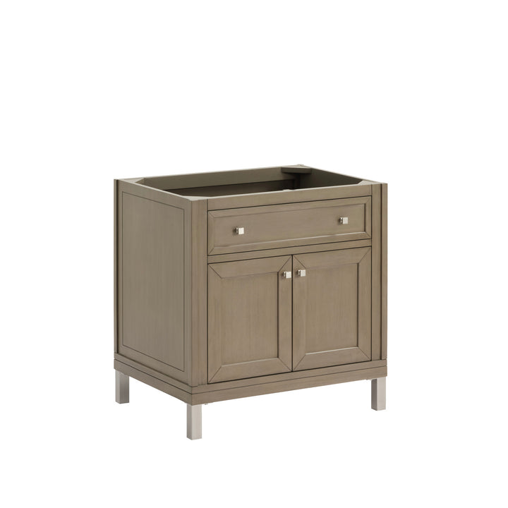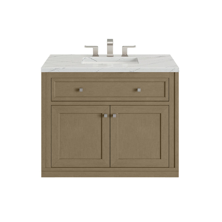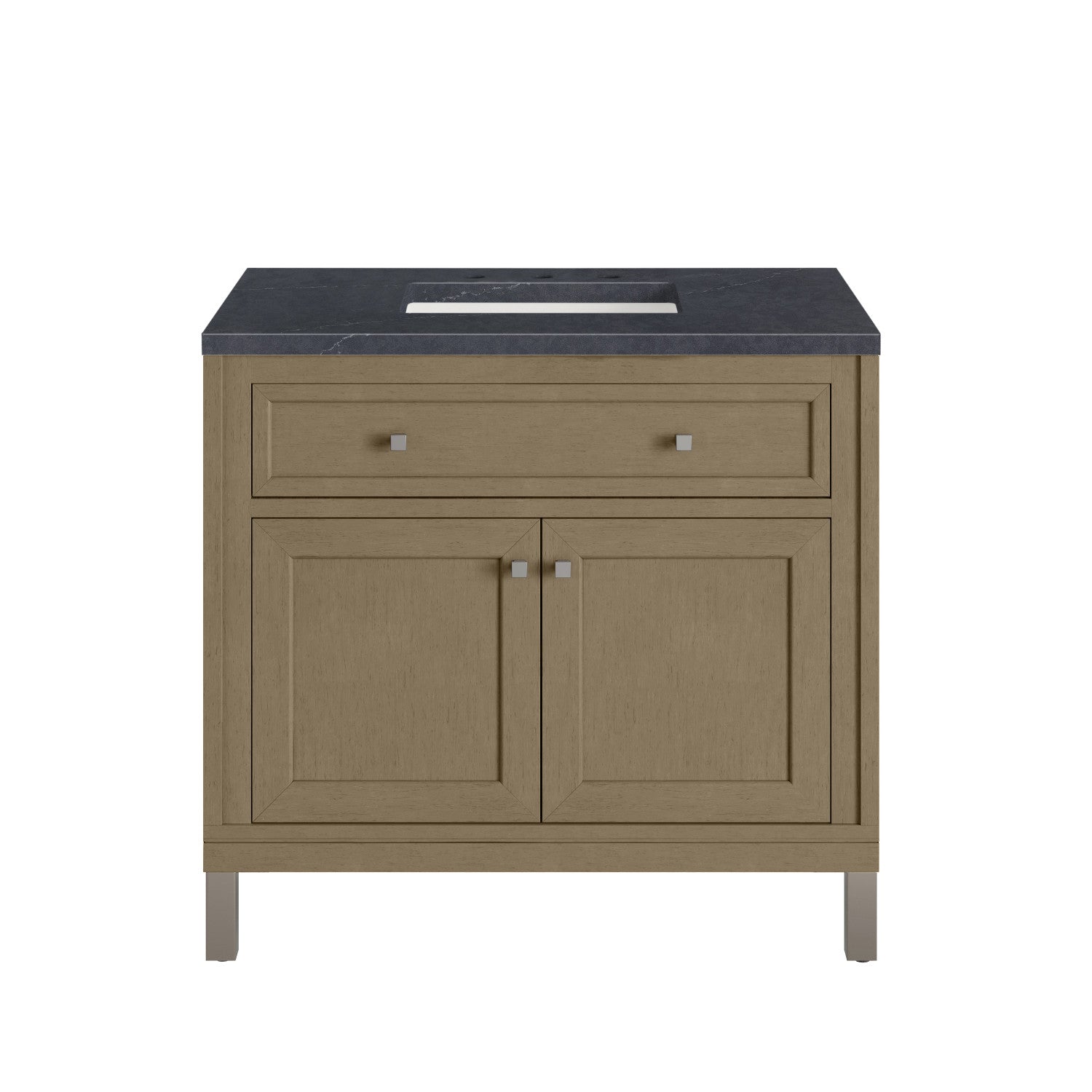 The sophisticated details and clean lines of the Chicago 36" Single Vanity by James Martin Vanities make it the perfect choice for any bathroom. Featuring a Glossy White, Smokey Celadon, or Walnut Whisper finish. This vanity offers ample storage with its two-door cabinet, adjustable interior shelf, and top-row tip-out drawer. Champagne Brass knobs and legs (in Glossy White, Smokey Celadon) or Satin Nickel knobs and legs (Walnut Whisper Only), or choose to forego the metal legs for a modern wall-mounted installation. Complete the look with one of our 3 cm tops.