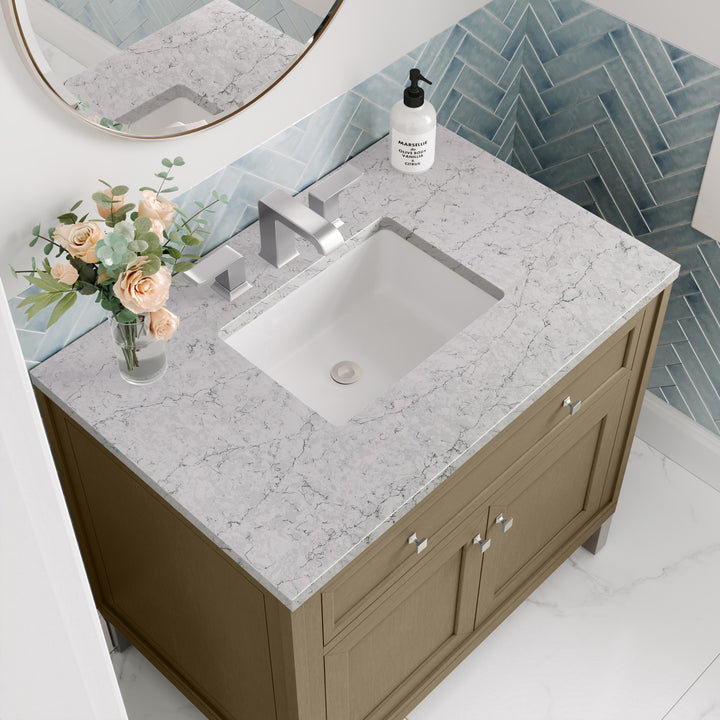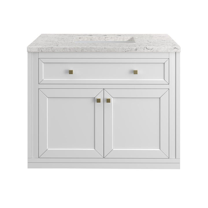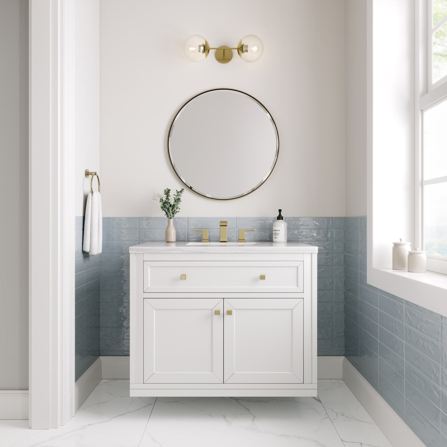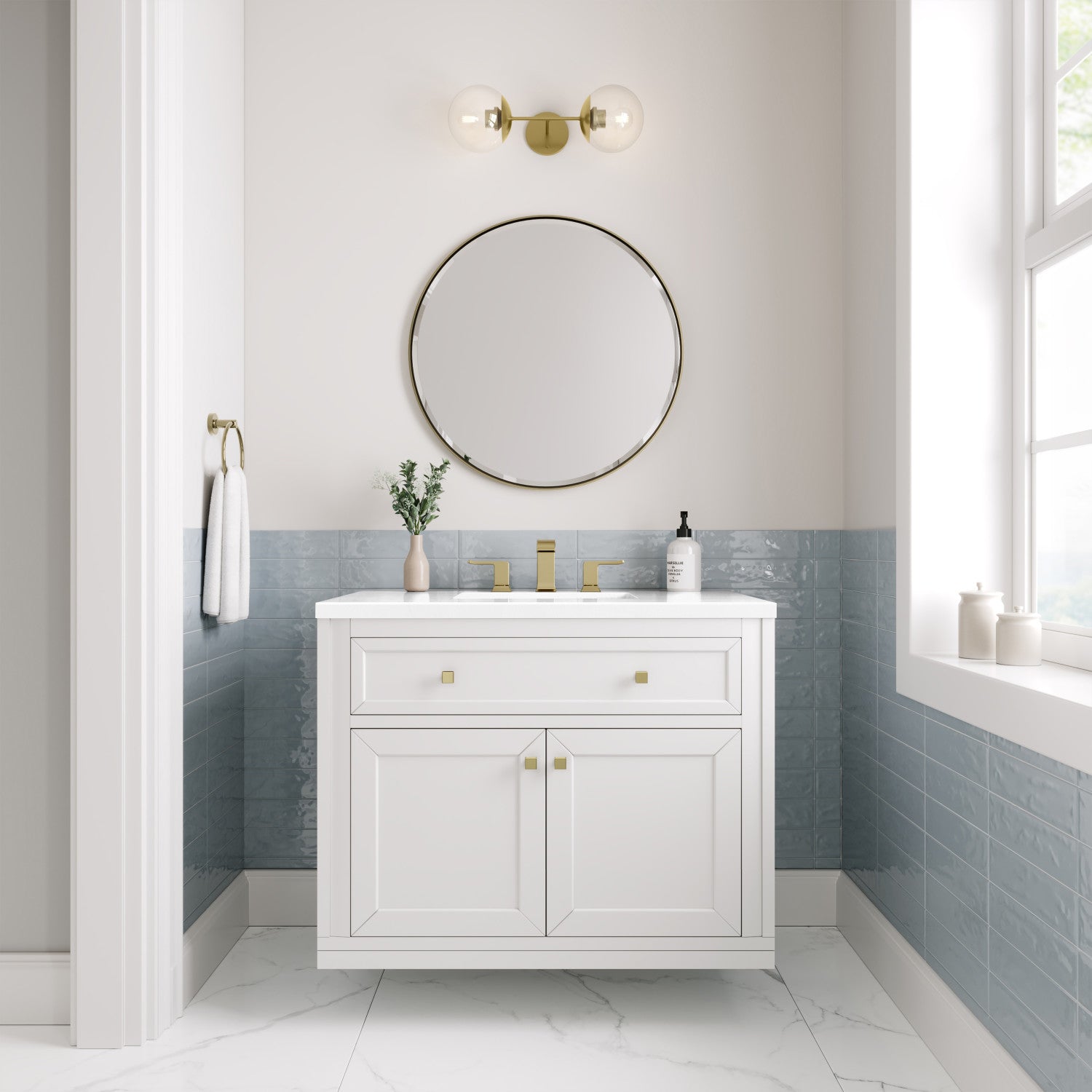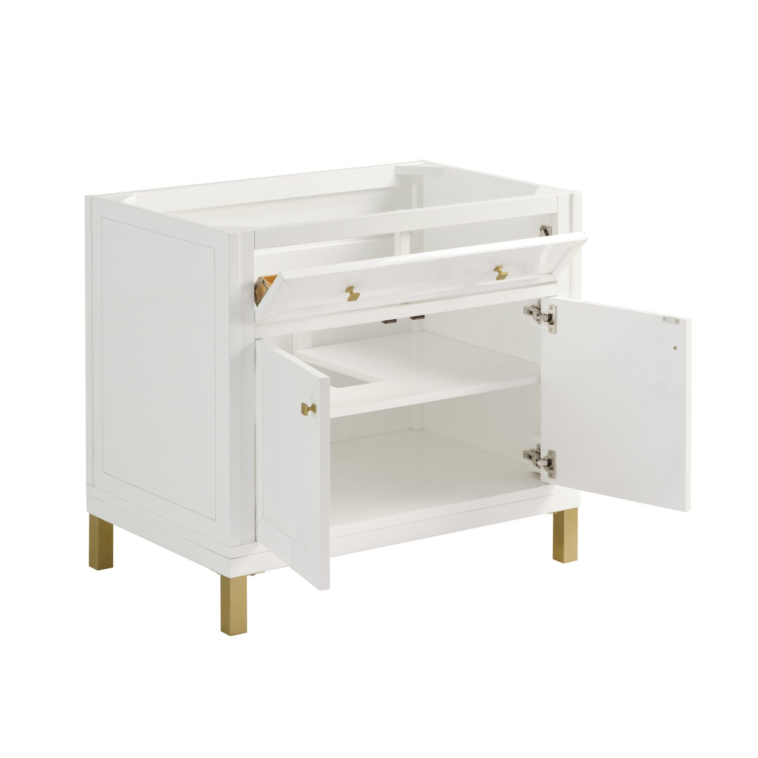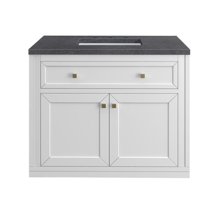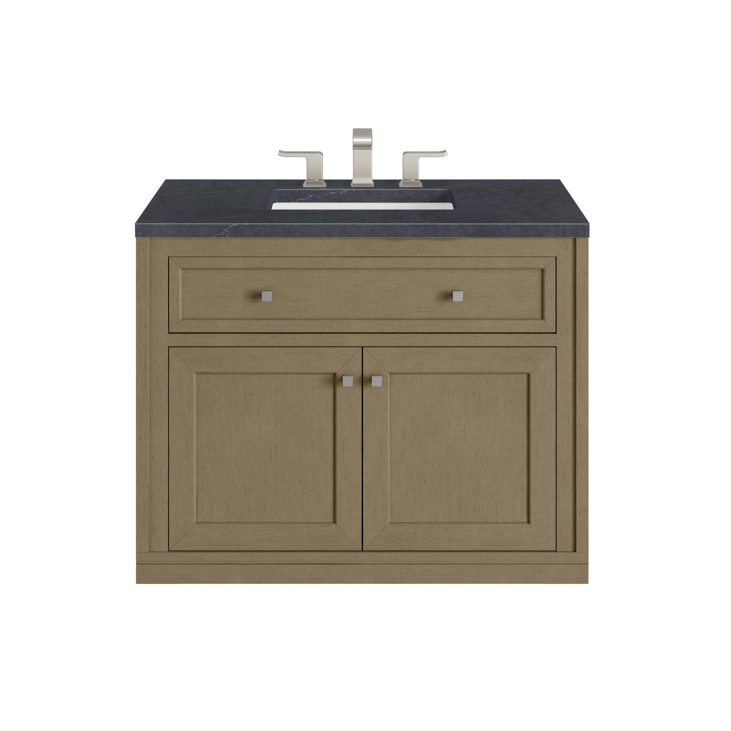 The sophisticated details and clean lines of the Chicago 36" Single Vanity by James Martin Vanities make it the perfect choice for any bathroom. Featuring a Glossy White, Smokey Celadon, or Walnut Whisper finish. This vanity offers ample storage with its two-door cabinet, adjustable interior shelf, and top-row tip-out drawer. Champagne Brass knobs and legs (in Glossy White, Smokey Celadon) or Satin Nickel knobs and legs (Walnut Whisper Only), or choose to forego the metal legs for a modern wall-mounted installation. Complete the look with one of our 3 cm tops.