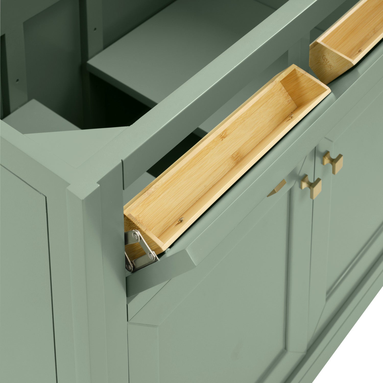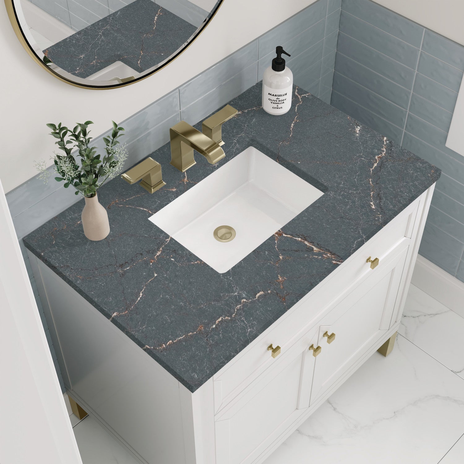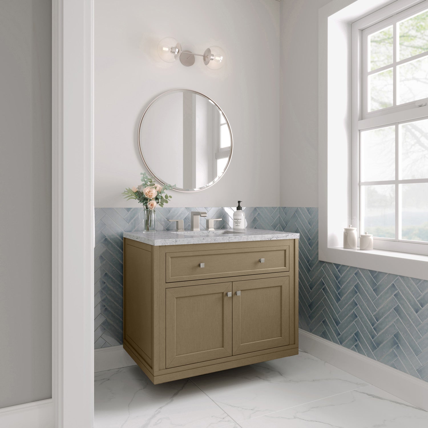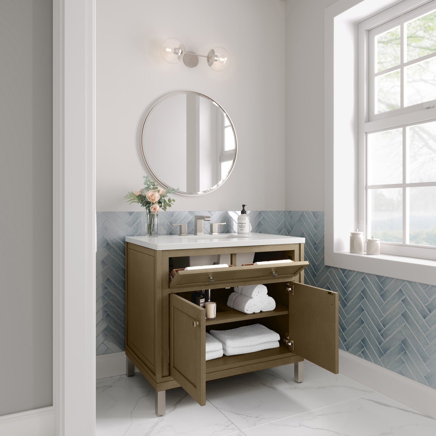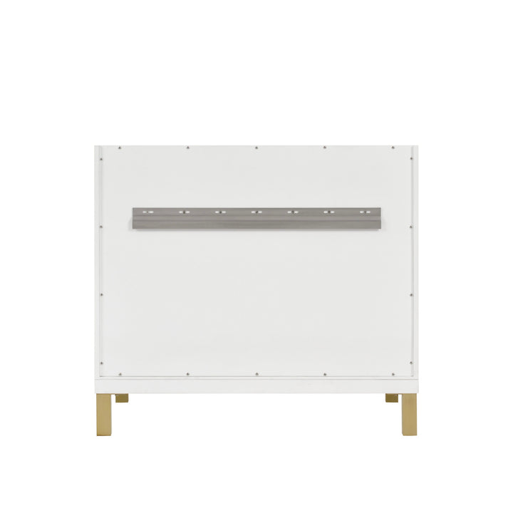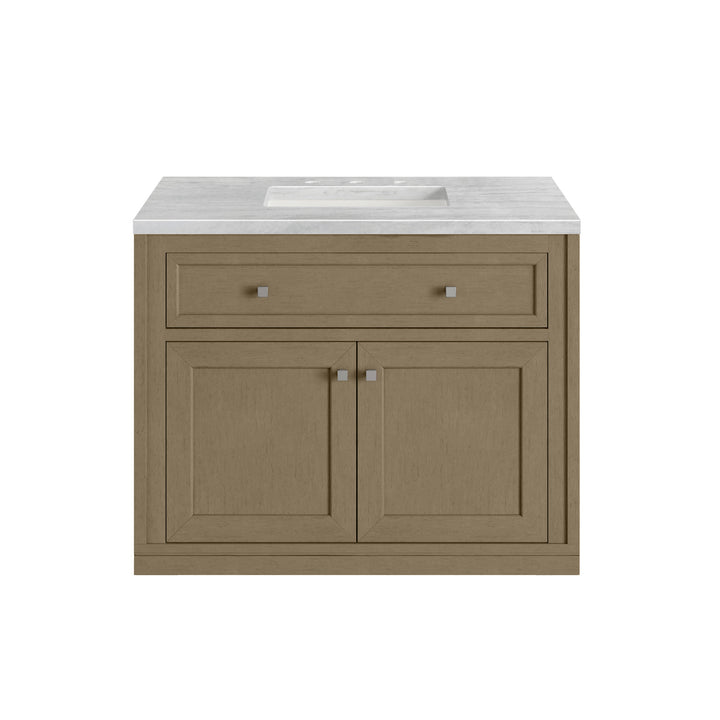 The sophisticated details and clean lines of the Chicago 36" Single Vanity by James Martin Vanities make it the perfect choice for any bathroom. Featuring a Glossy White, Smokey Celadon, or Walnut Whisper finish. This vanity offers ample storage with its two-door cabinet, adjustable interior shelf, and top-row tip-out drawer. Champagne Brass knobs and legs (in Glossy White, Smokey Celadon) or Satin Nickel knobs and legs (Walnut Whisper Only), or choose to forego the metal legs for a modern wall-mounted installation. Complete the look with one of our 3 cm tops.