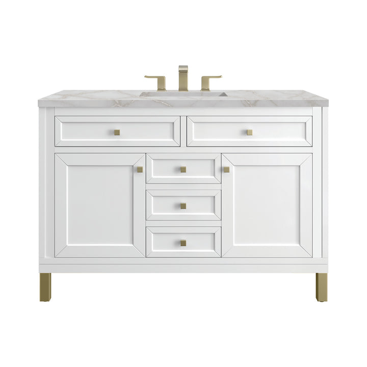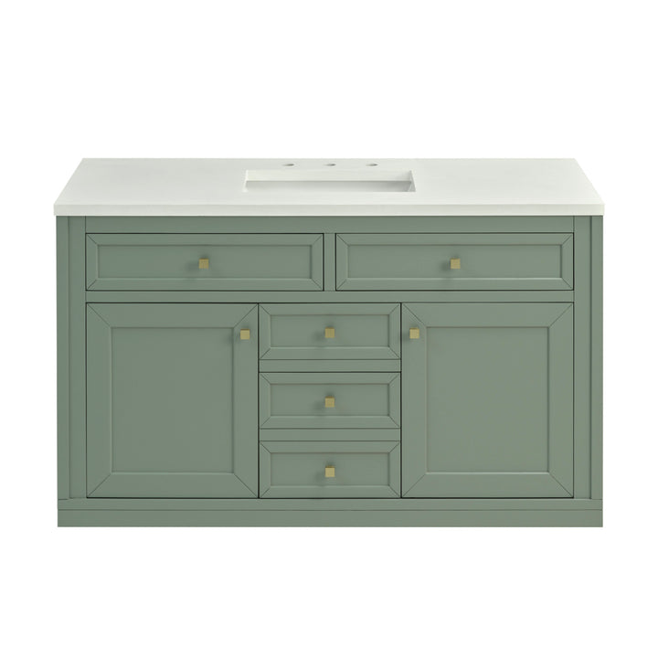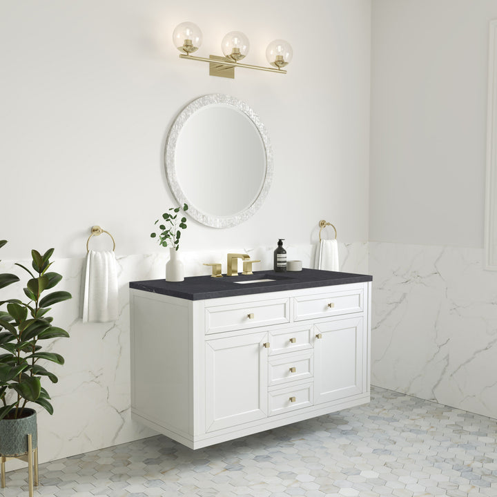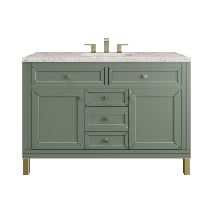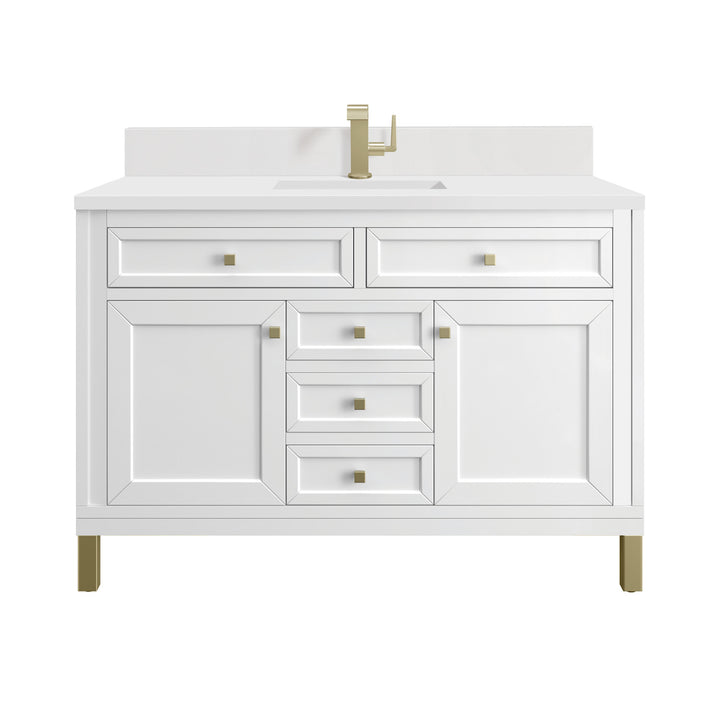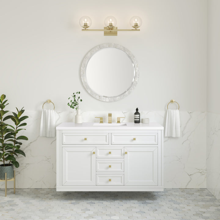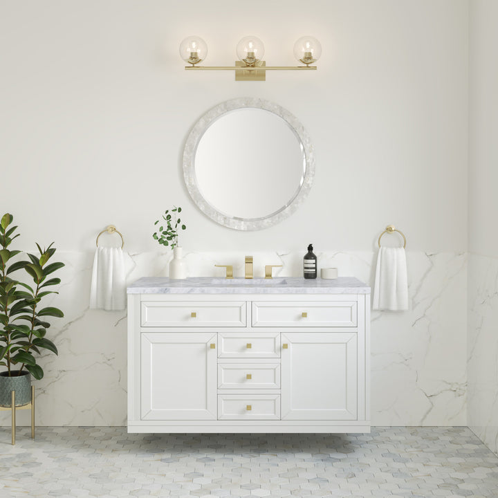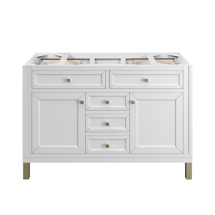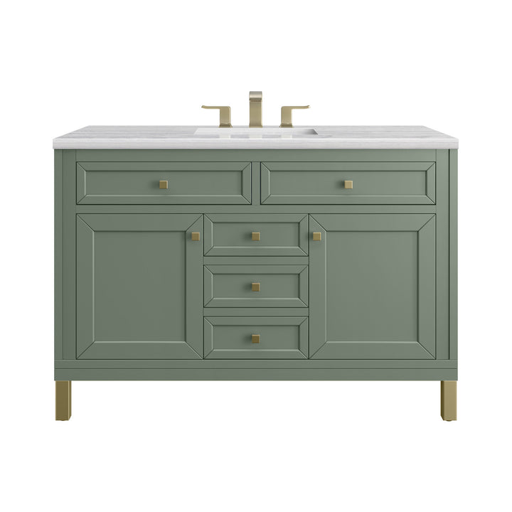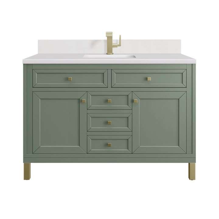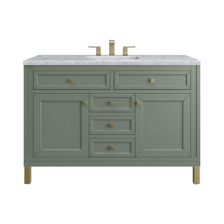 The sophisticated details and clean lines of the Chicago 48" Single Vanity by James Martin Vanities make it the perfect choice for any bathroom. Featuring a Glossy White, Smokey Celadon, or Walnut Whisper finish. This vanity offers ample storage with its two-door cabinet, adjustable interior shelf, and top-row tip-out drawer. Champagne Brass knobs and legs (in Glossy White, Smokey Celadon) or Satin Nickel knobs and legs (Walnut Whisper Only), or choose to forego the metal legs for a modern wall-mounted installation. Complete the look with one of our 3 cm tops.