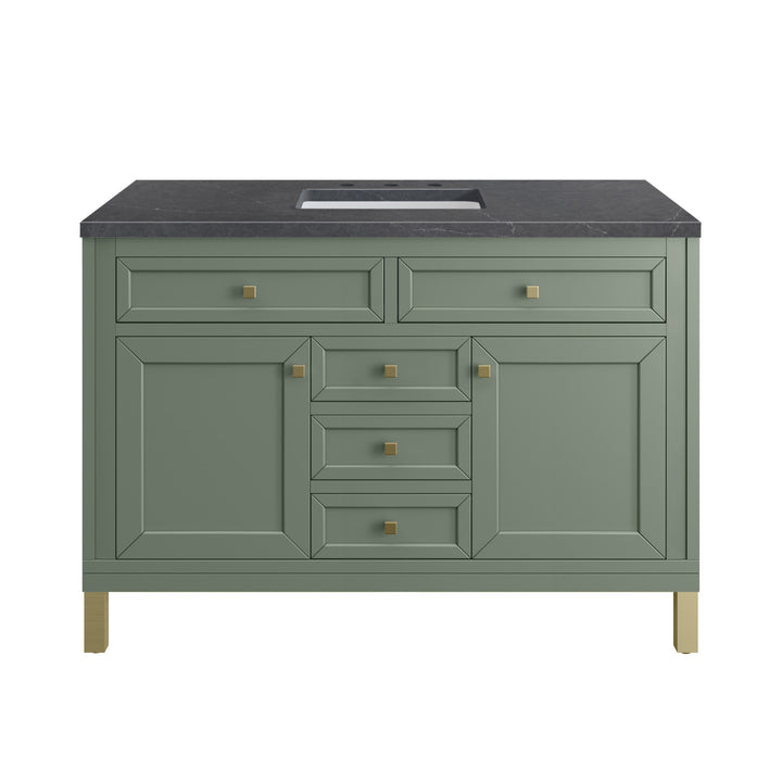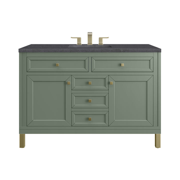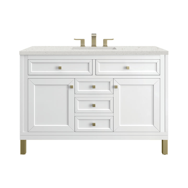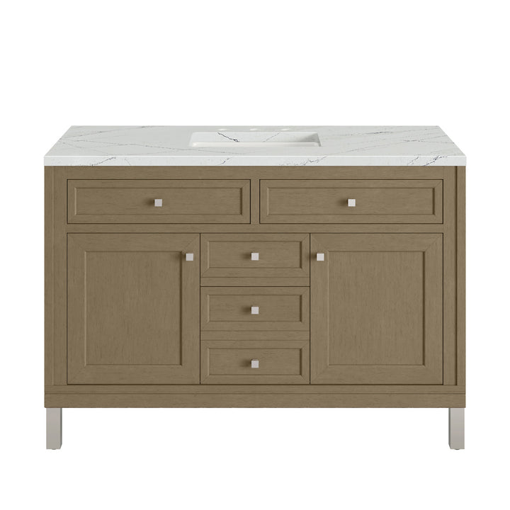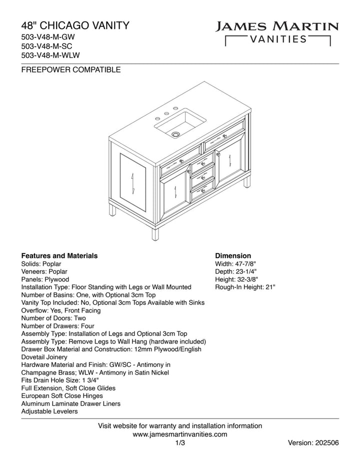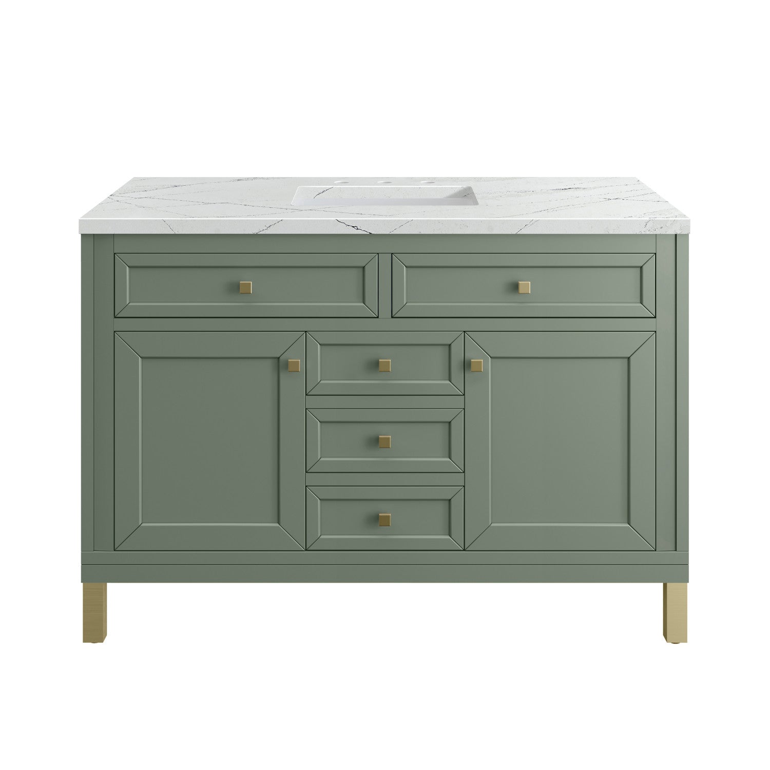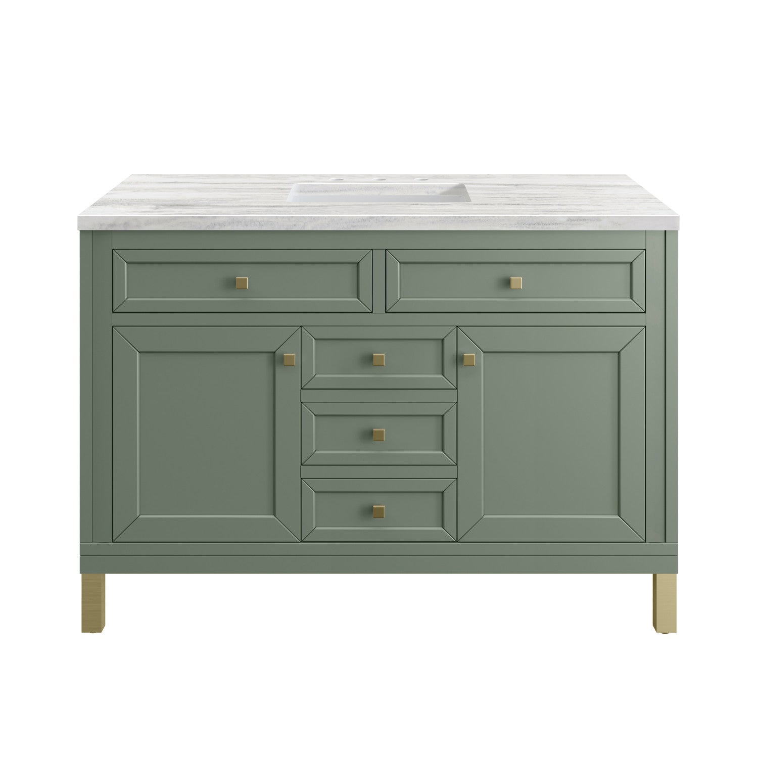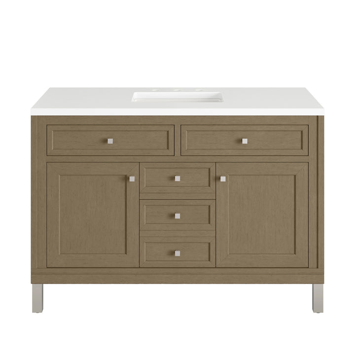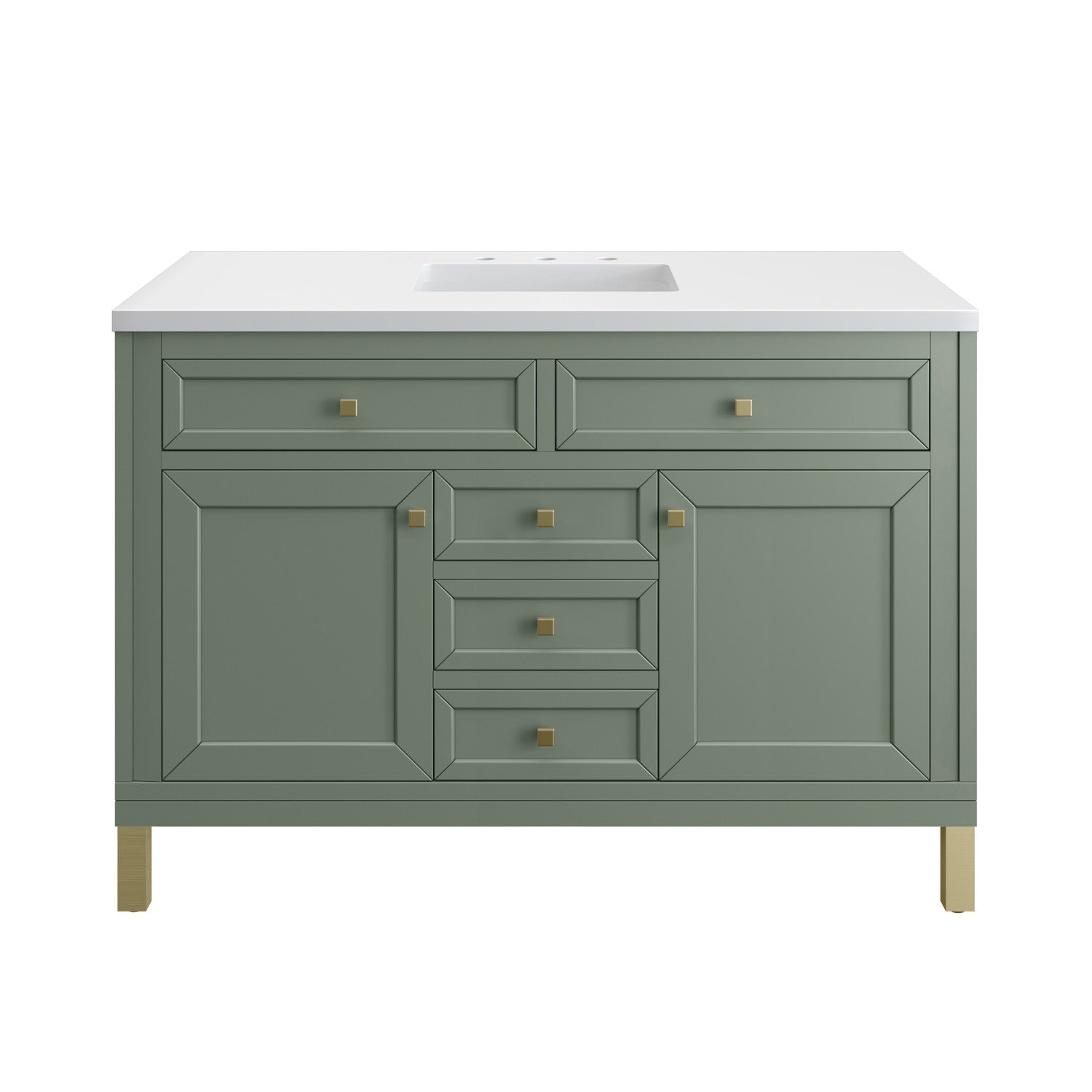 The sophisticated details and clean lines of the Chicago 48" Single Vanity by James Martin Vanities make it the perfect choice for any bathroom. Featuring a Glossy White, Smokey Celadon, or Walnut Whisper finish. This vanity offers ample storage with its two-door cabinet, adjustable interior shelf, and top-row tip-out drawer. Champagne Brass knobs and legs (in Glossy White, Smokey Celadon) or Satin Nickel knobs and legs (Walnut Whisper Only), or choose to forego the metal legs for a modern wall-mounted installation. Complete the look with one of our 3 cm tops.