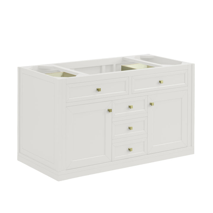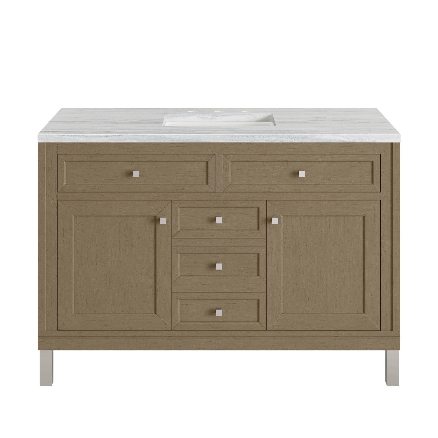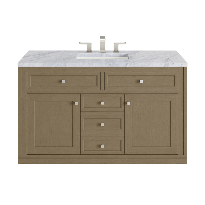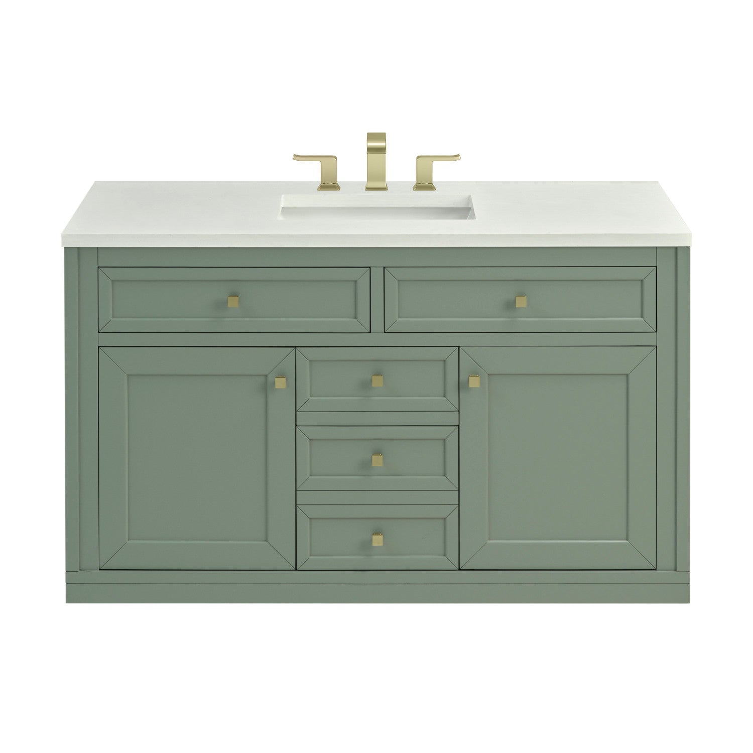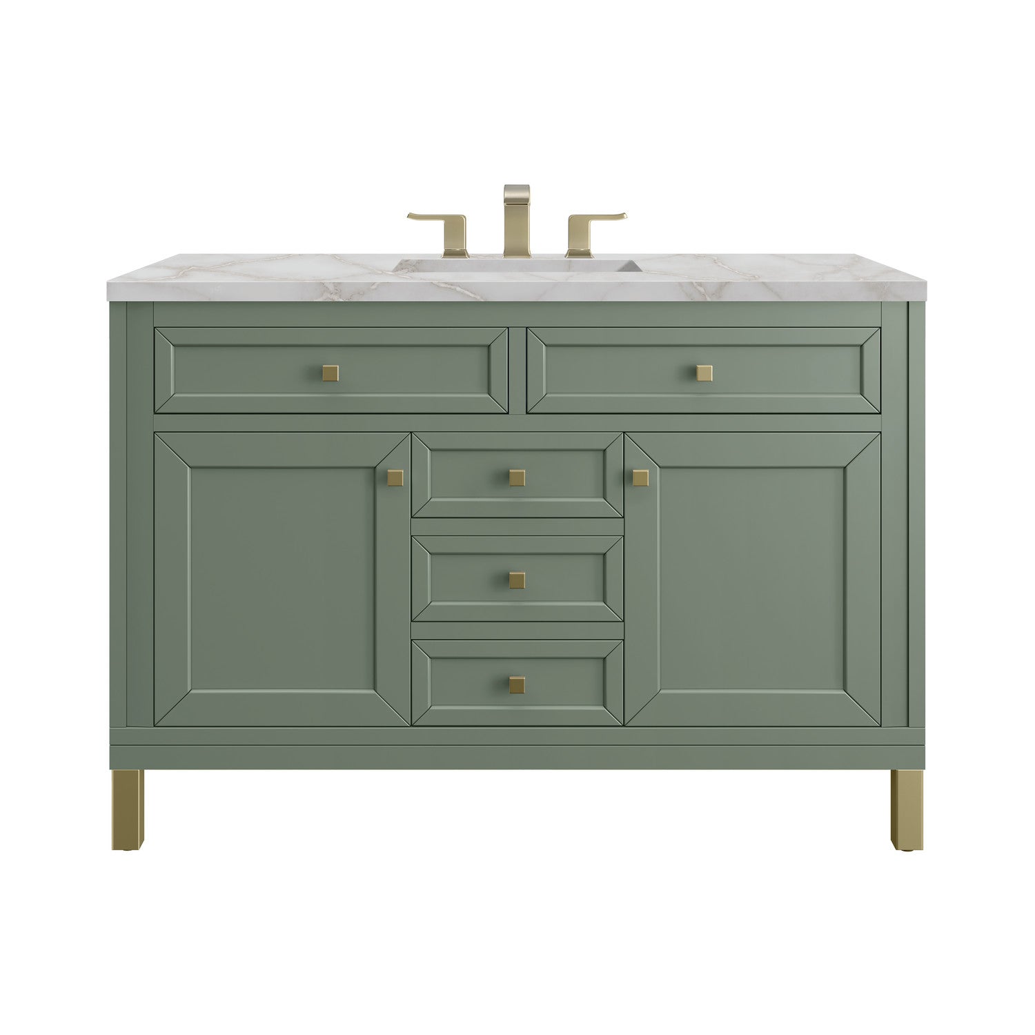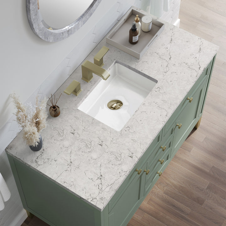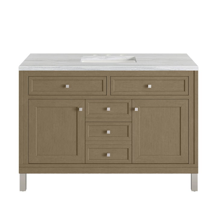 The sophisticated details and clean lines of the Chicago 48" Single Vanity by James Martin Vanities make it the perfect choice for any bathroom. Featuring a Glossy White, Smokey Celadon, or Walnut Whisper finish. This vanity offers ample storage with its two-door cabinet, adjustable interior shelf, and top-row tip-out drawer. Champagne Brass knobs and legs (in Glossy White, Smokey Celadon) or Satin Nickel knobs and legs (Walnut Whisper Only), or choose to forego the metal legs for a modern wall-mounted installation. Complete the look with one of our 3 cm tops.