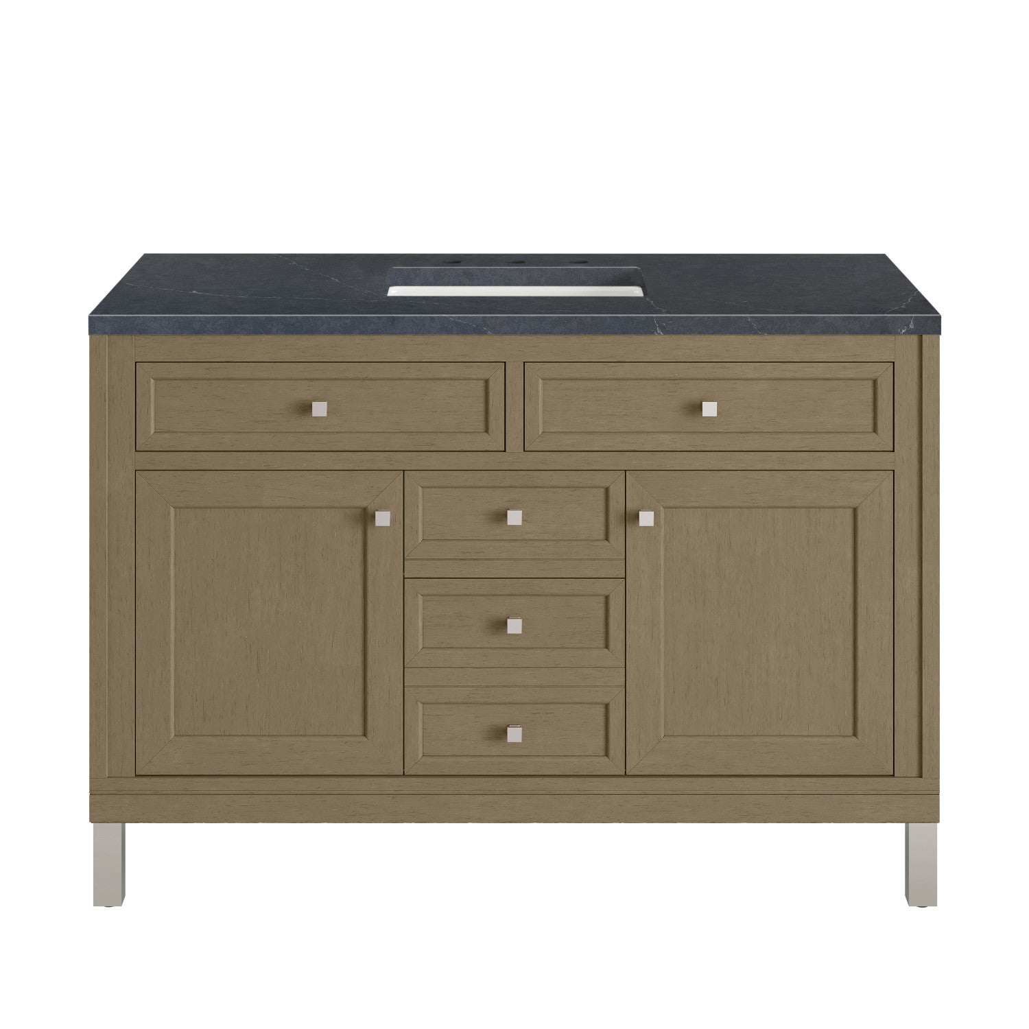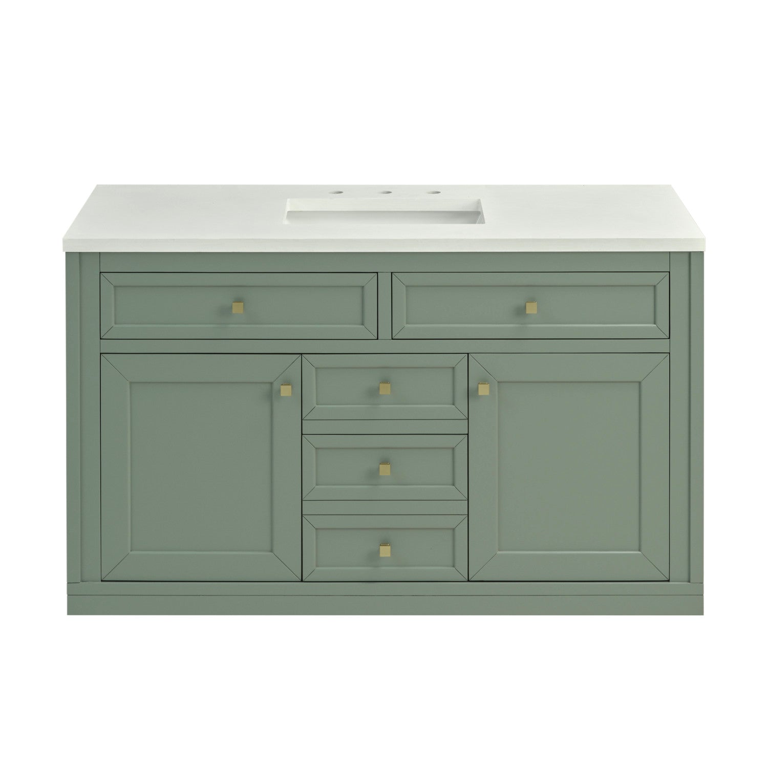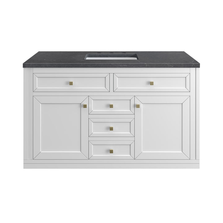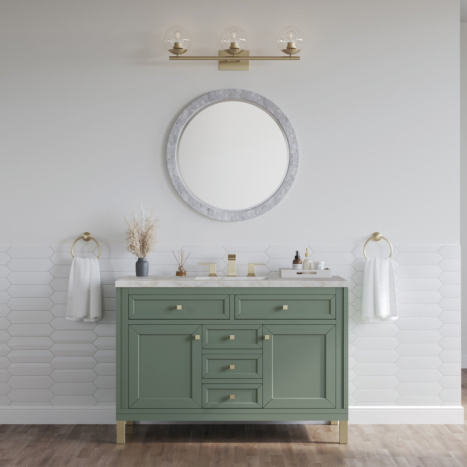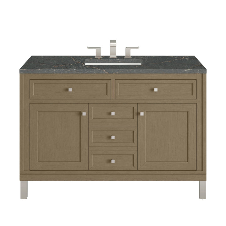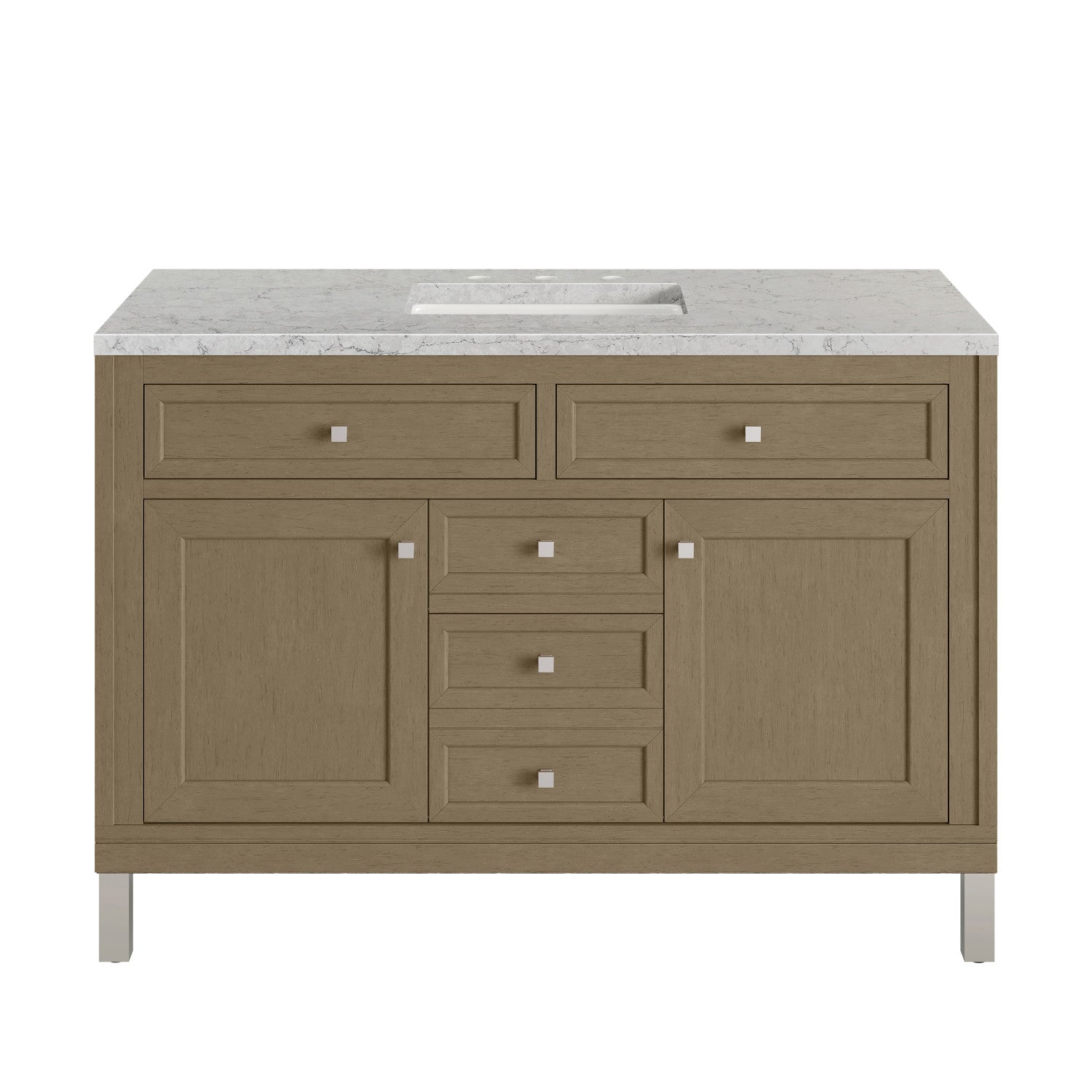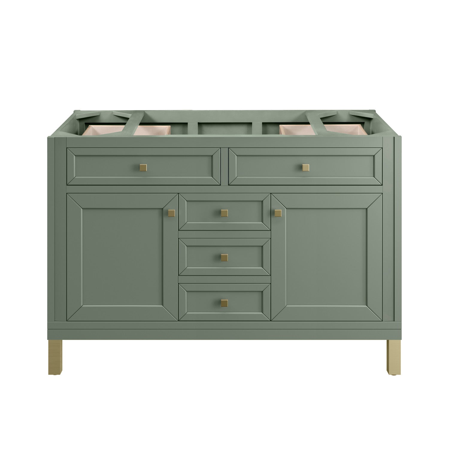 The sophisticated details and clean lines of the Chicago 48" Single Vanity by James Martin Vanities make it the perfect choice for any bathroom. Featuring a Glossy White, Smokey Celadon, or Walnut Whisper finish. This vanity offers ample storage with its two-door cabinet, adjustable interior shelf, and top-row tip-out drawer. Champagne Brass knobs and legs (in Glossy White, Smokey Celadon) or Satin Nickel knobs and legs (Walnut Whisper Only), or choose to forego the metal legs for a modern wall-mounted installation. Complete the look with one of our 3 cm tops.