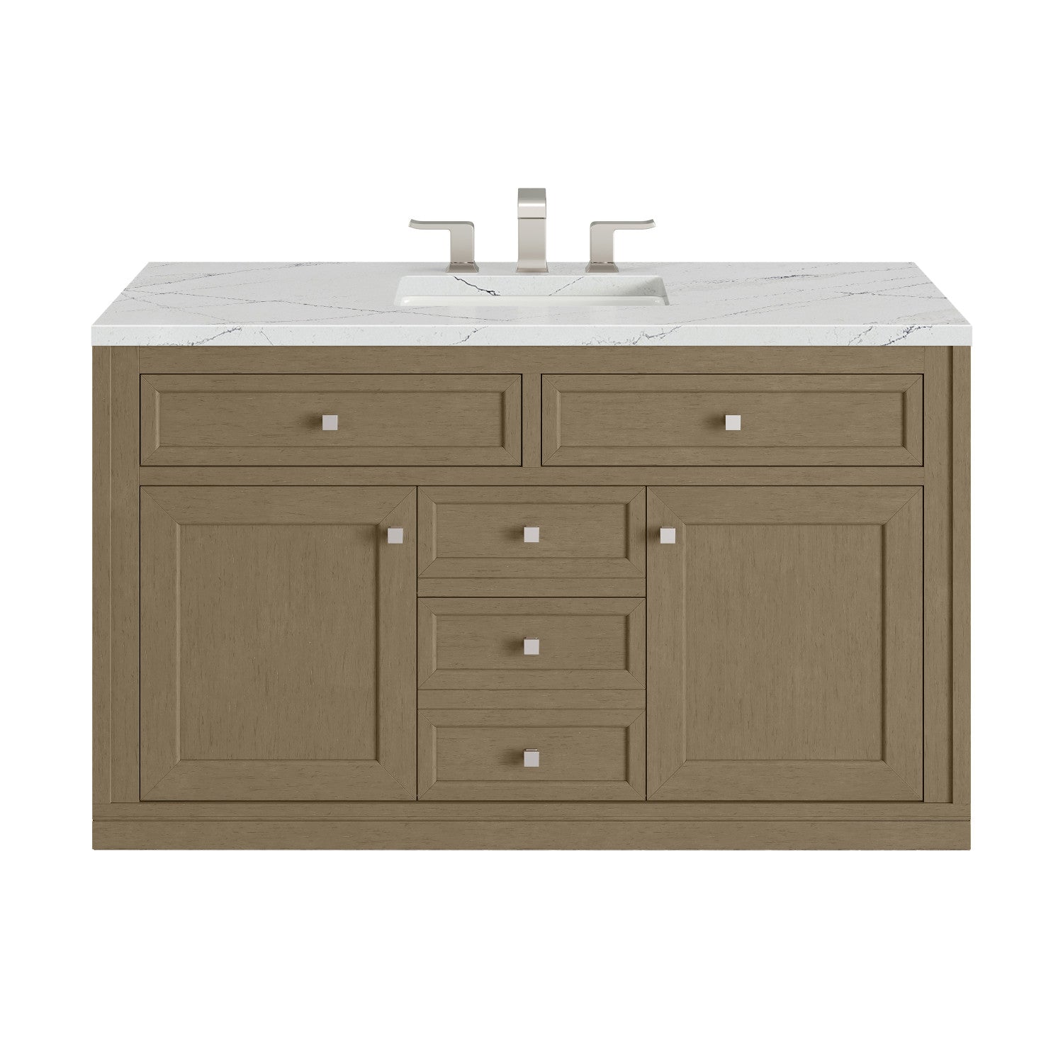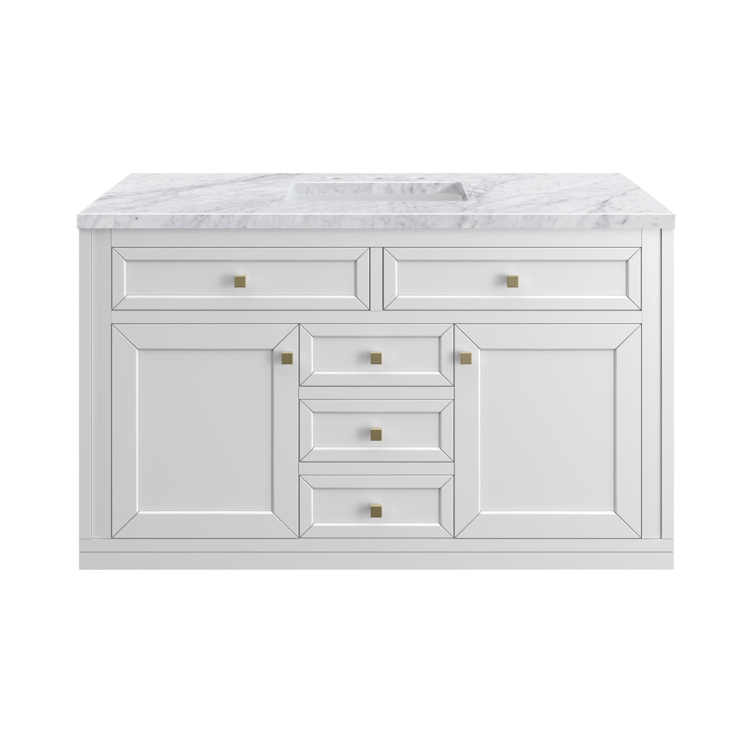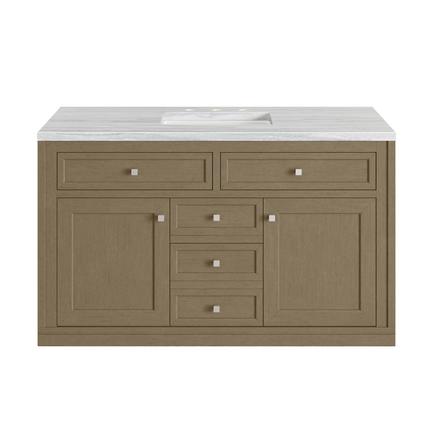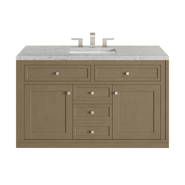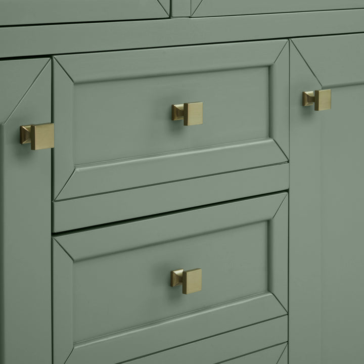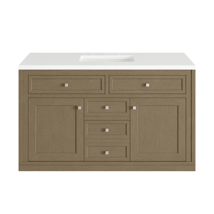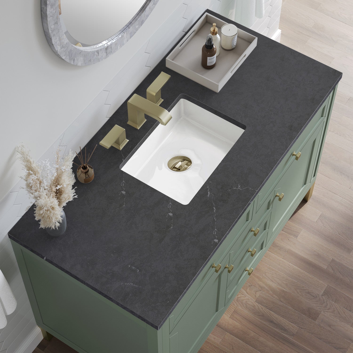 The sophisticated details and clean lines of the Chicago 48" Single Vanity by James Martin Vanities make it the perfect choice for any bathroom. Featuring a Glossy White, Smokey Celadon, or Walnut Whisper finish. This vanity offers ample storage with its two-door cabinet, adjustable interior shelf, and top-row tip-out drawer. Champagne Brass knobs and legs (in Glossy White, Smokey Celadon) or Satin Nickel knobs and legs (Walnut Whisper Only), or choose to forego the metal legs for a modern wall-mounted installation. Complete the look with one of our 3 cm tops.