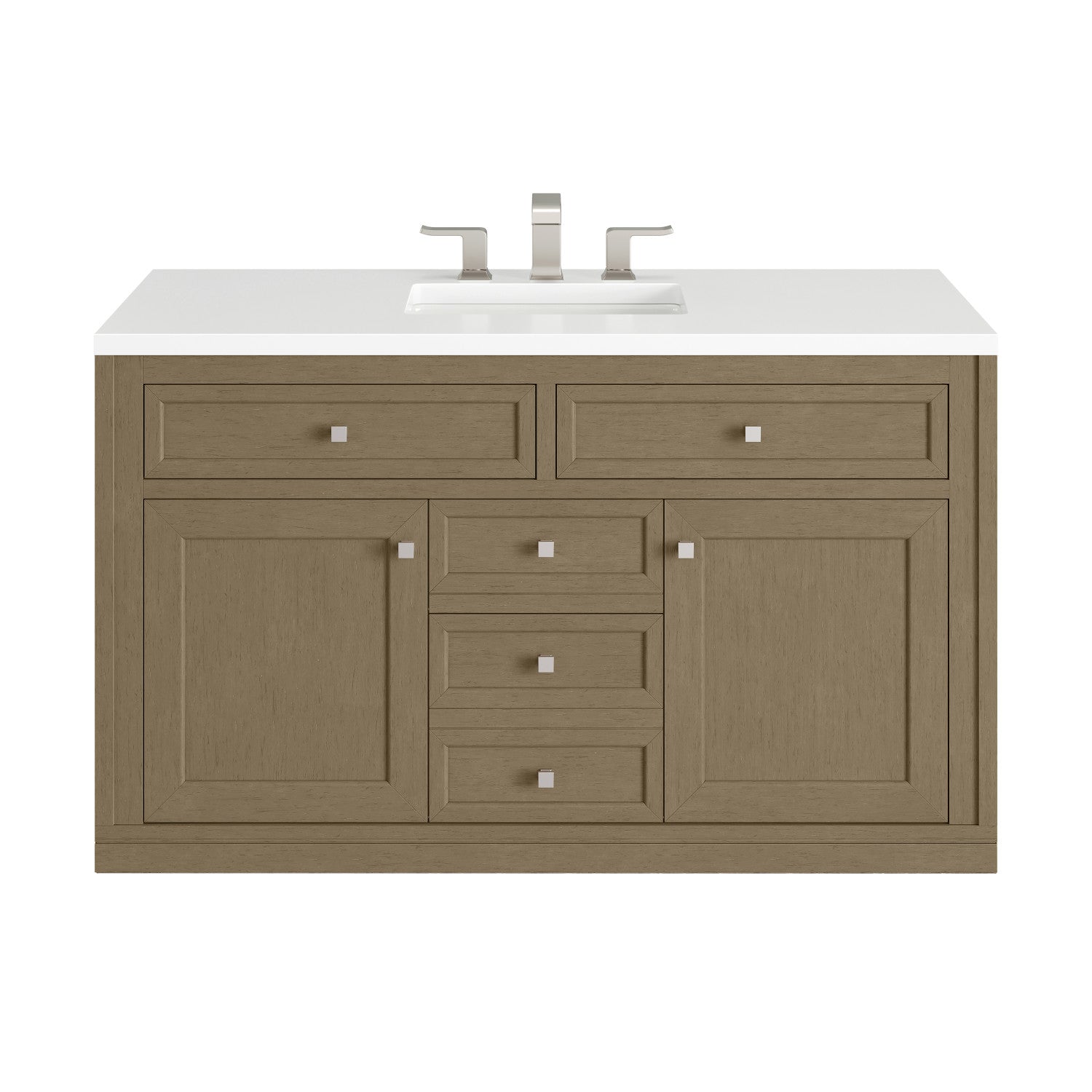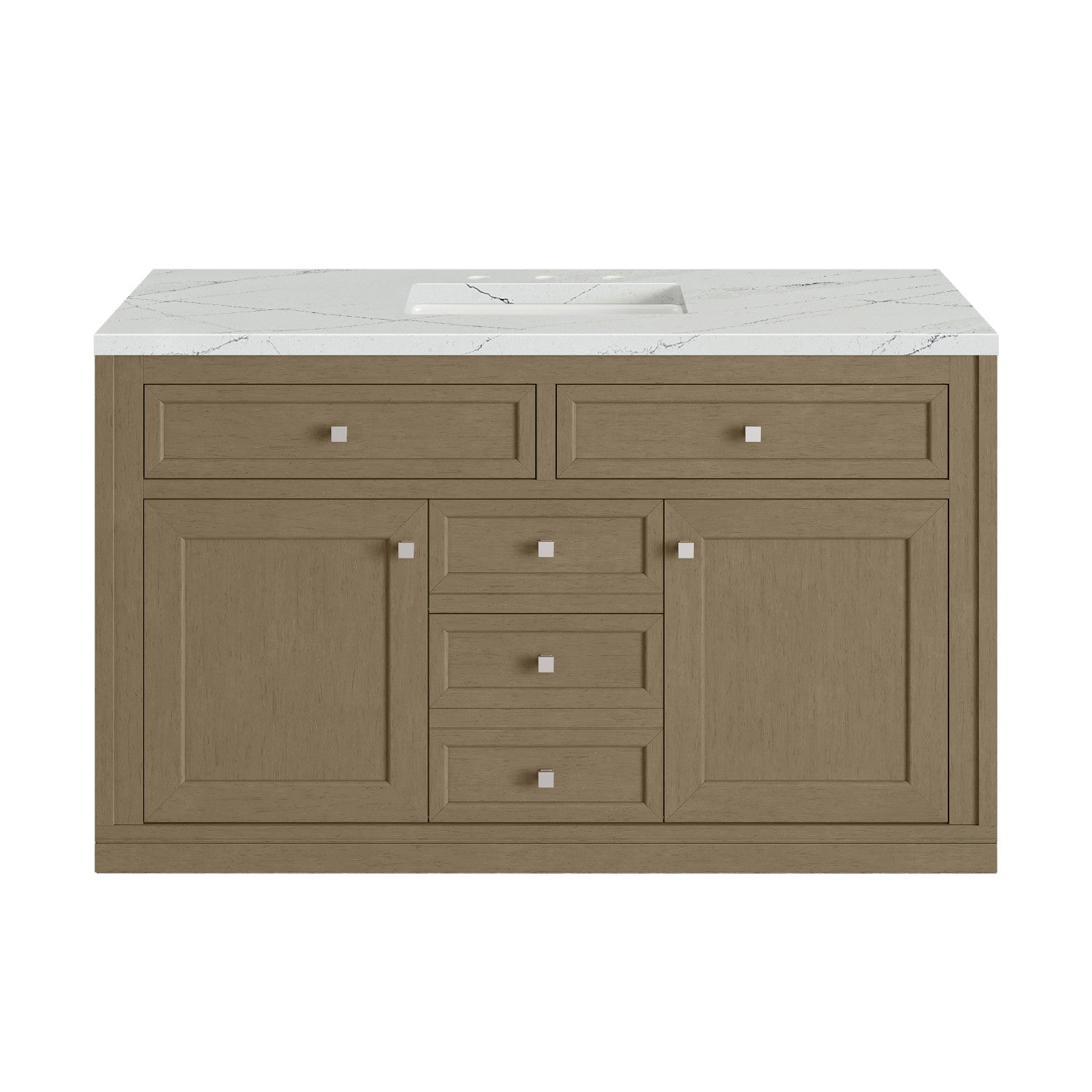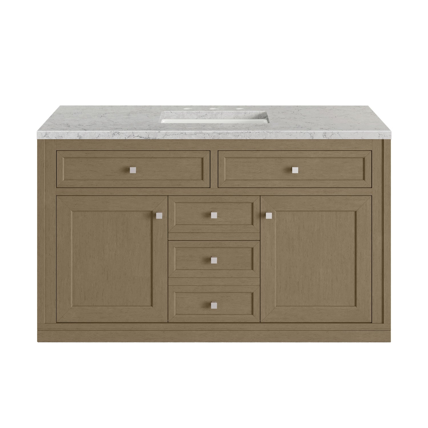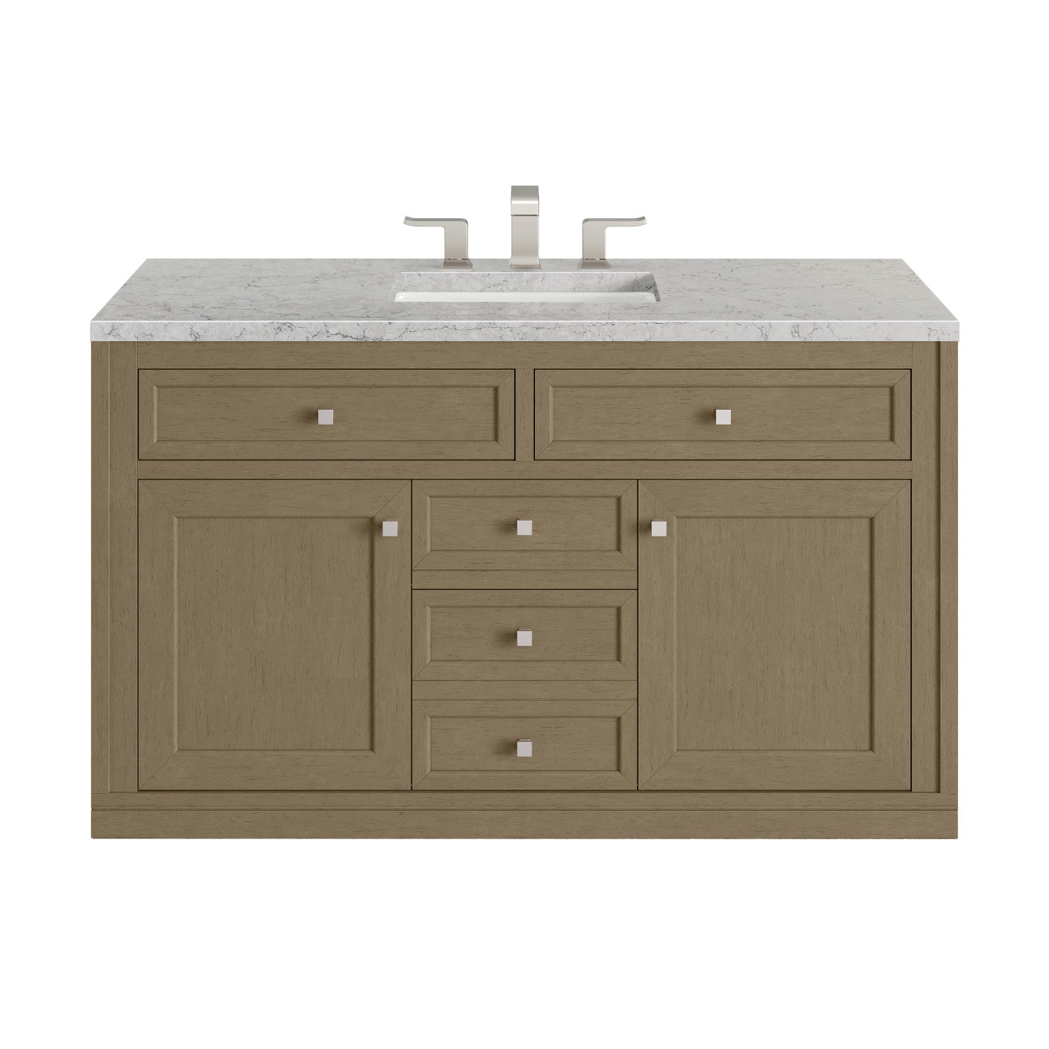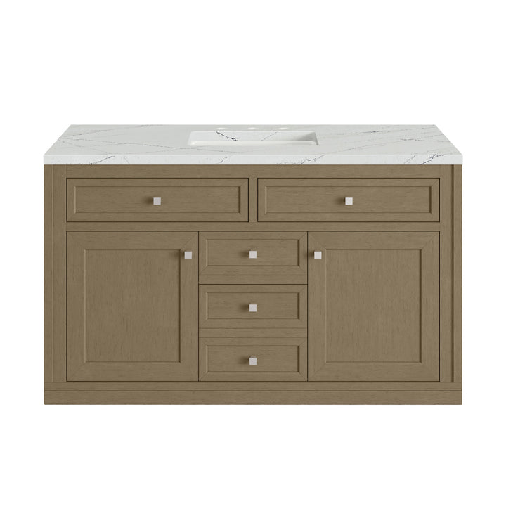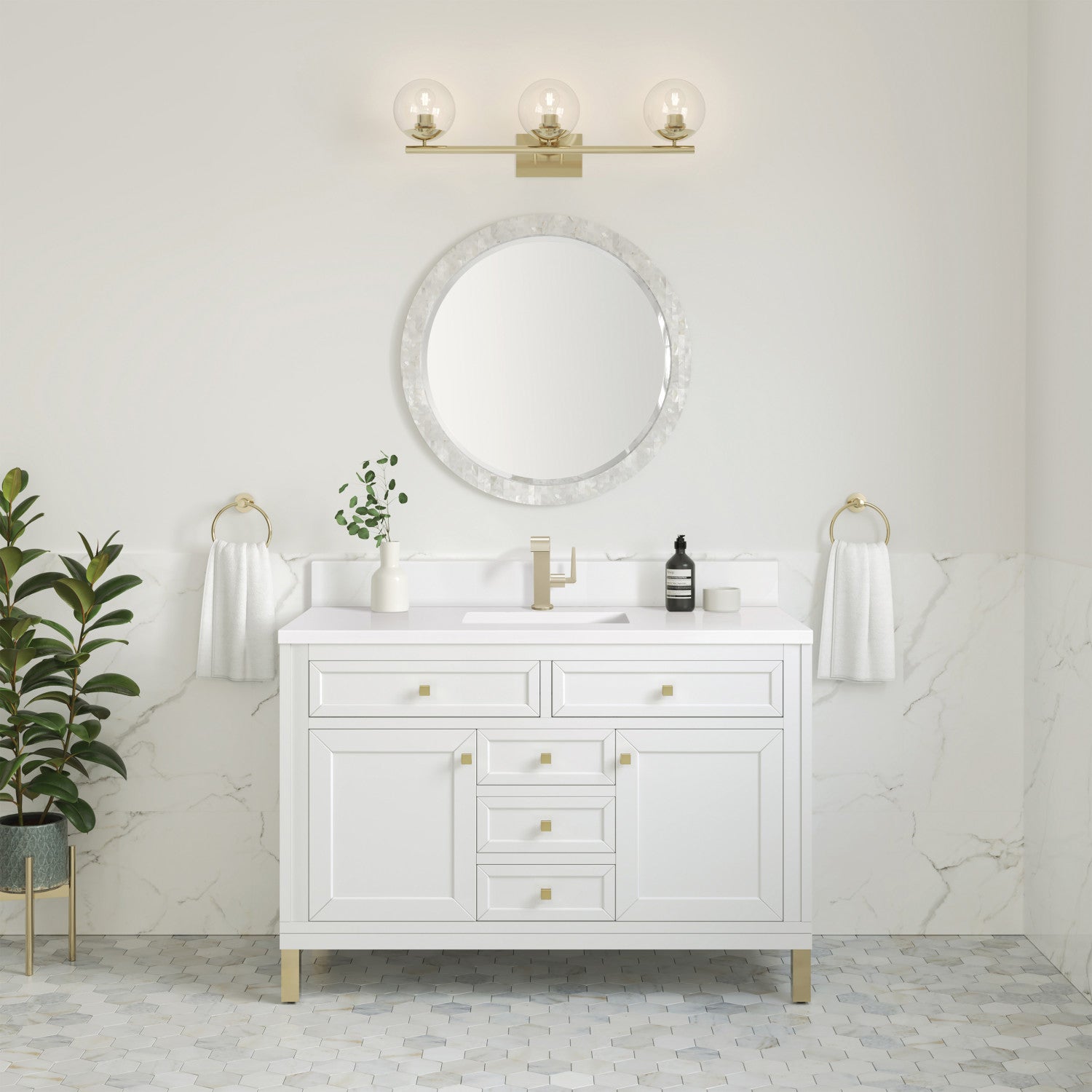 The sophisticated details and clean lines of the Chicago 48" Single Vanity by James Martin Vanities make it the perfect choice for any bathroom. Featuring a Glossy White, Smokey Celadon, or Walnut Whisper finish. This vanity offers ample storage with its two-door cabinet, adjustable interior shelf, and top-row tip-out drawer. Champagne Brass knobs and legs (in Glossy White, Smokey Celadon) or Satin Nickel knobs and legs (Walnut Whisper Only), or choose to forego the metal legs for a modern wall-mounted installation. Complete the look with one of our 3 cm tops.