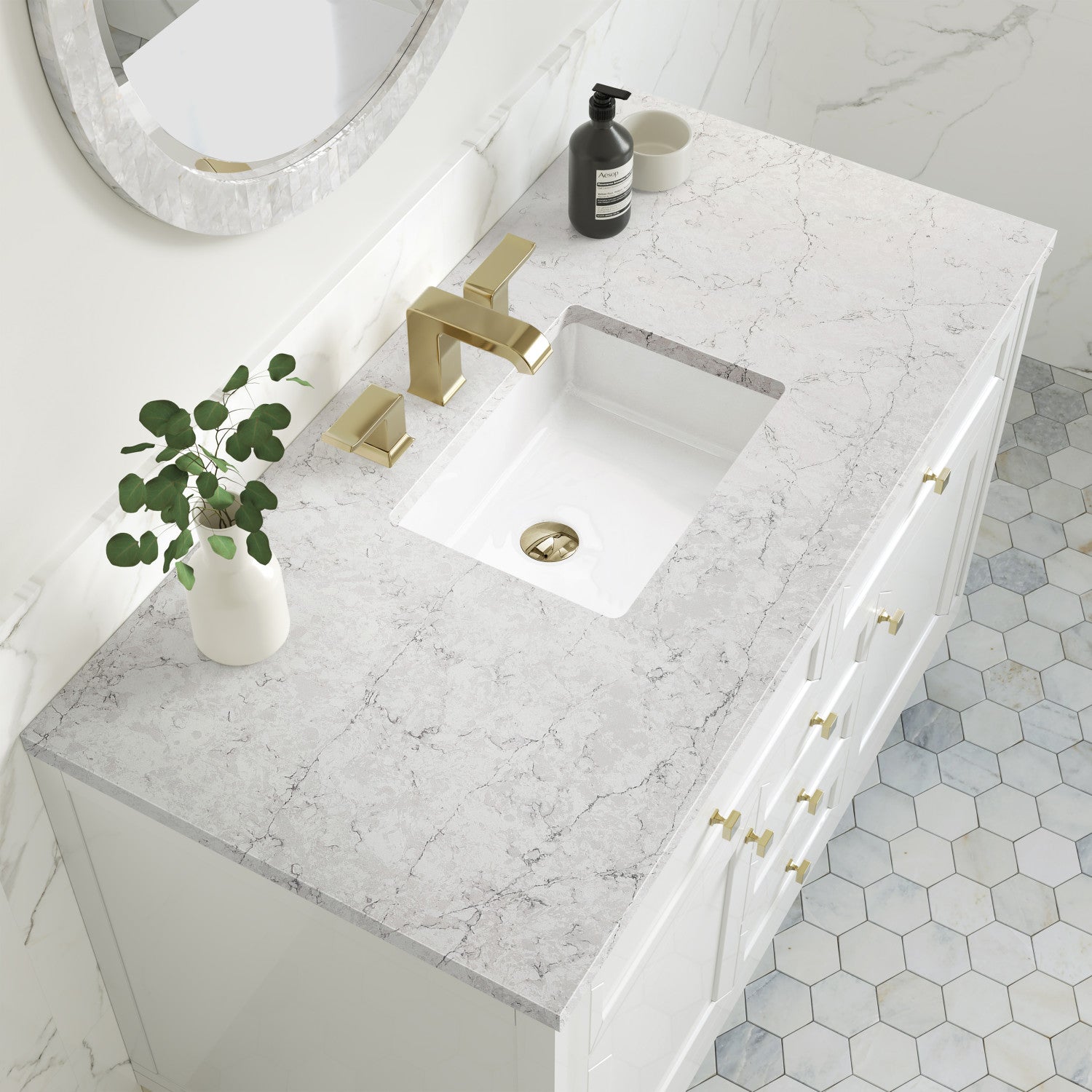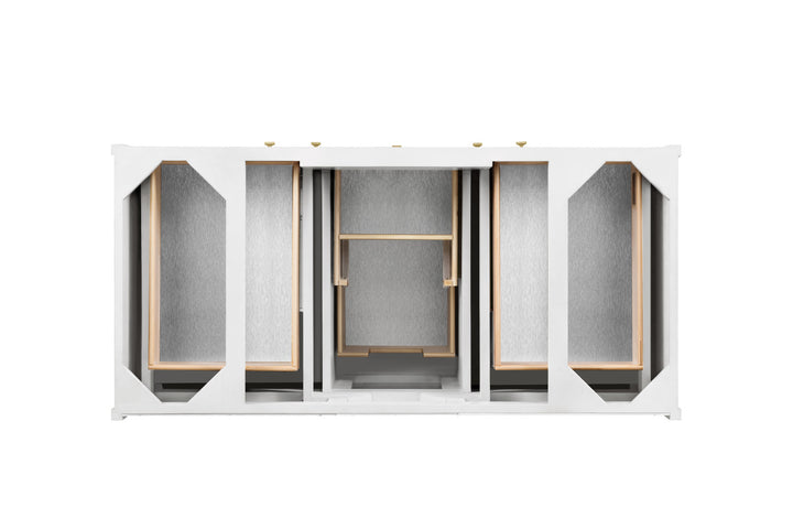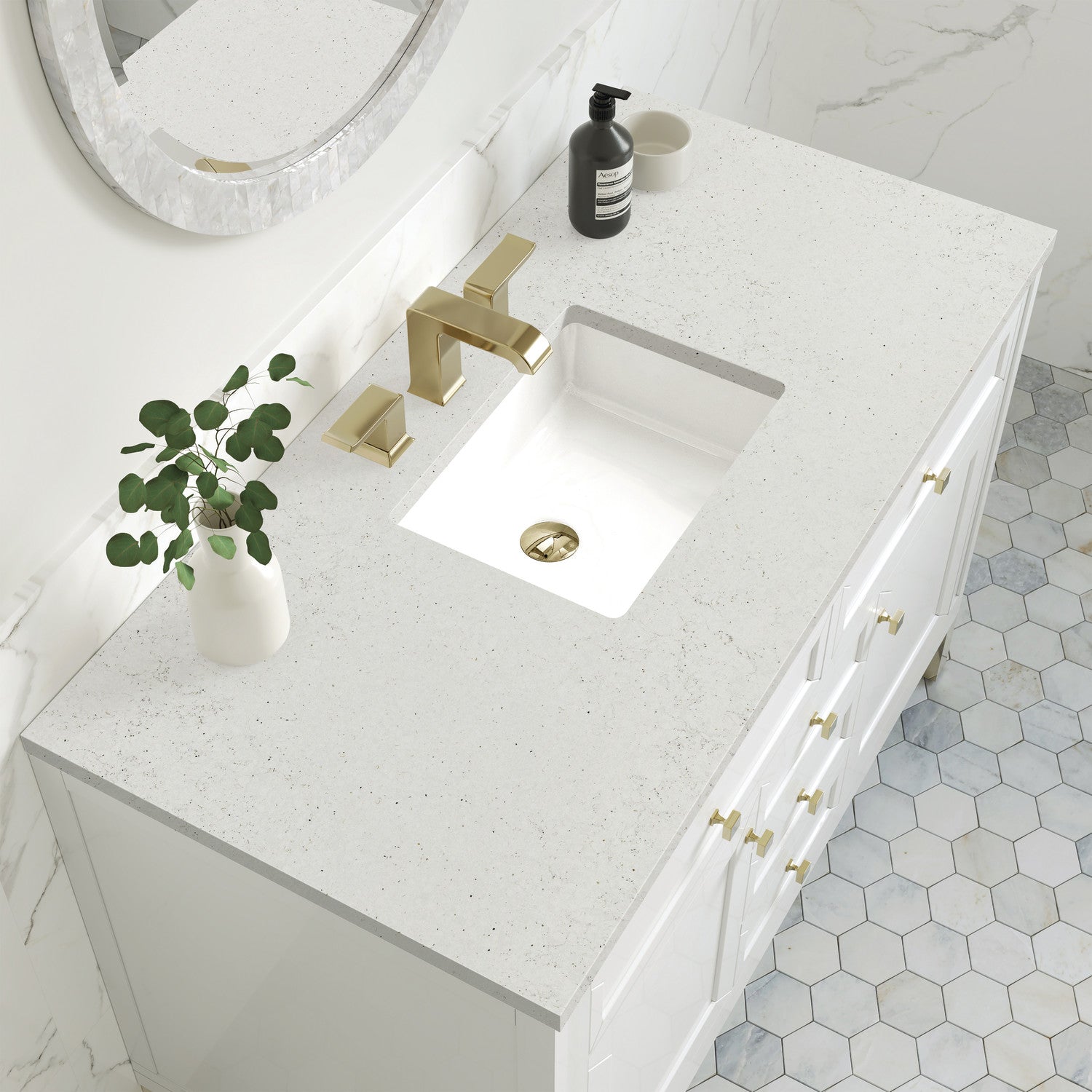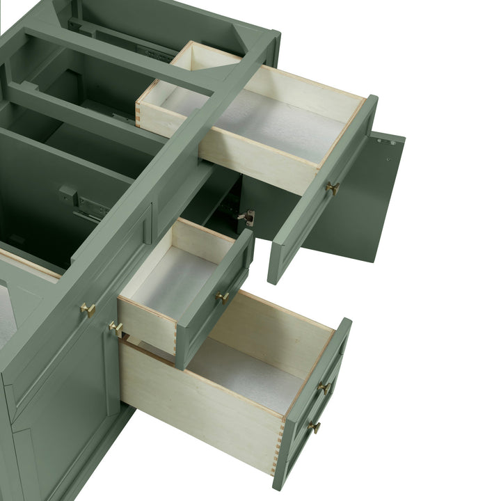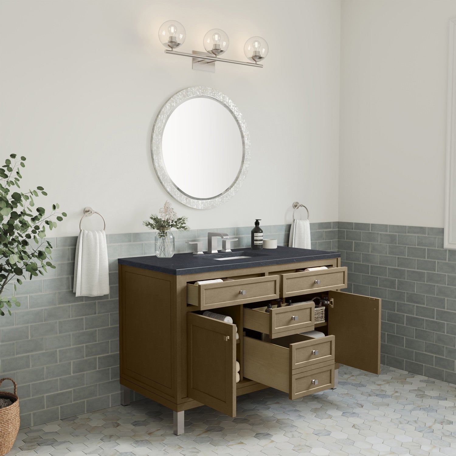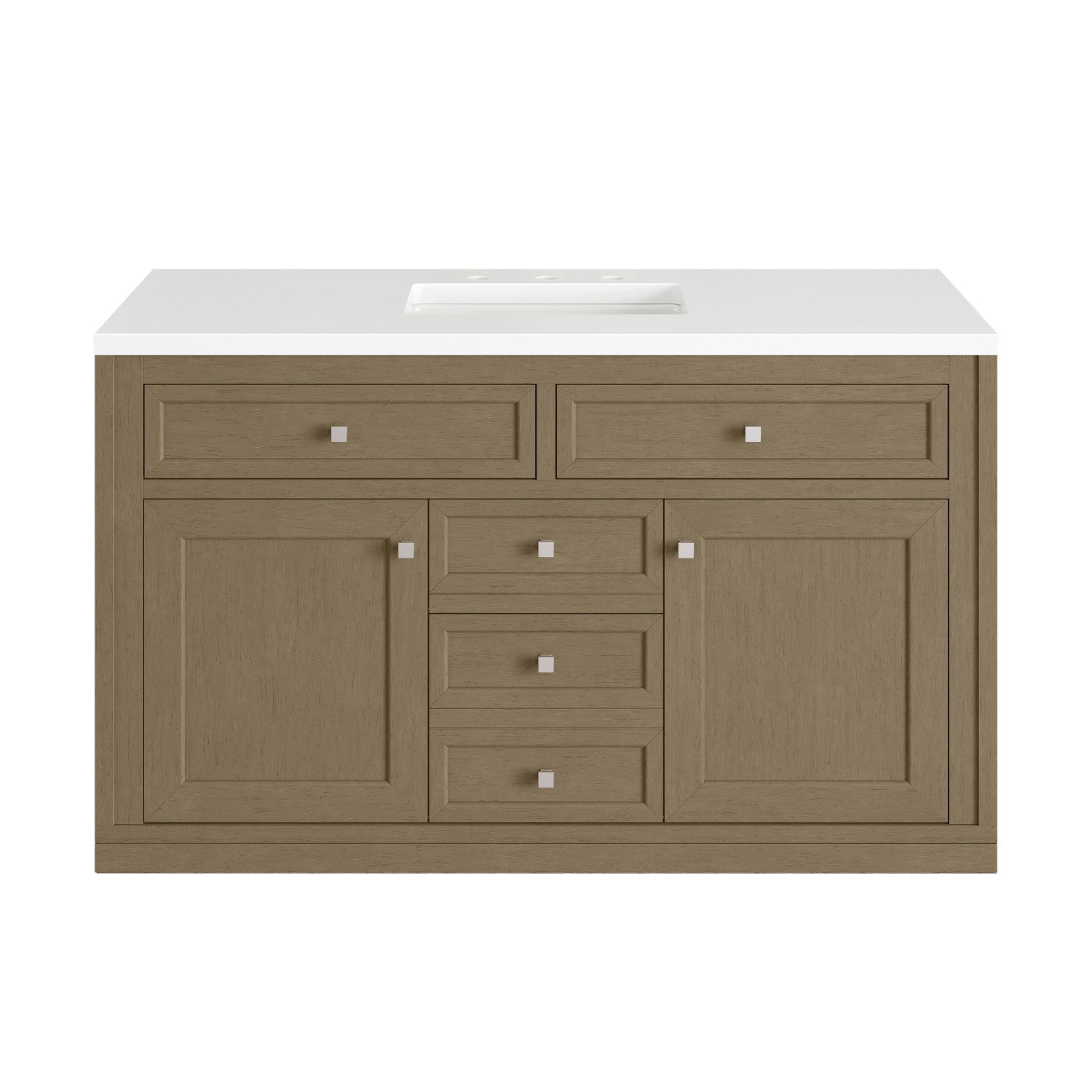The sophisticated details and clean lines of the Chicago 48" Single Vanity by James Martin Vanities make it the perfect choice for any bathroom. Featuring a Glossy White, Smokey Celadon, or Walnut Whisper finish. This vanity offers ample storage with its two-door cabinet, adjustable interior shelf, and top-row tip-out drawer. Champagne Brass knobs and legs (in Glossy White, Smokey Celadon) or Satin Nickel knobs and legs (Walnut Whisper Only), or choose to forego the metal legs for a modern wall-mounted installation. Complete the look with one of our 3 cm tops.
