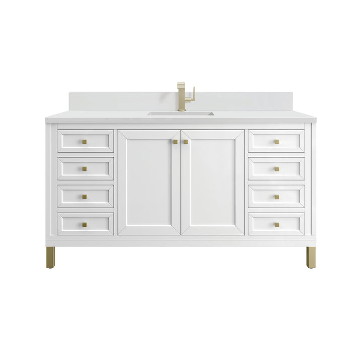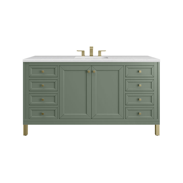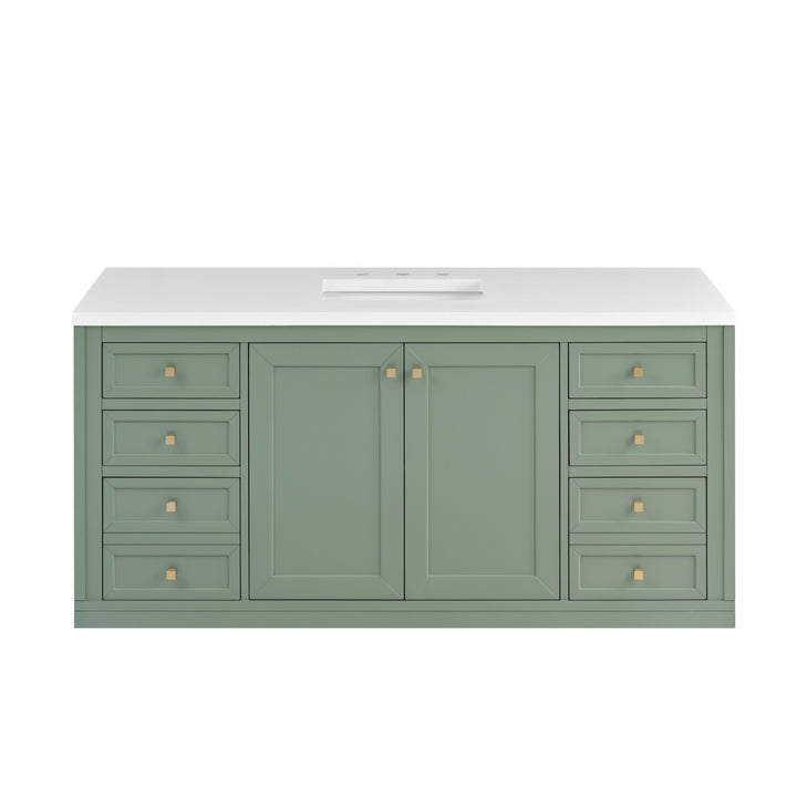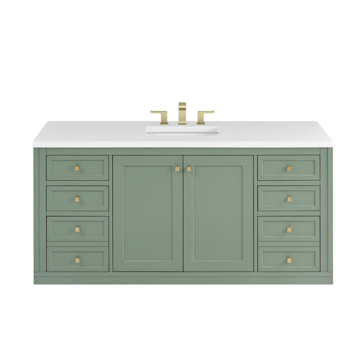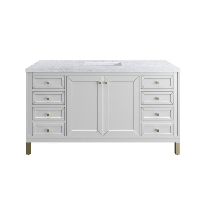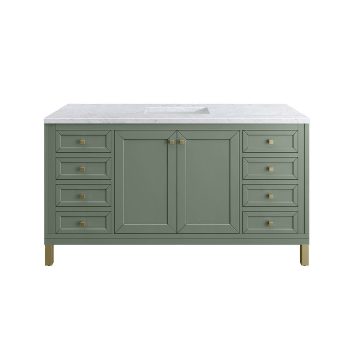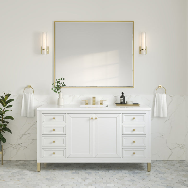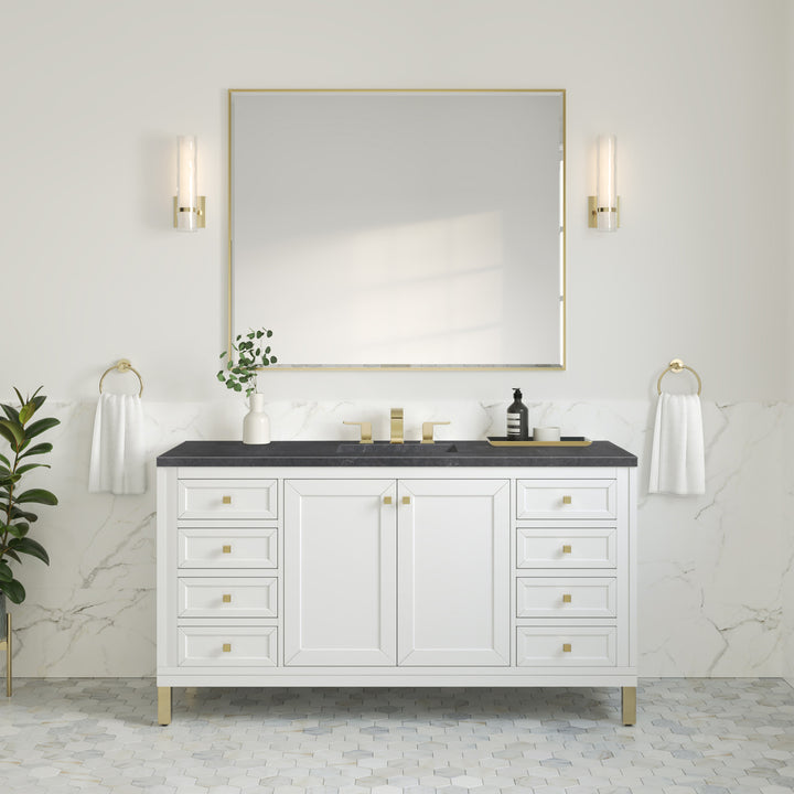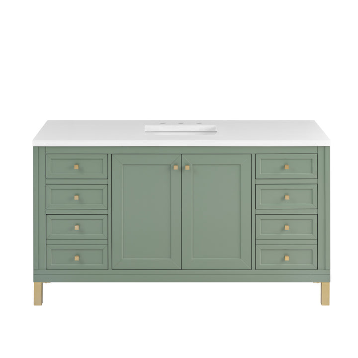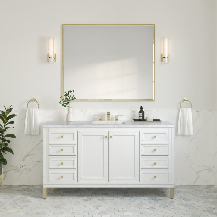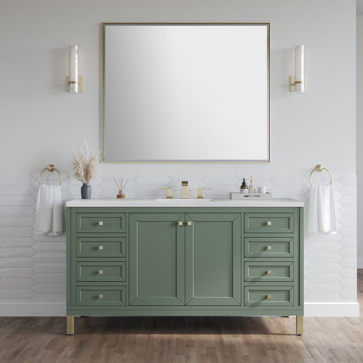 The sophisticated details and clean lines of the Chicago 60" Single Vanity by James Martin Vanities make it the perfect choice for any bathroom. Featuring a Glossy White, Smokey Celadon, or Walnut Whisper finish. This vanity offers ample storage with its two-door cabinet, adjustable interior shelf, and top-row tip-out drawer. Champagne Brass knobs and legs (in Glossy White, Smokey Celadon) or Satin Nickel knobs and legs (Walnut Whisper Only), or choose to forego the metal legs for a modern wall-mounted installation. Complete the look with one of our 3 cm tops.