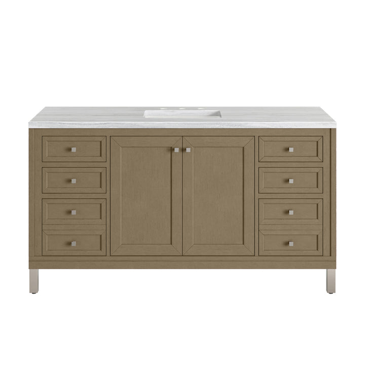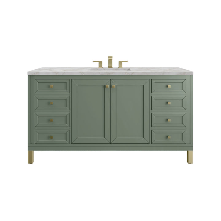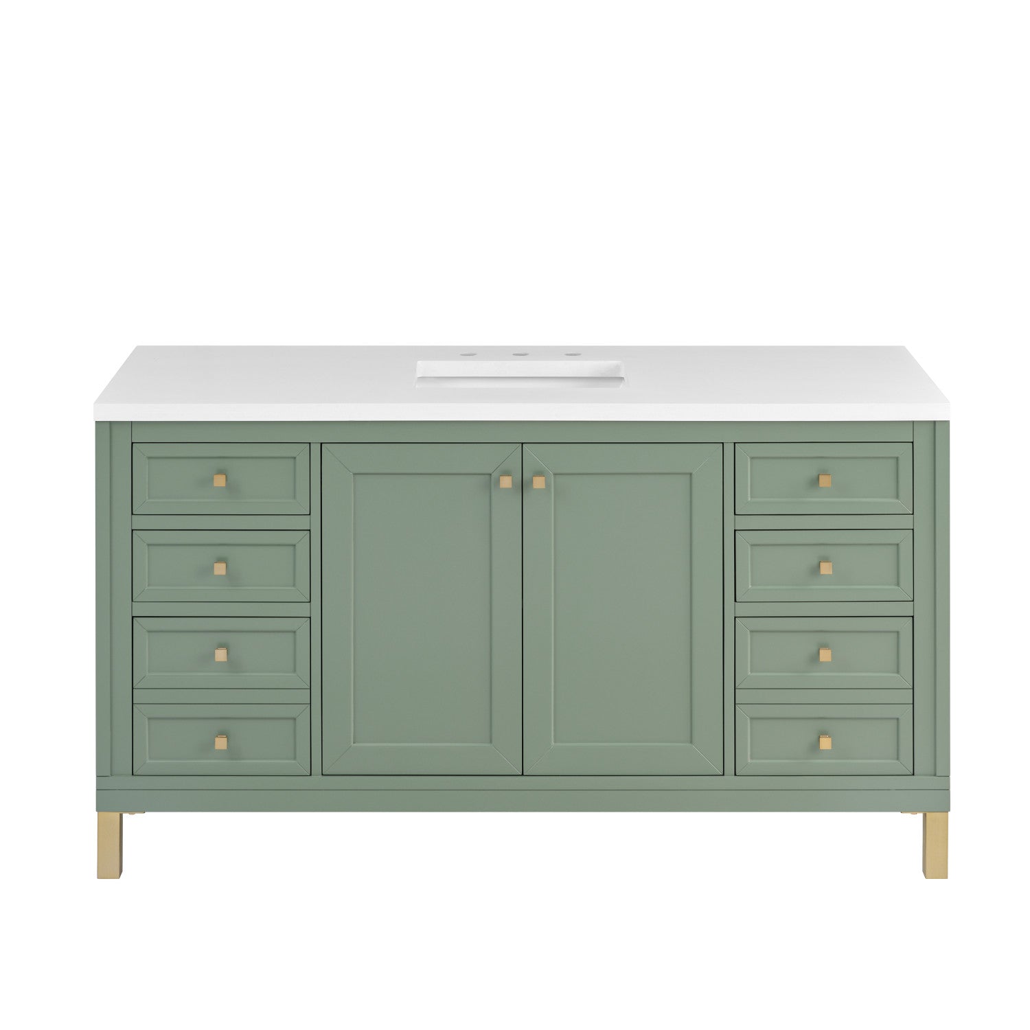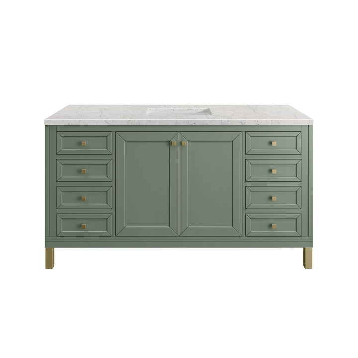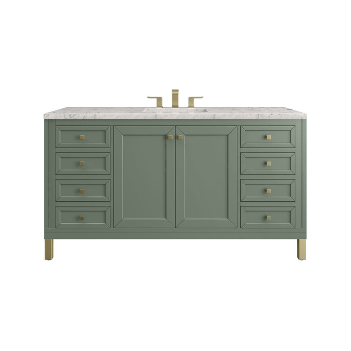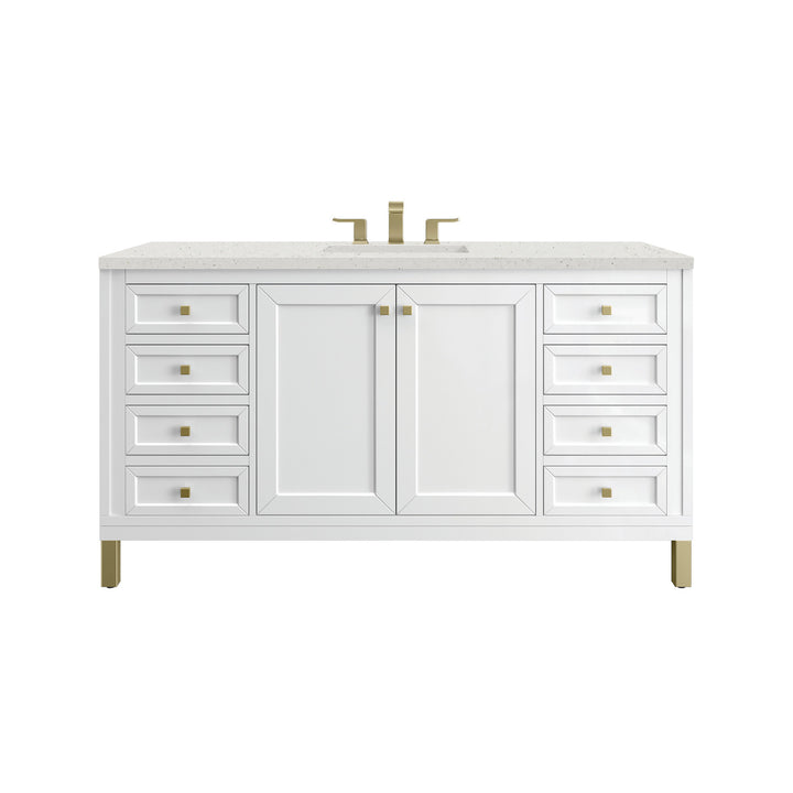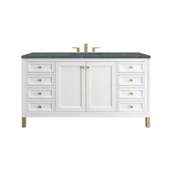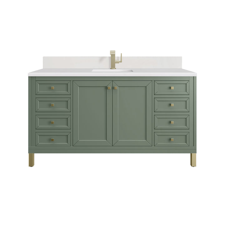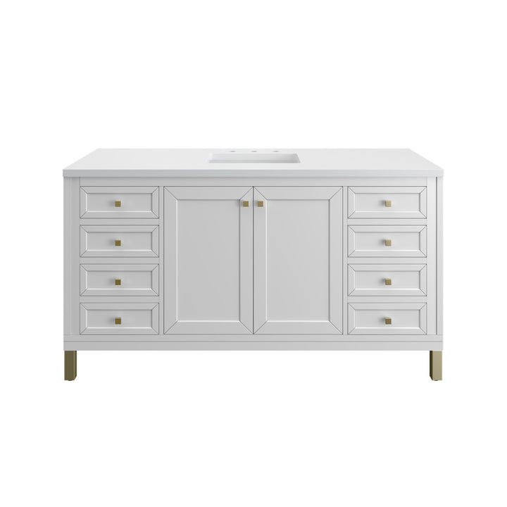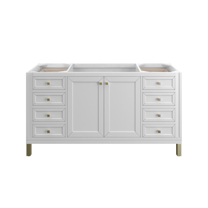 The sophisticated details and clean lines of the Chicago 60" Single Vanity by James Martin Vanities make it the perfect choice for any bathroom. Featuring a Glossy White, Smokey Celadon, or Walnut Whisper finish. This vanity offers ample storage with its two-door cabinet, adjustable interior shelf, and top-row tip-out drawer. Champagne Brass knobs and legs (in Glossy White, Smokey Celadon) or Satin Nickel knobs and legs (Walnut Whisper Only), or choose to forego the metal legs for a modern wall-mounted installation. Complete the look with one of our 3 cm tops.