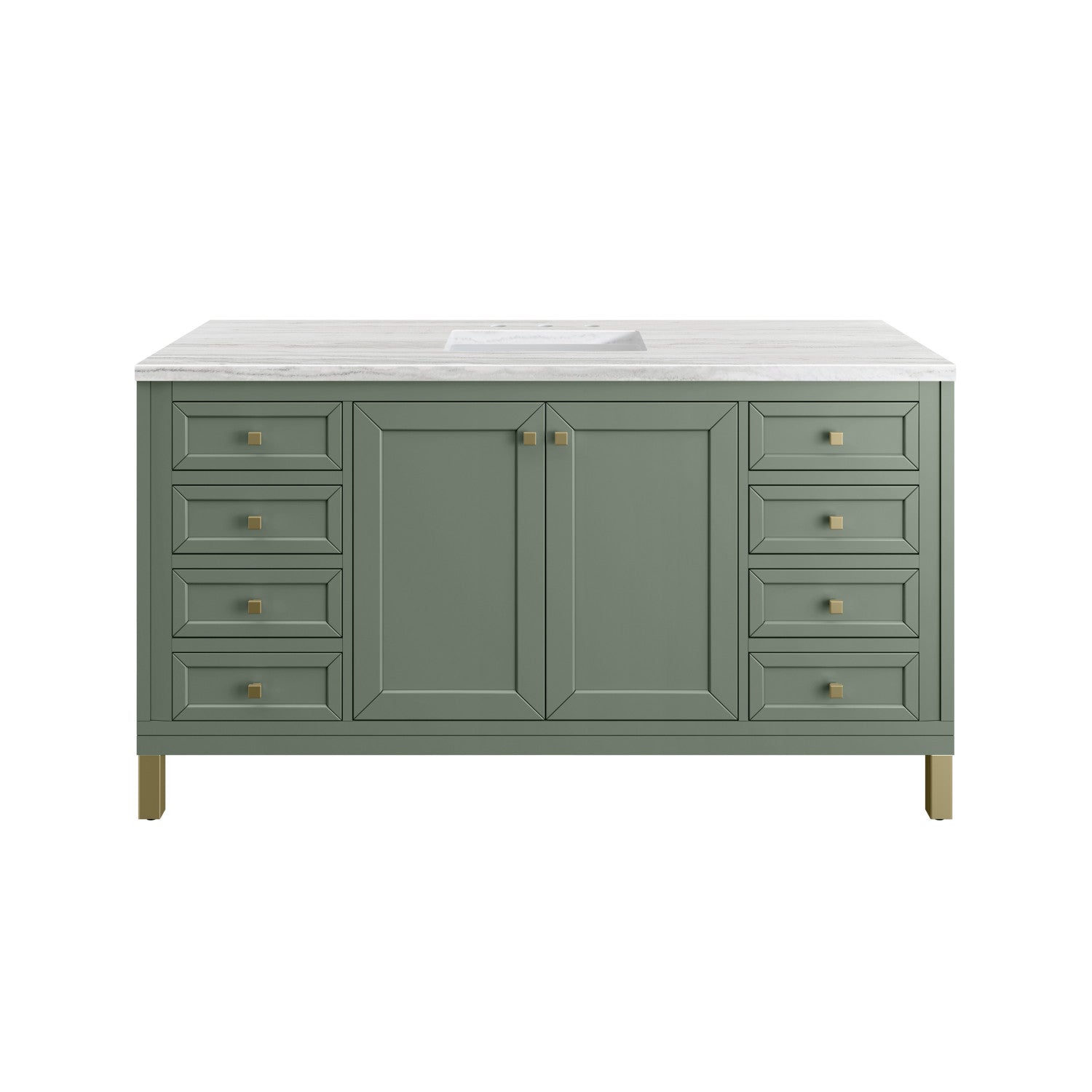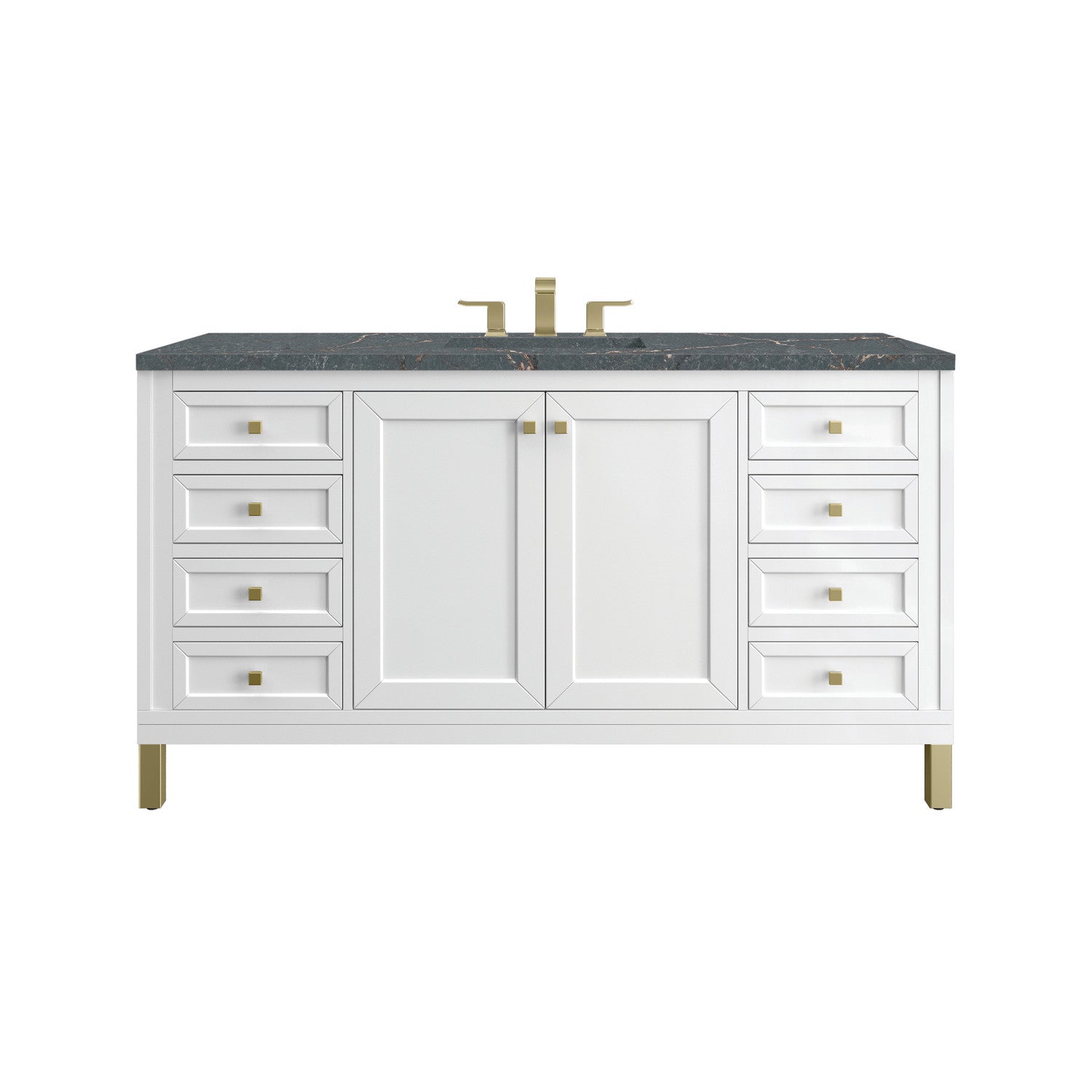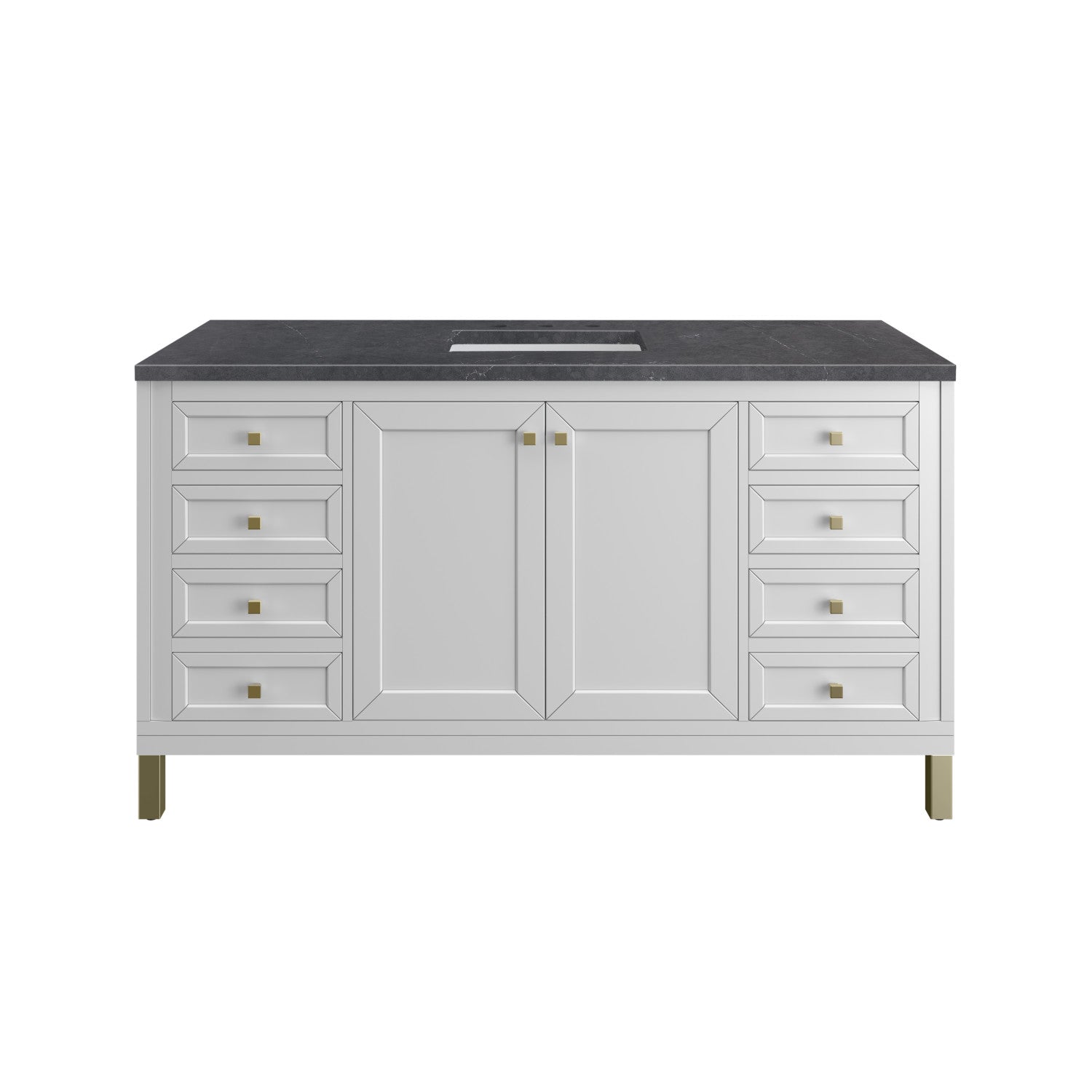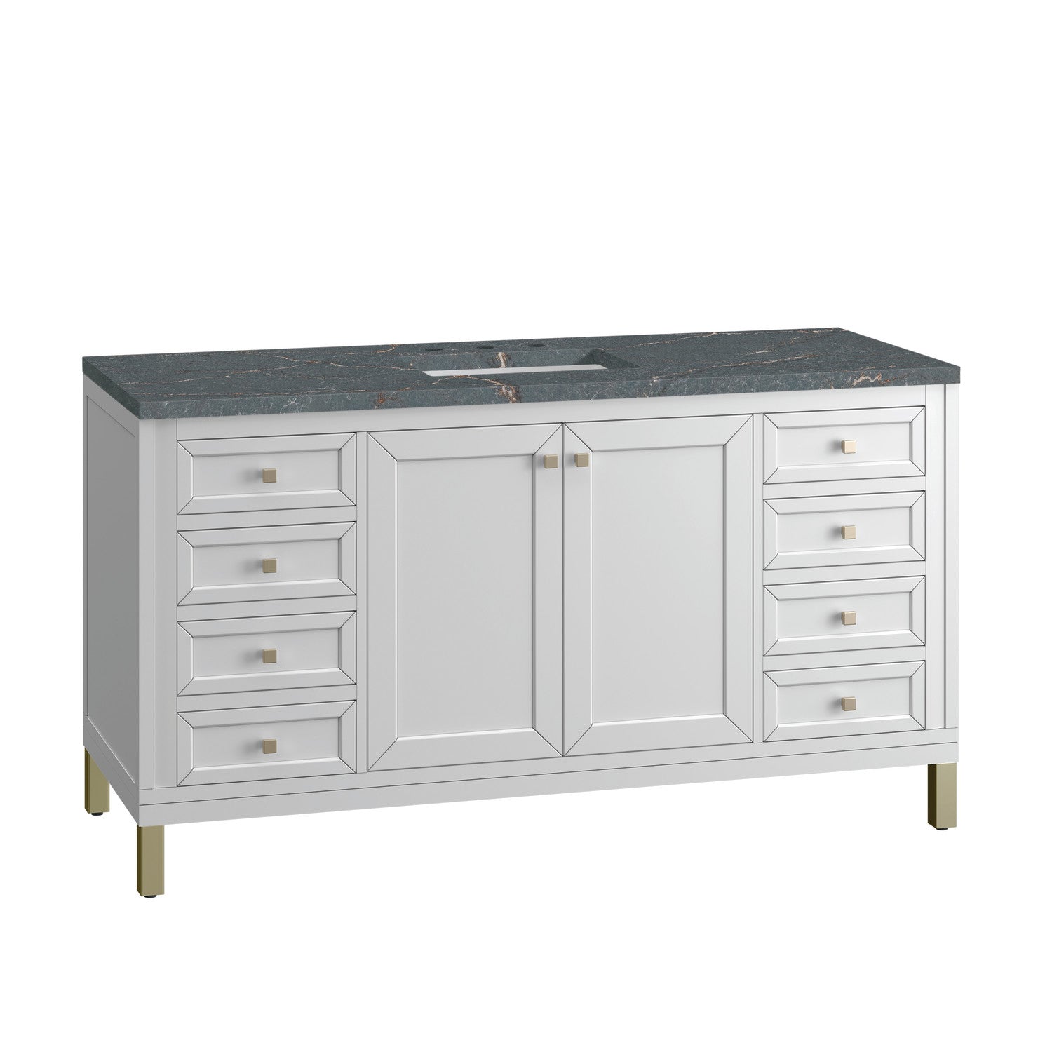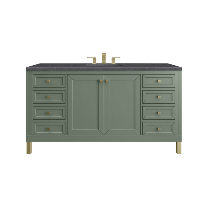 The sophisticated details and clean lines of the Chicago 60" Single Vanity by James Martin Vanities make it the perfect choice for any bathroom. Featuring a Glossy White, Smokey Celadon, or Walnut Whisper finish. This vanity offers ample storage with its two-door cabinet, adjustable interior shelf, and top-row tip-out drawer. Champagne Brass knobs and legs (in Glossy White, Smokey Celadon) or Satin Nickel knobs and legs (Walnut Whisper Only), or choose to forego the metal legs for a modern wall-mounted installation. Complete the look with one of our 3 cm tops.
