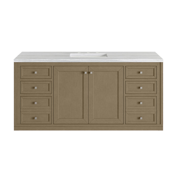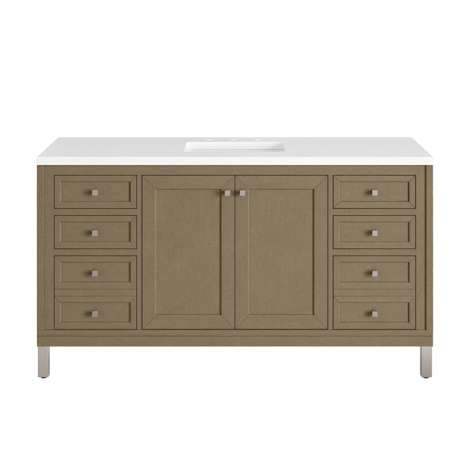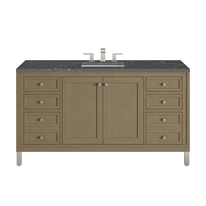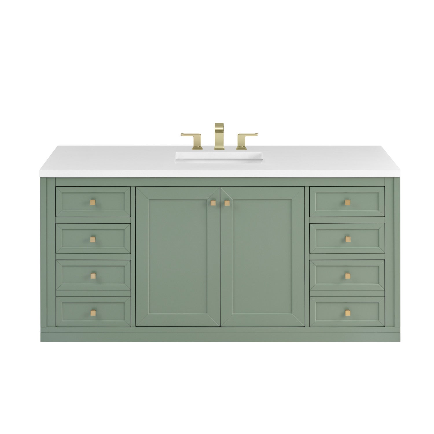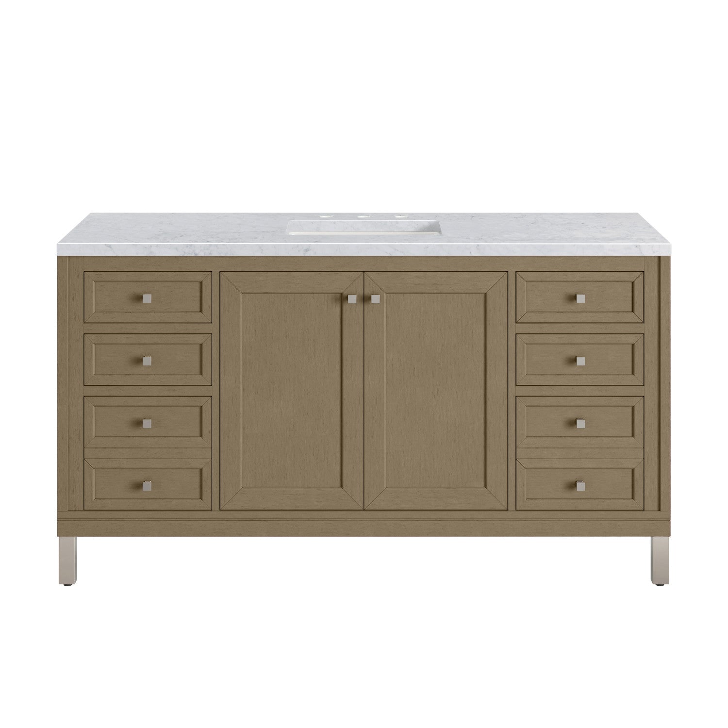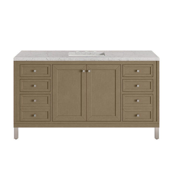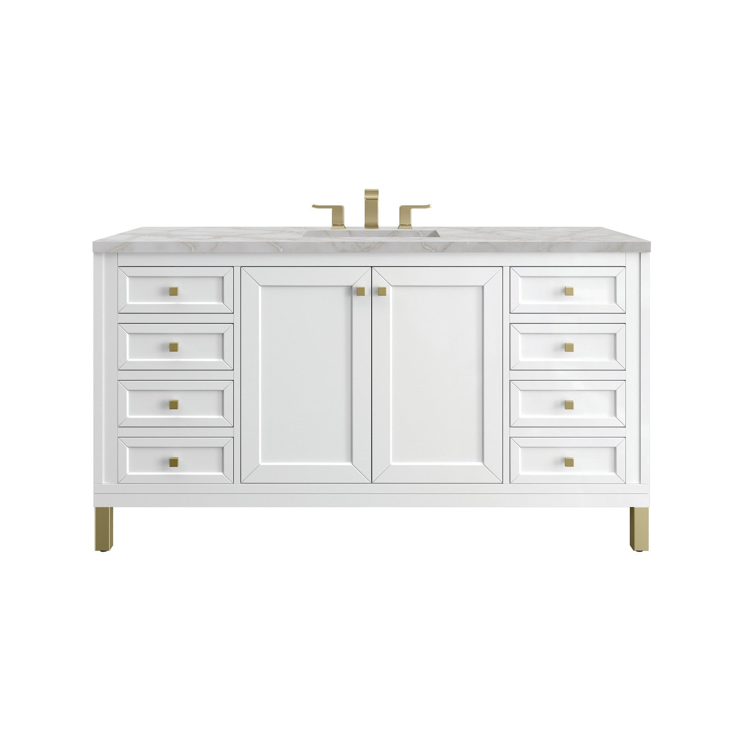 The sophisticated details and clean lines of the Chicago 60" Single Vanity by James Martin Vanities make it the perfect choice for any bathroom. Featuring a Glossy White, Smokey Celadon, or Walnut Whisper finish. This vanity offers ample storage with its two-door cabinet, adjustable interior shelf, and top-row tip-out drawer. Champagne Brass knobs and legs (in Glossy White, Smokey Celadon) or Satin Nickel knobs and legs (Walnut Whisper Only), or choose to forego the metal legs for a modern wall-mounted installation. Complete the look with one of our 3 cm tops.