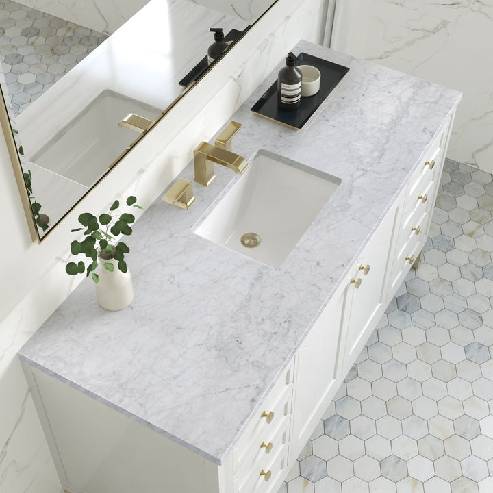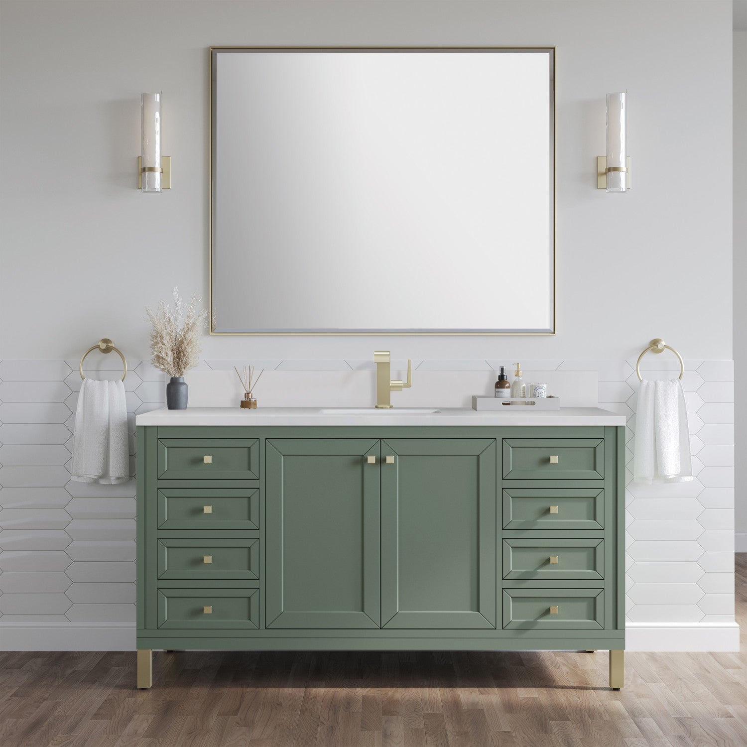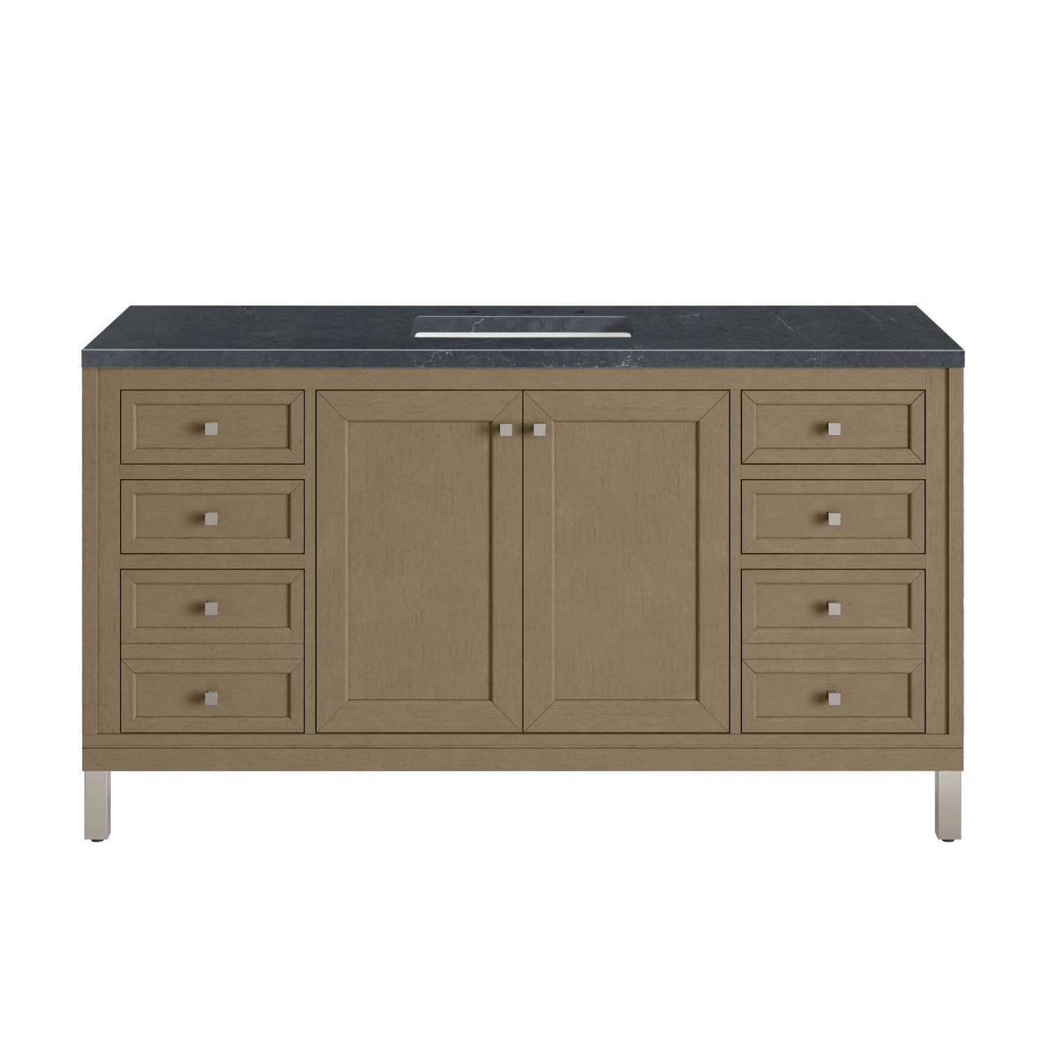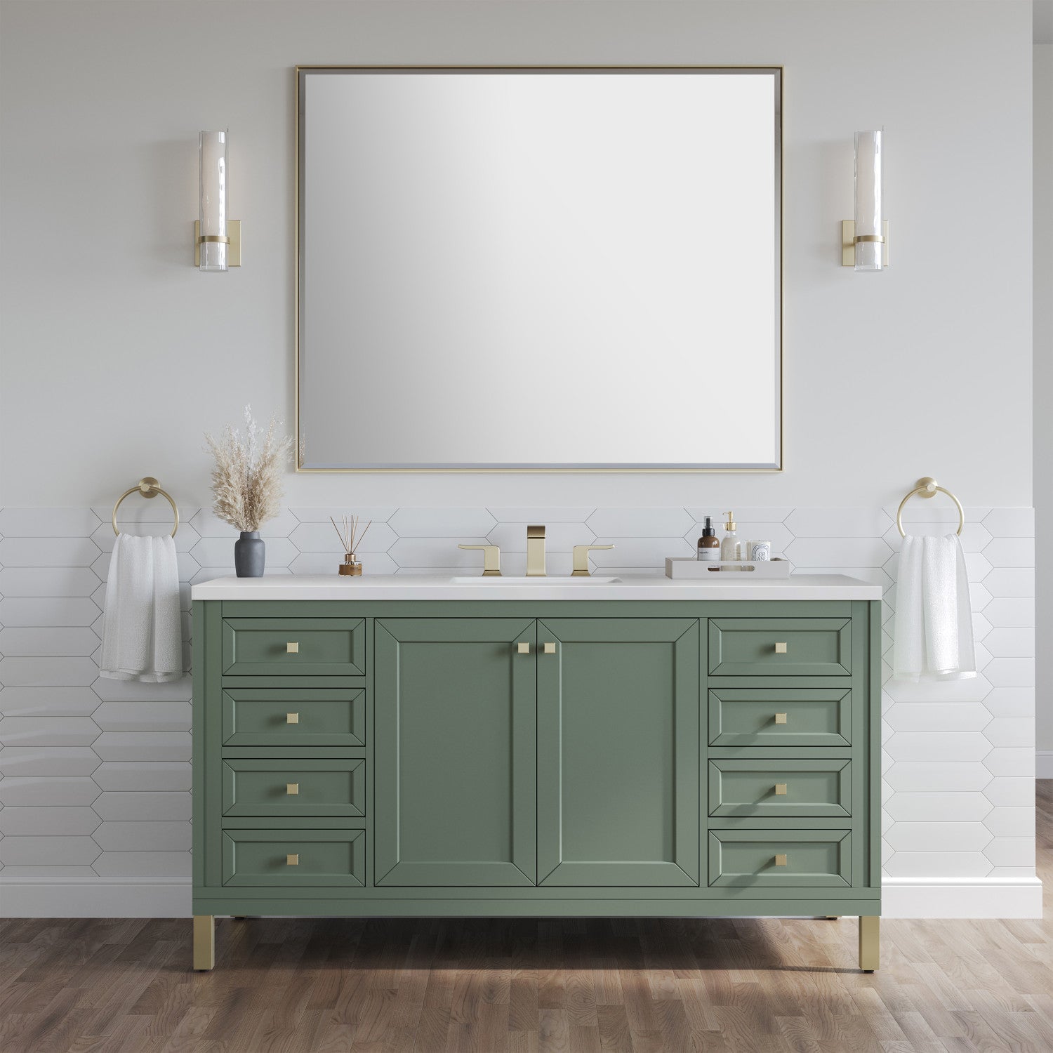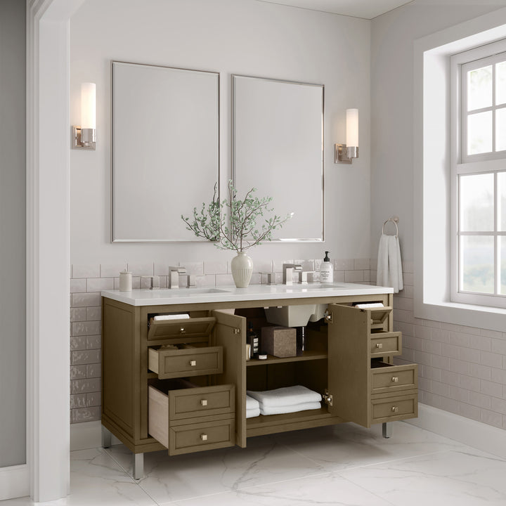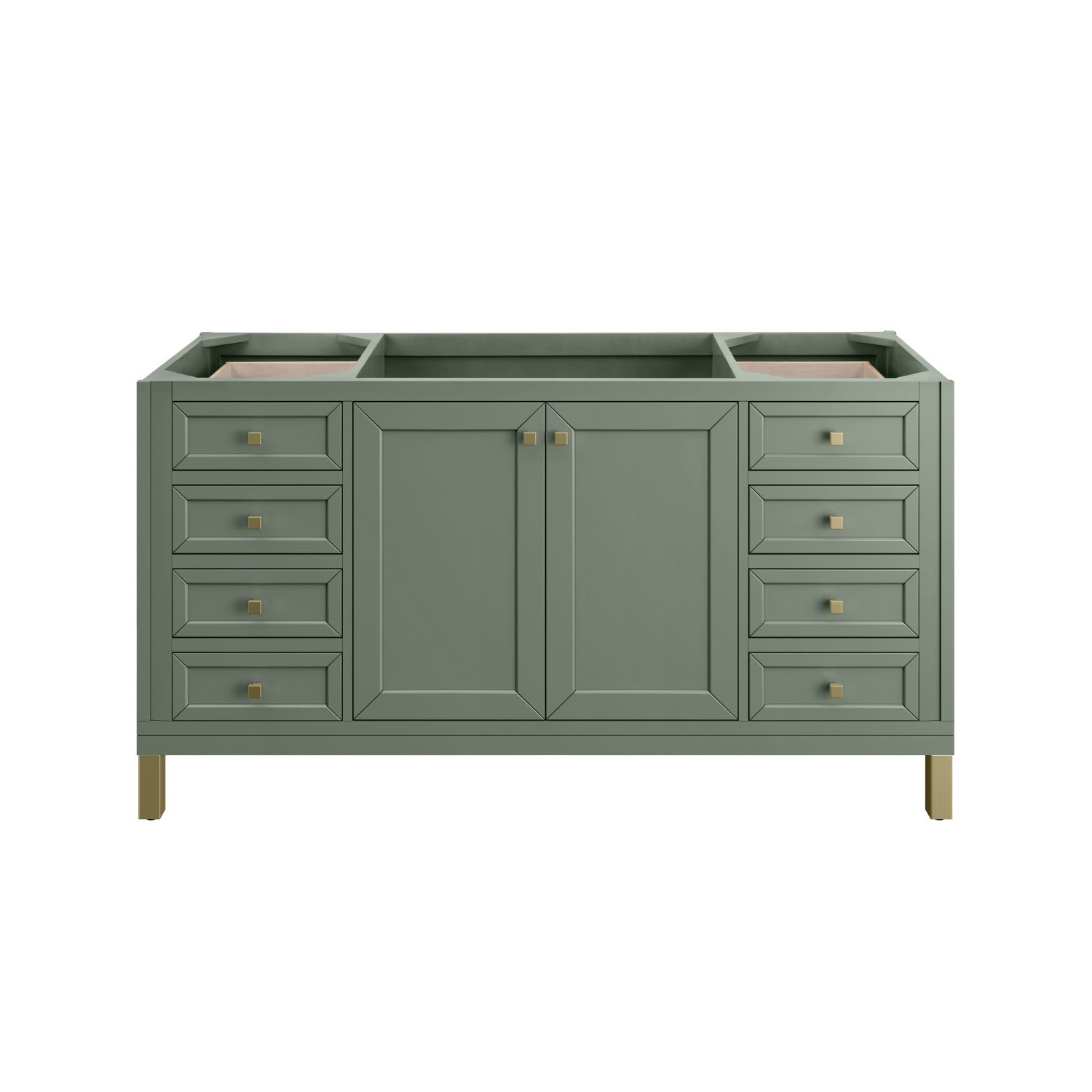 The sophisticated details and clean lines of the Chicago 60" Single Vanity by James Martin Vanities make it the perfect choice for any bathroom. Featuring a Glossy White, Smokey Celadon, or Walnut Whisper finish. This vanity offers ample storage with its two-door cabinet, adjustable interior shelf, and top-row tip-out drawer. Champagne Brass knobs and legs (in Glossy White, Smokey Celadon) or Satin Nickel knobs and legs (Walnut Whisper Only), or choose to forego the metal legs for a modern wall-mounted installation. Complete the look with one of our 3 cm tops.