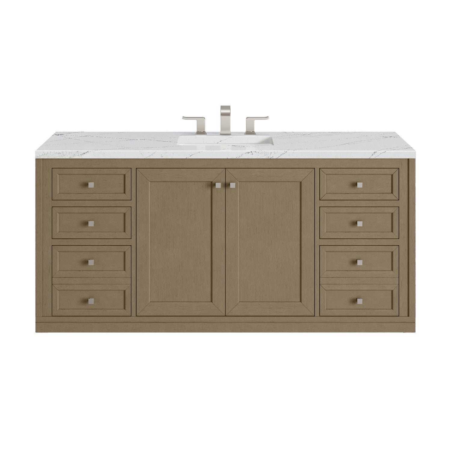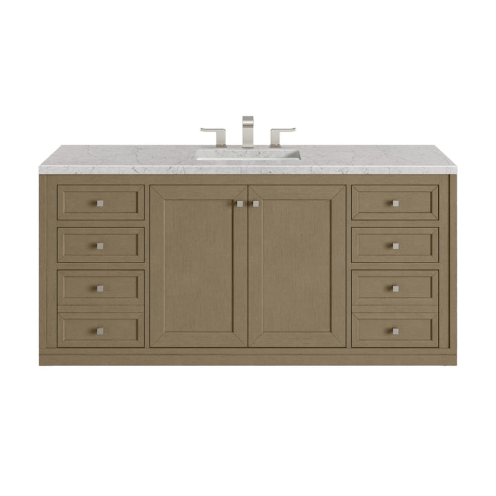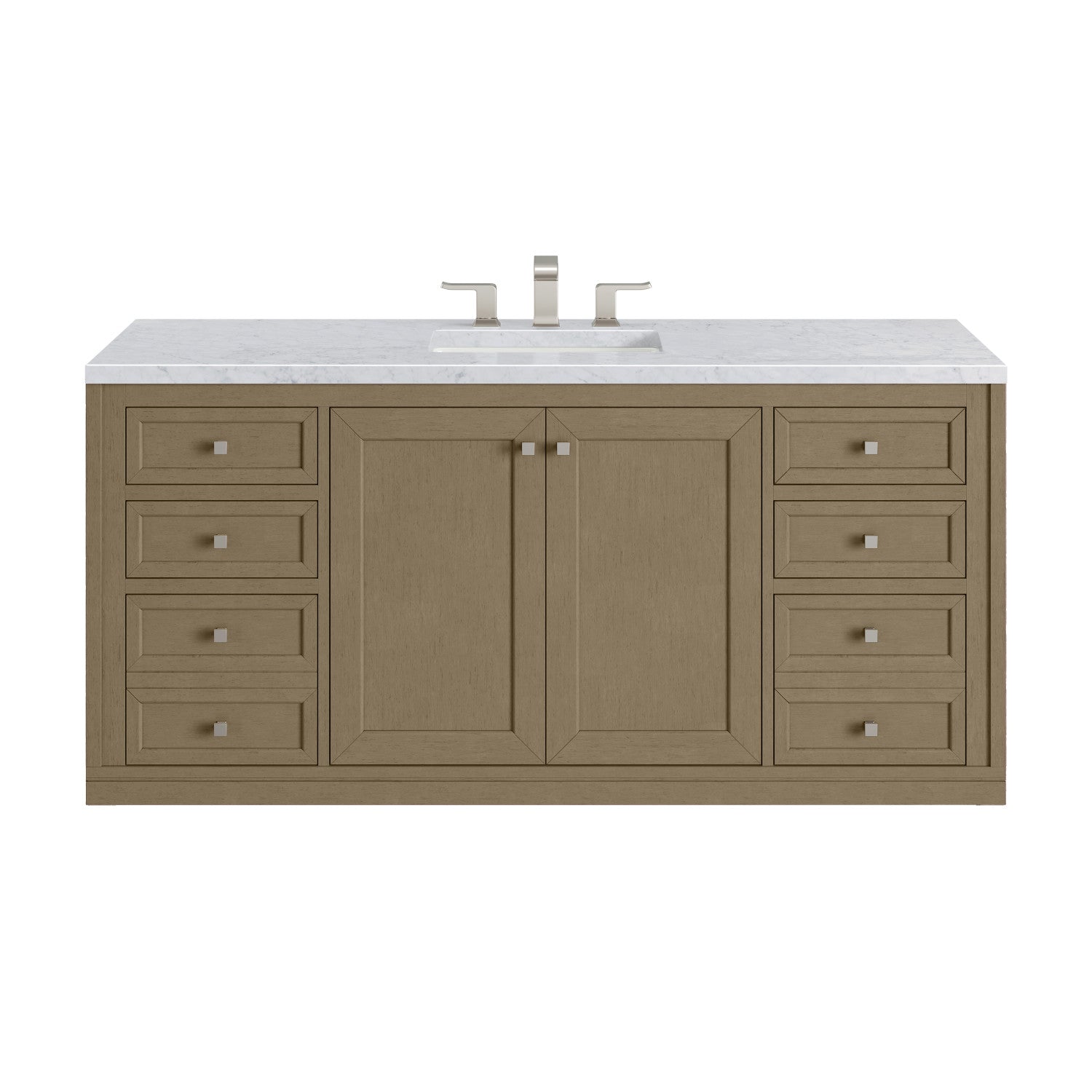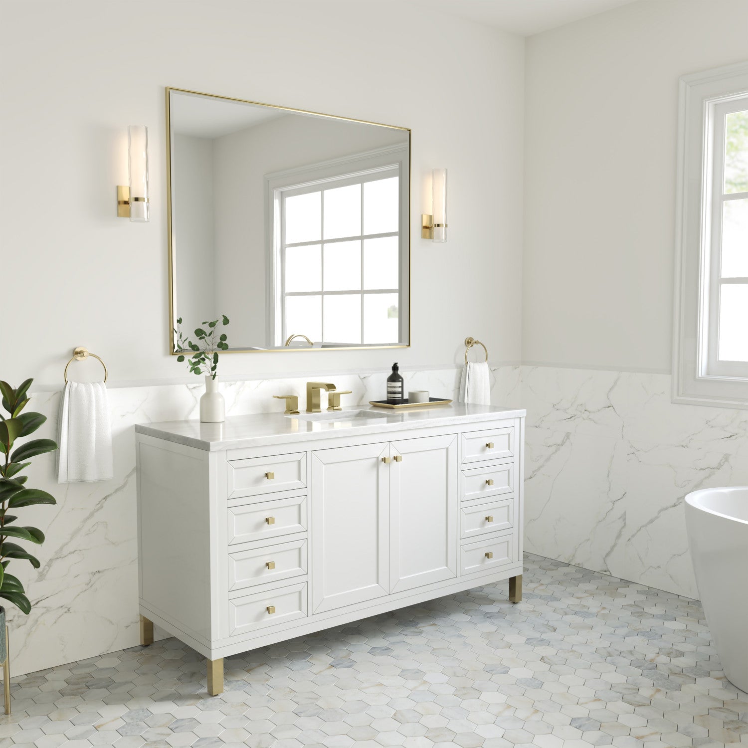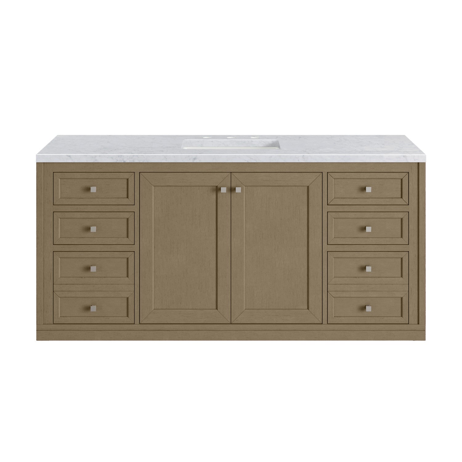 The sophisticated details and clean lines of the Chicago 60" Single Vanity by James Martin Vanities make it the perfect choice for any bathroom. Featuring a Glossy White, Smokey Celadon, or Walnut Whisper finish. This vanity offers ample storage with its two-door cabinet, adjustable interior shelf, and top-row tip-out drawer. Champagne Brass knobs and legs (in Glossy White, Smokey Celadon) or Satin Nickel knobs and legs (Walnut Whisper Only), or choose to forego the metal legs for a modern wall-mounted installation. Complete the look with one of our 3 cm tops.