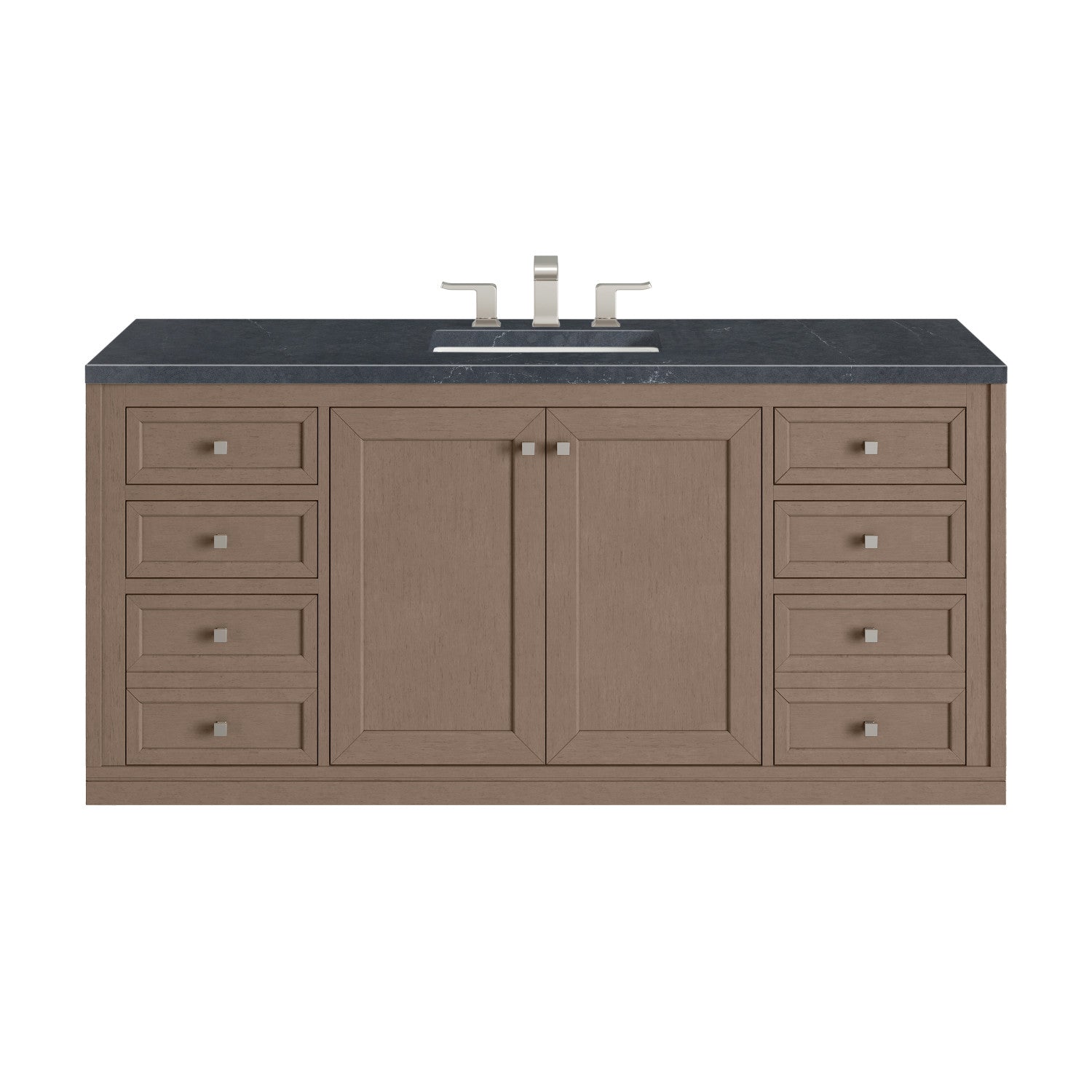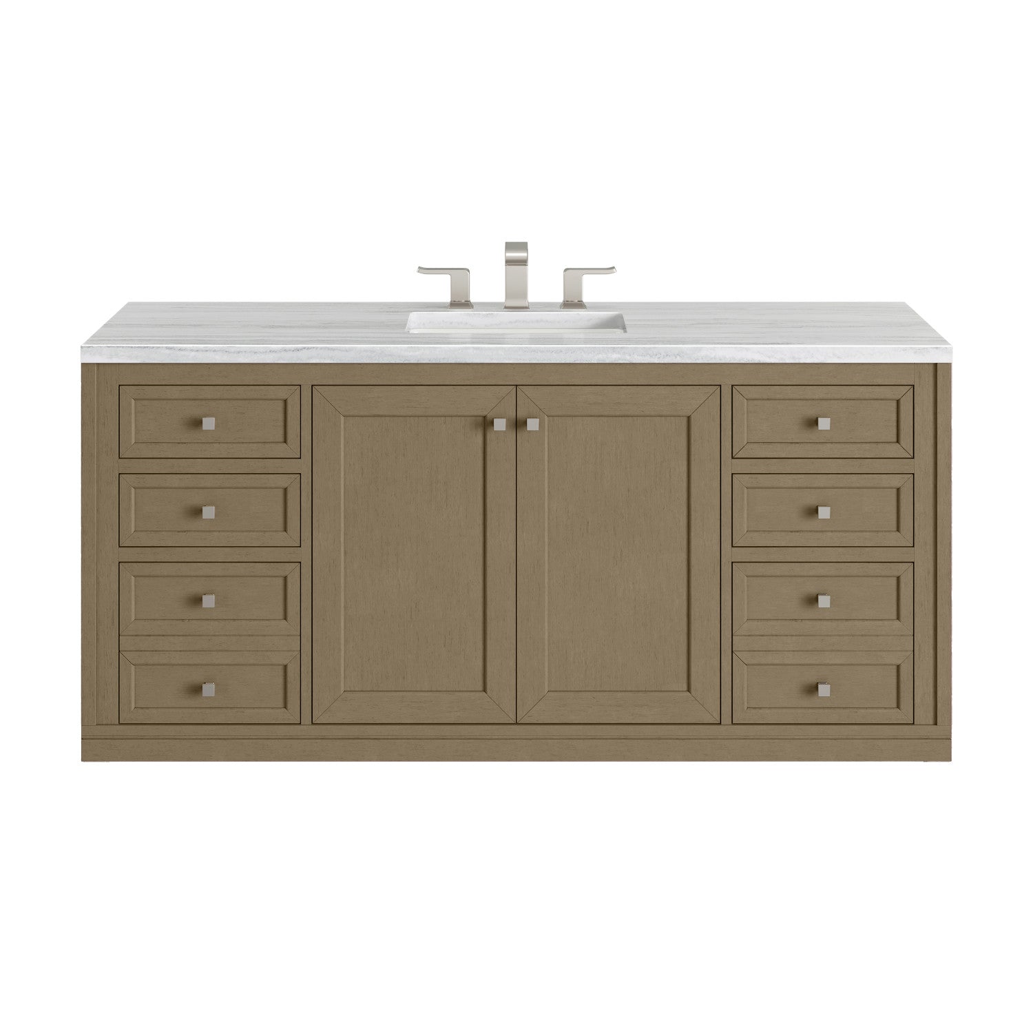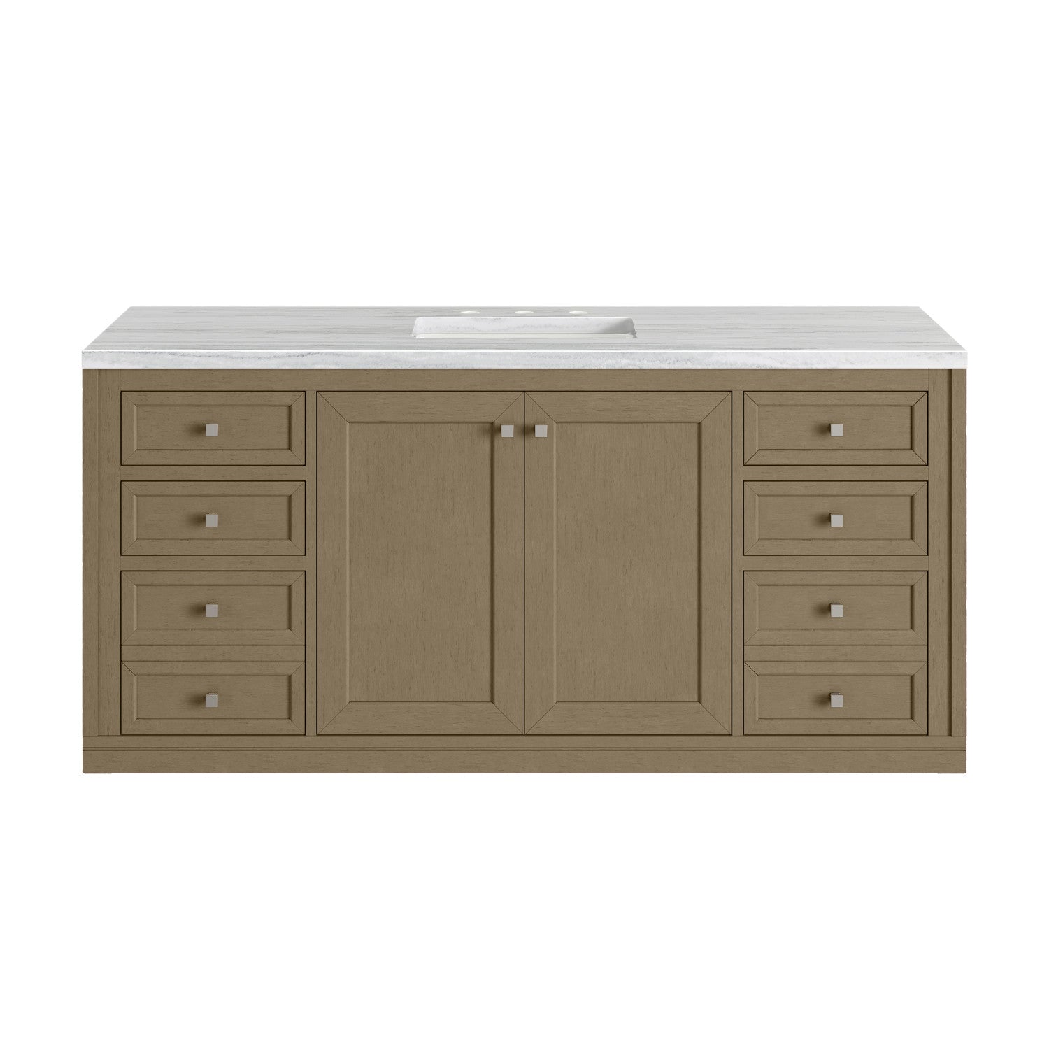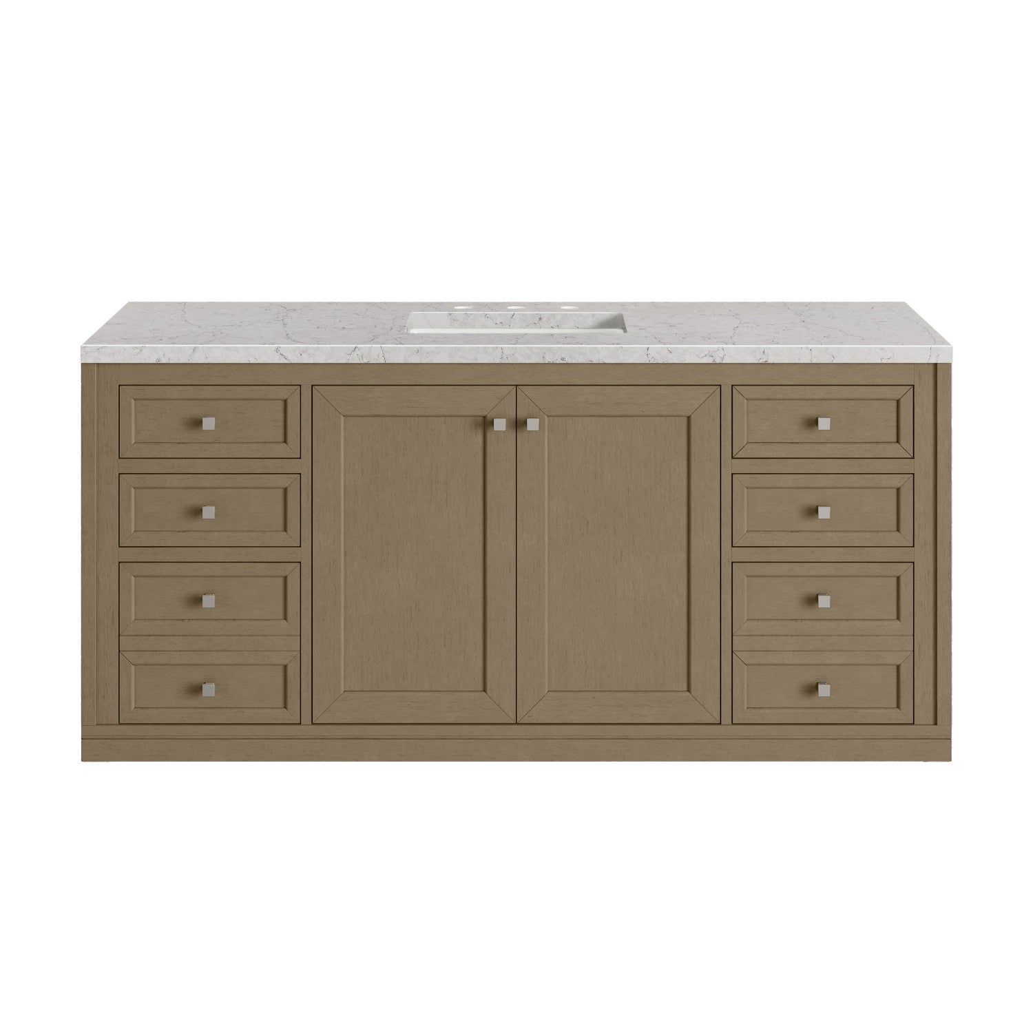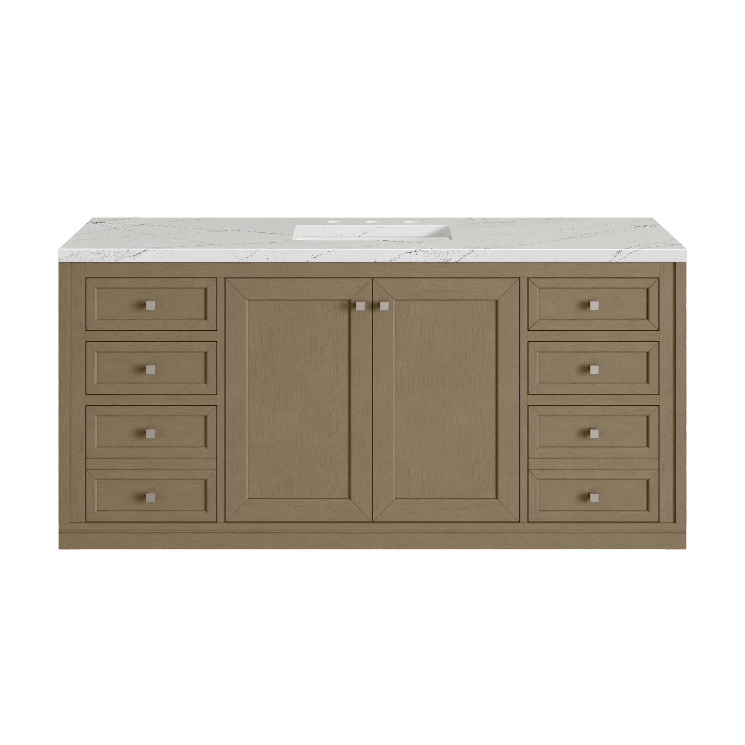 The sophisticated details and clean lines of the Chicago 60" Single Vanity by James Martin Vanities make it the perfect choice for any bathroom. Featuring a Glossy White, Smokey Celadon, or Walnut Whisper finish. This vanity offers ample storage with its two-door cabinet, adjustable interior shelf, and top-row tip-out drawer. Champagne Brass knobs and legs (in Glossy White, Smokey Celadon) or Satin Nickel knobs and legs (Walnut Whisper Only), or choose to forego the metal legs for a modern wall-mounted installation. Complete the look with one of our 3 cm tops.