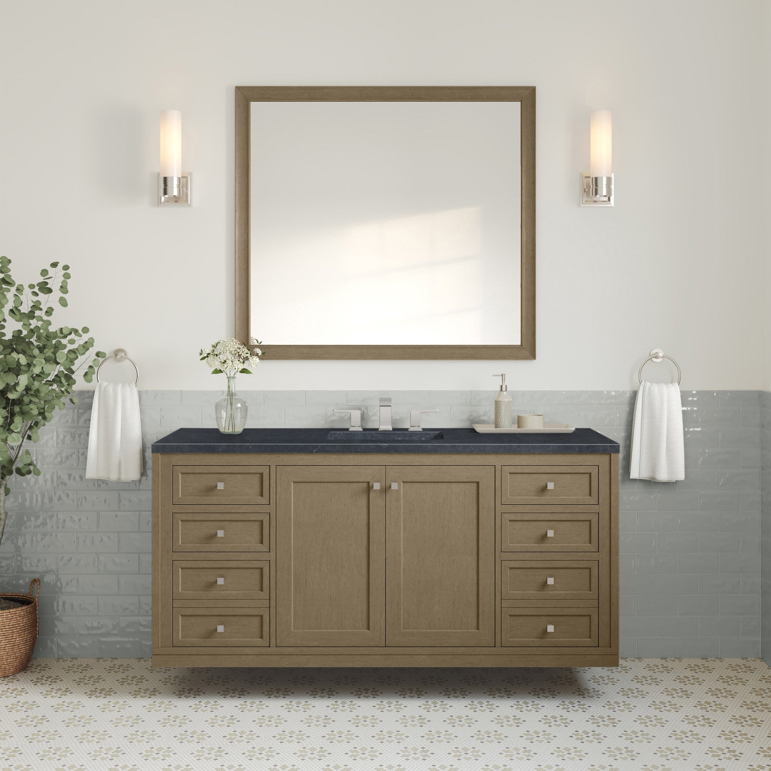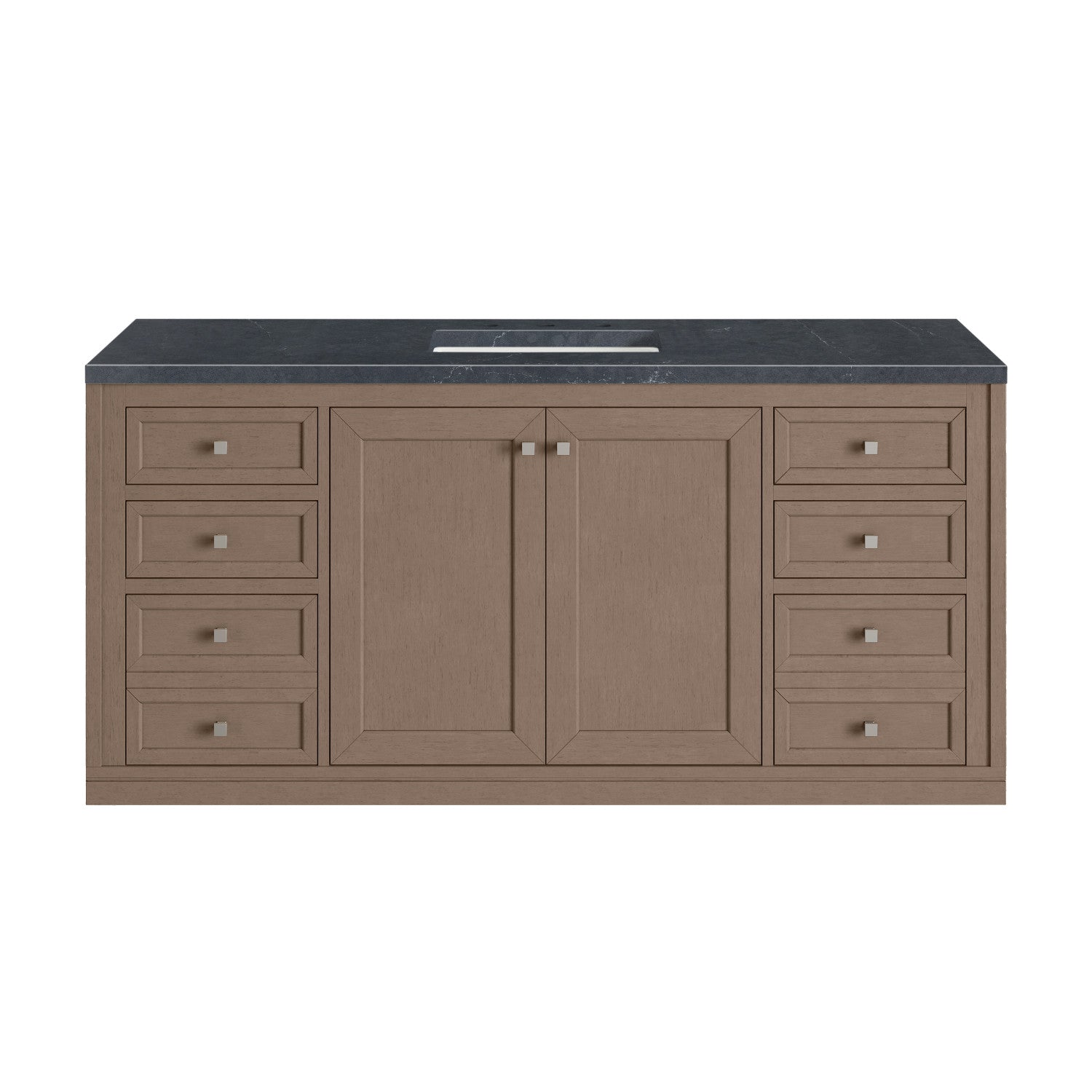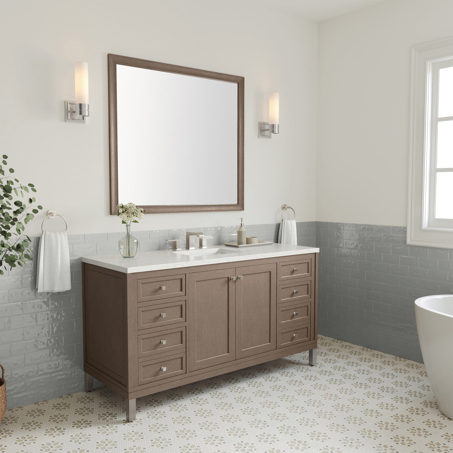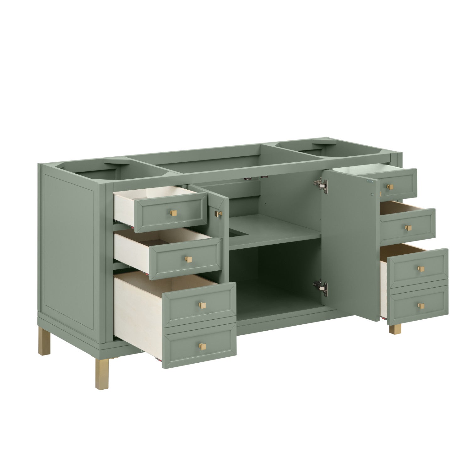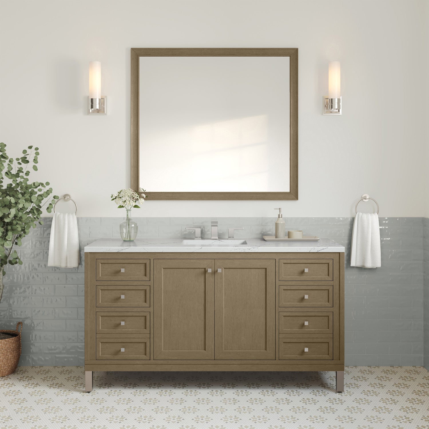 The sophisticated details and clean lines of the Chicago 60" Single Vanity by James Martin Vanities make it the perfect choice for any bathroom. Featuring a Glossy White, Smokey Celadon, or Walnut Whisper finish. This vanity offers ample storage with its two-door cabinet, adjustable interior shelf, and top-row tip-out drawer. Champagne Brass knobs and legs (in Glossy White, Smokey Celadon) or Satin Nickel knobs and legs (Walnut Whisper Only), or choose to forego the metal legs for a modern wall-mounted installation. Complete the look with one of our 3 cm tops.