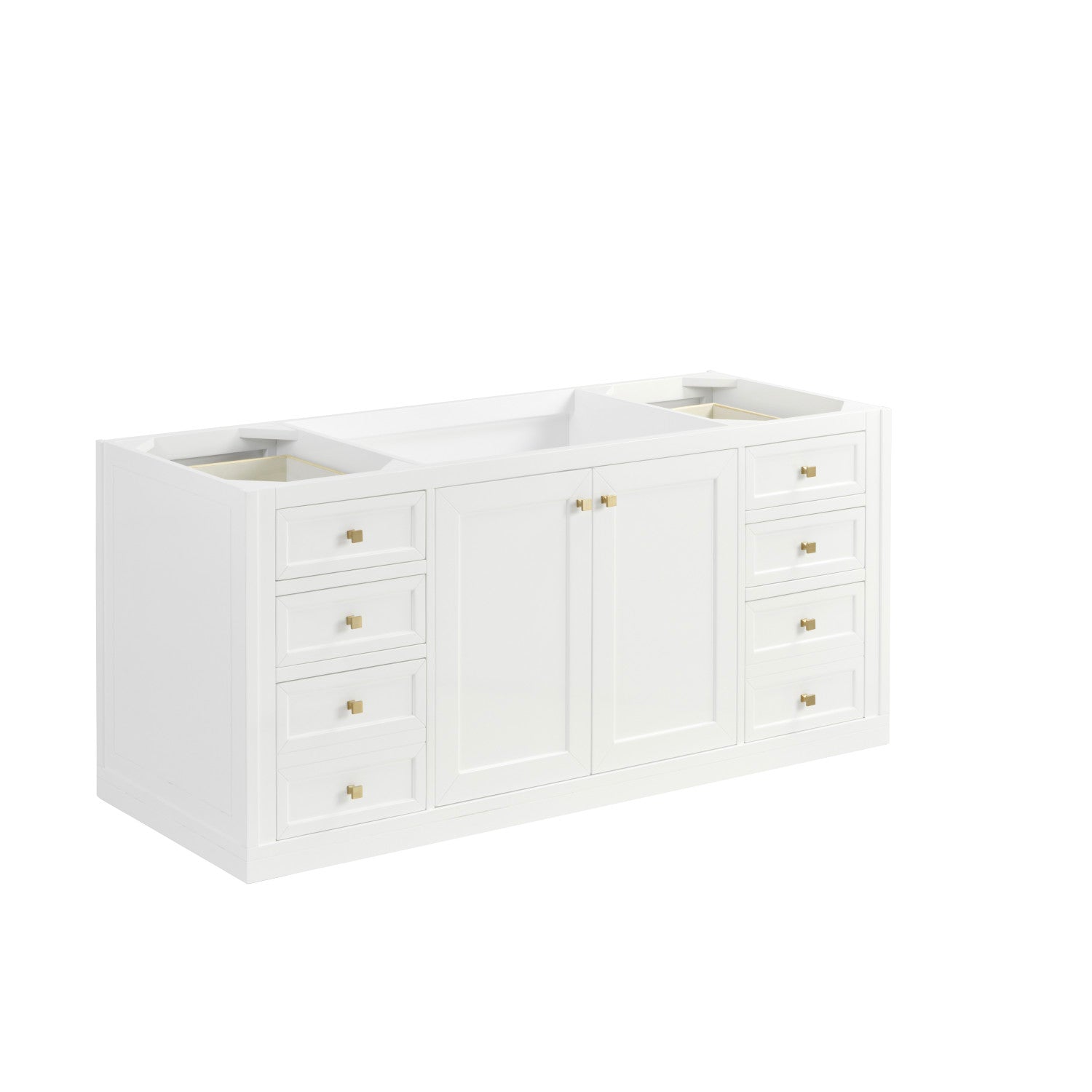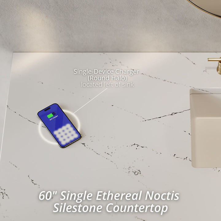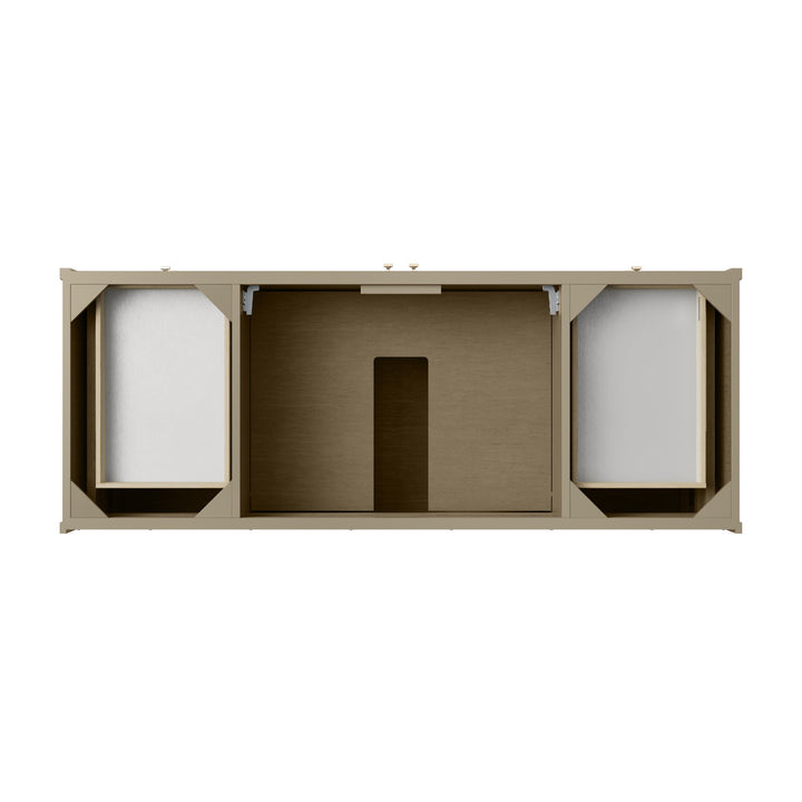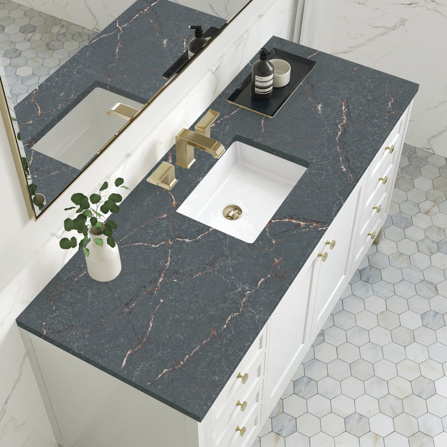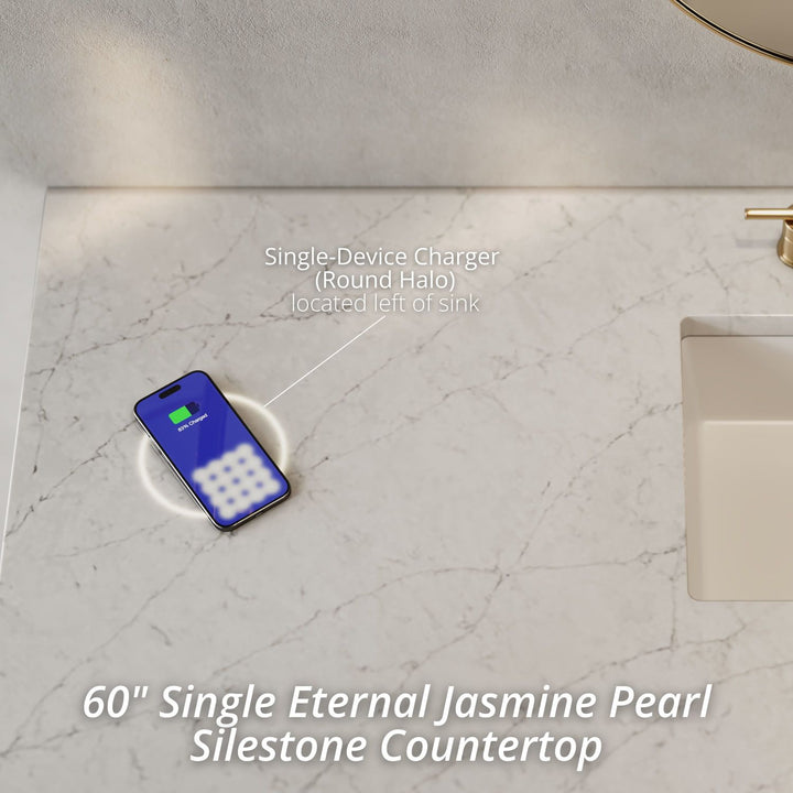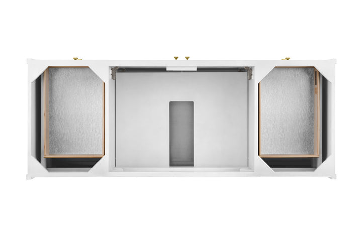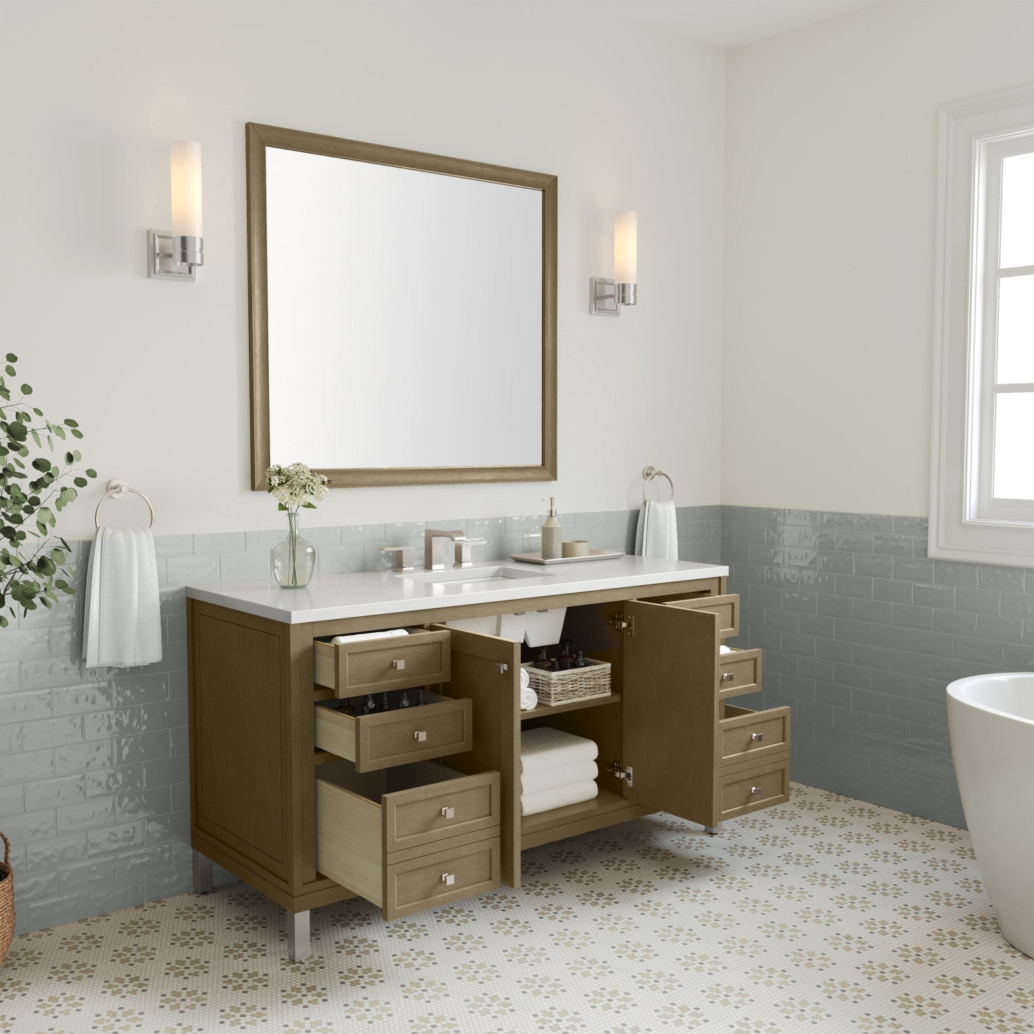 The sophisticated details and clean lines of the Chicago 60" Single Vanity by James Martin Vanities make it the perfect choice for any bathroom. Featuring a Glossy White, Smokey Celadon, or Walnut Whisper finish. This vanity offers ample storage with its two-door cabinet, adjustable interior shelf, and top-row tip-out drawer. Champagne Brass knobs and legs (in Glossy White, Smokey Celadon) or Satin Nickel knobs and legs (Walnut Whisper Only), or choose to forego the metal legs for a modern wall-mounted installation. Complete the look with one of our 3 cm tops.