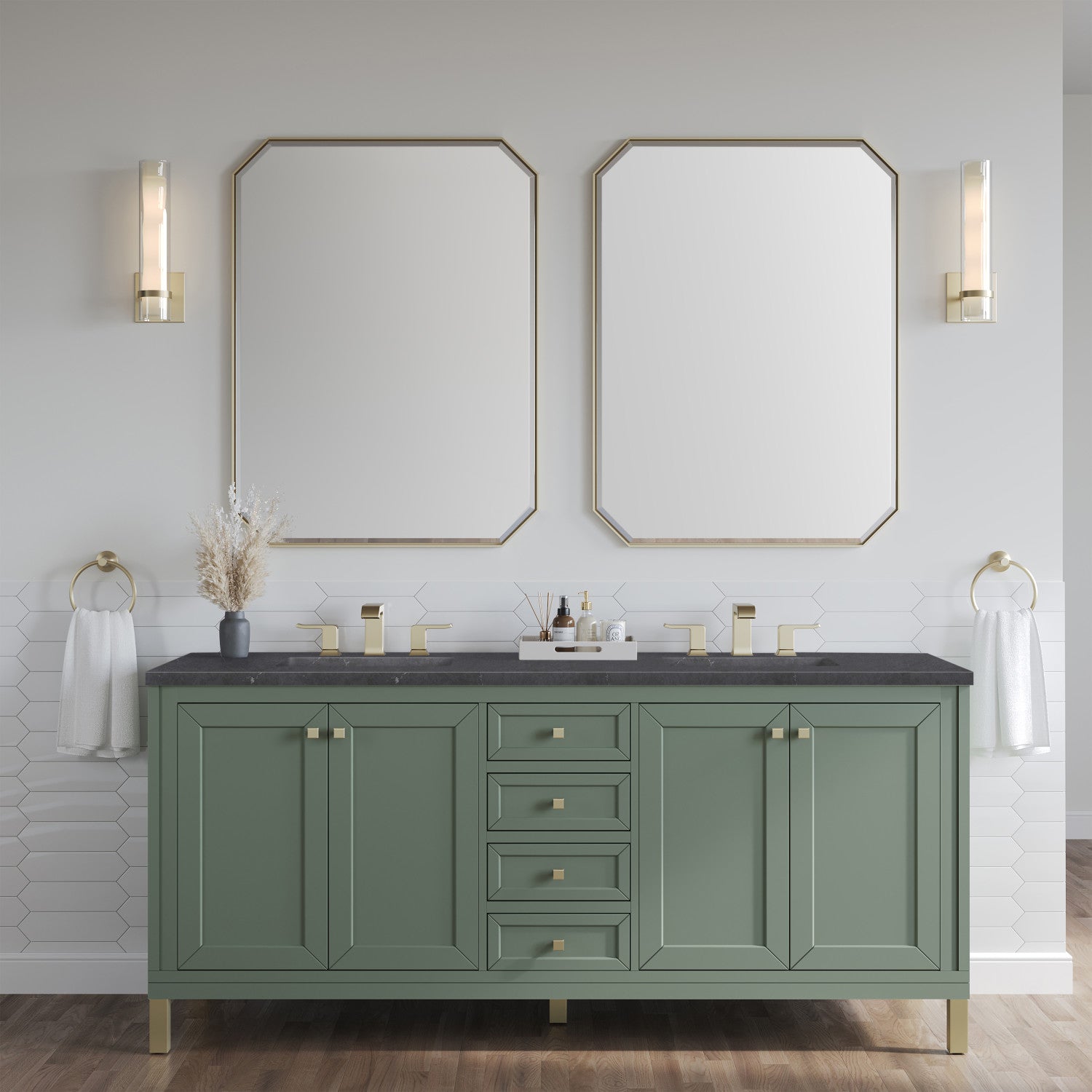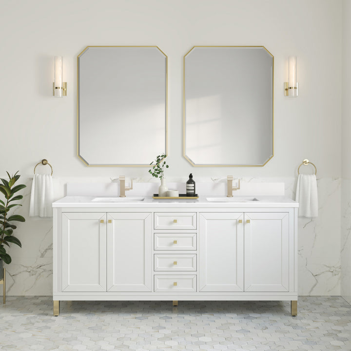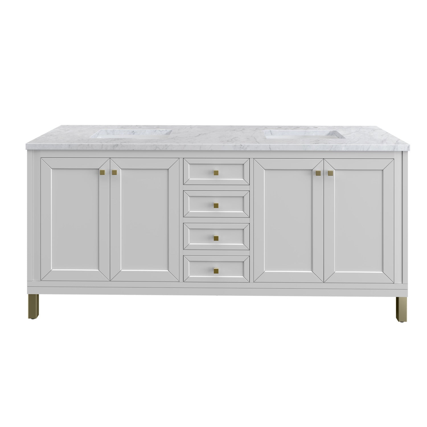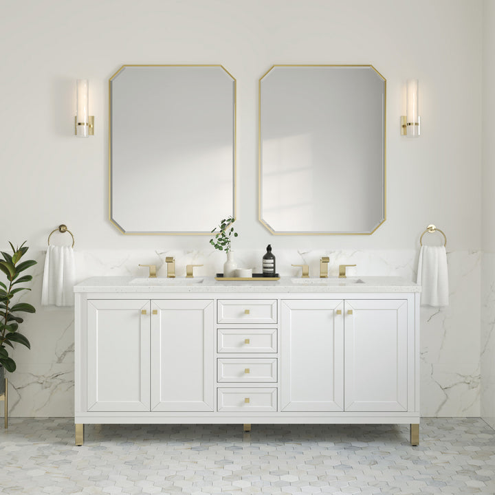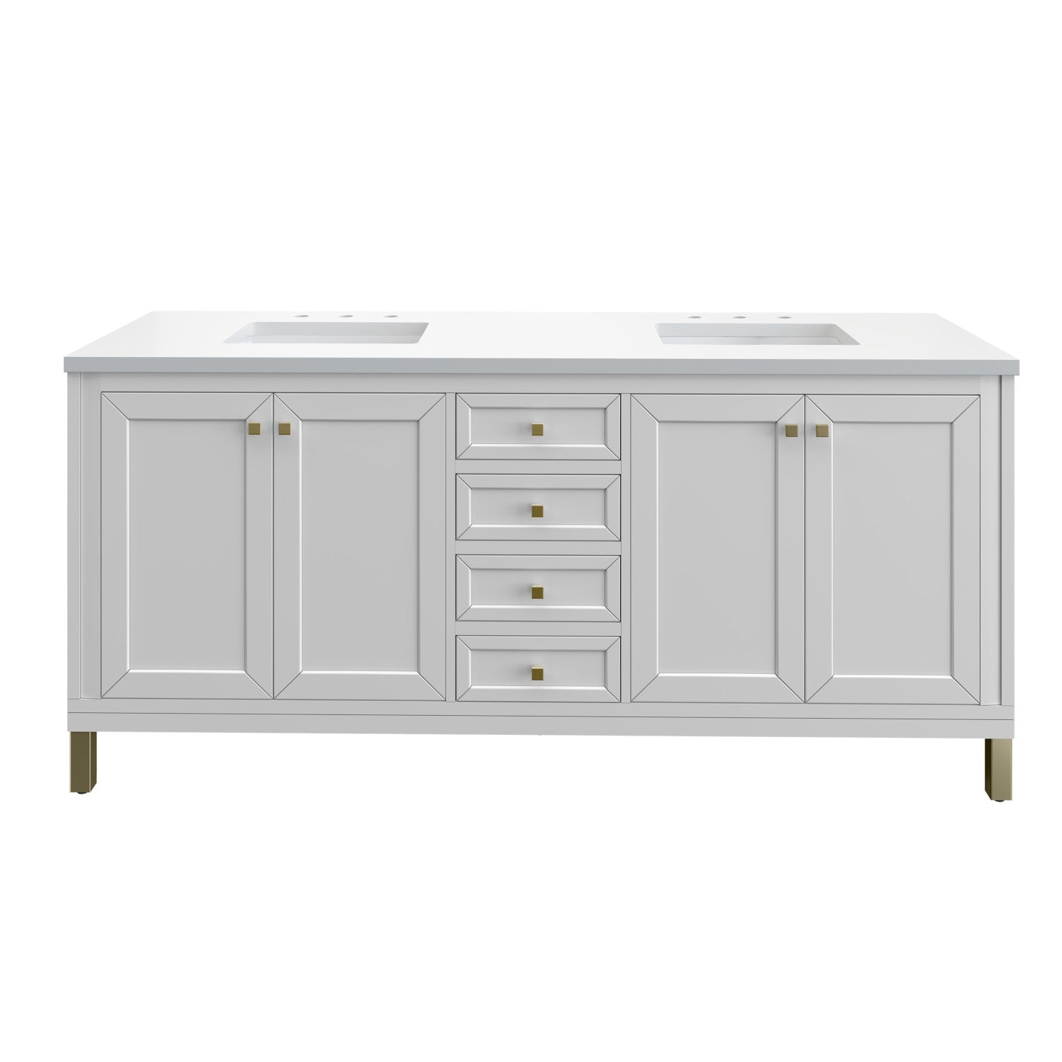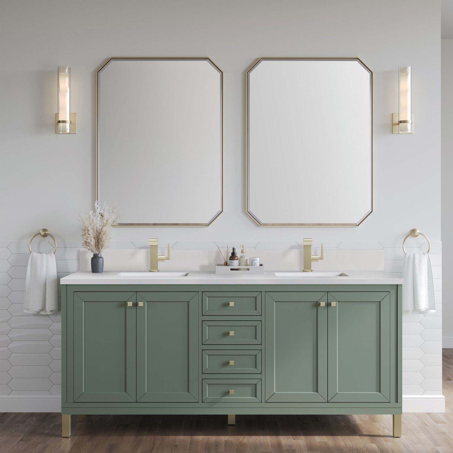 The sophisticated details and clean lines of the Chicago 72" Double Vanity by James Martin Vanities make it the perfect choice for any bathroom. Featuring a Glossy White, Smokey Celadon, or Walnut Whisper finish. This vanity offers ample storage with its two-door cabinet, adjustable interior shelf, and top-row tip-out drawer. Champagne Brass knobs and legs (in Glossy White, Smokey Celadon) or Satin Nickel knobs and legs (Walnut Whisper Only), or choose to forego the metal legs for a modern wall-mounted installation. Complete the look with one of our 3 cm tops.