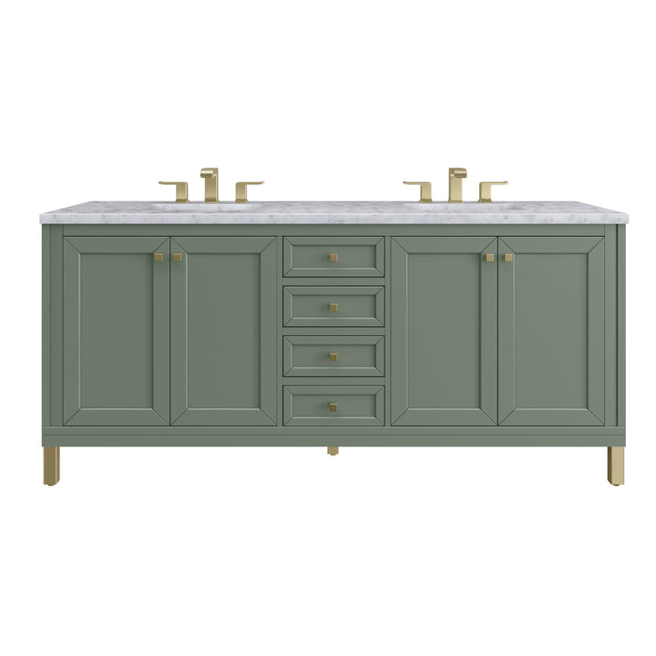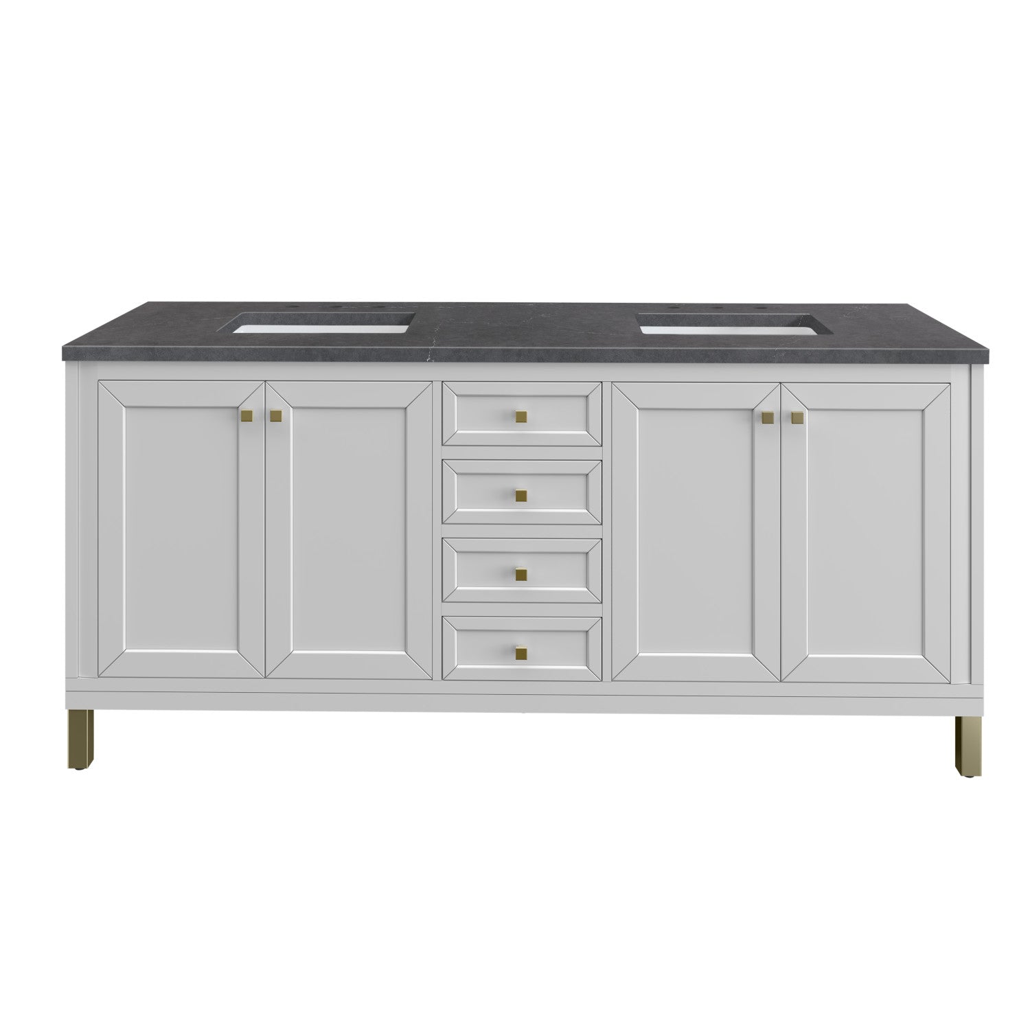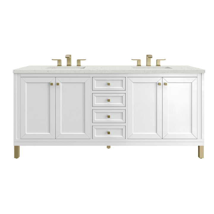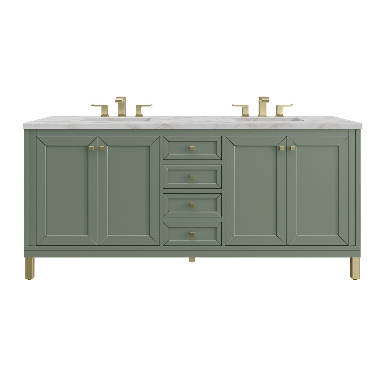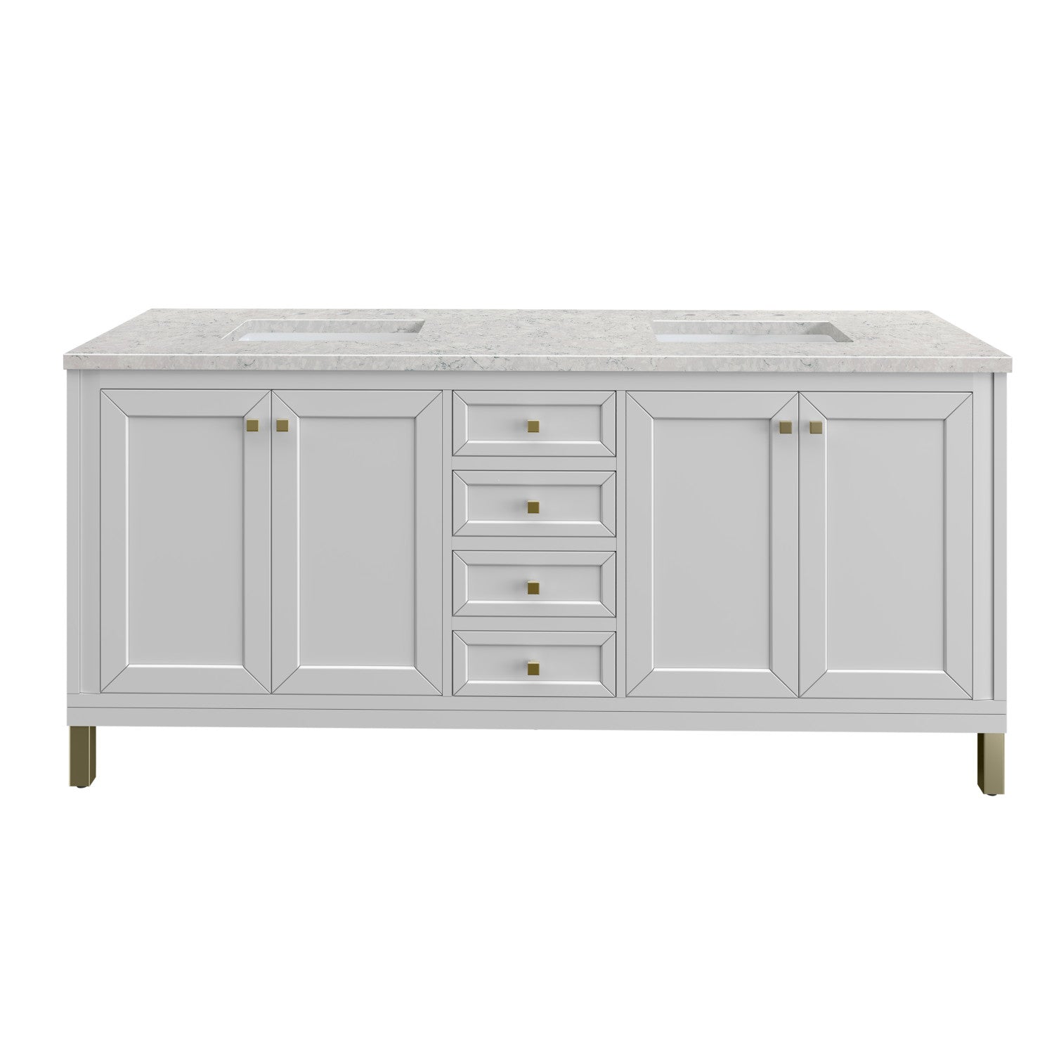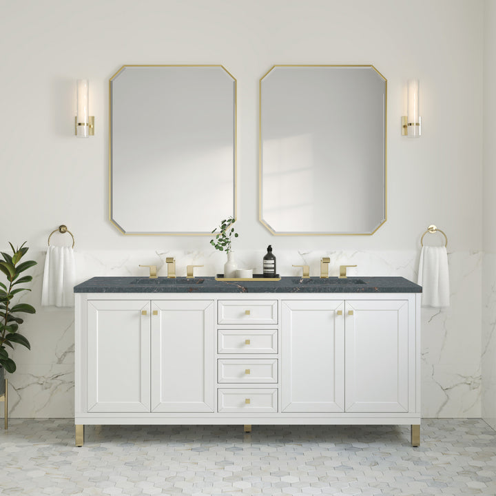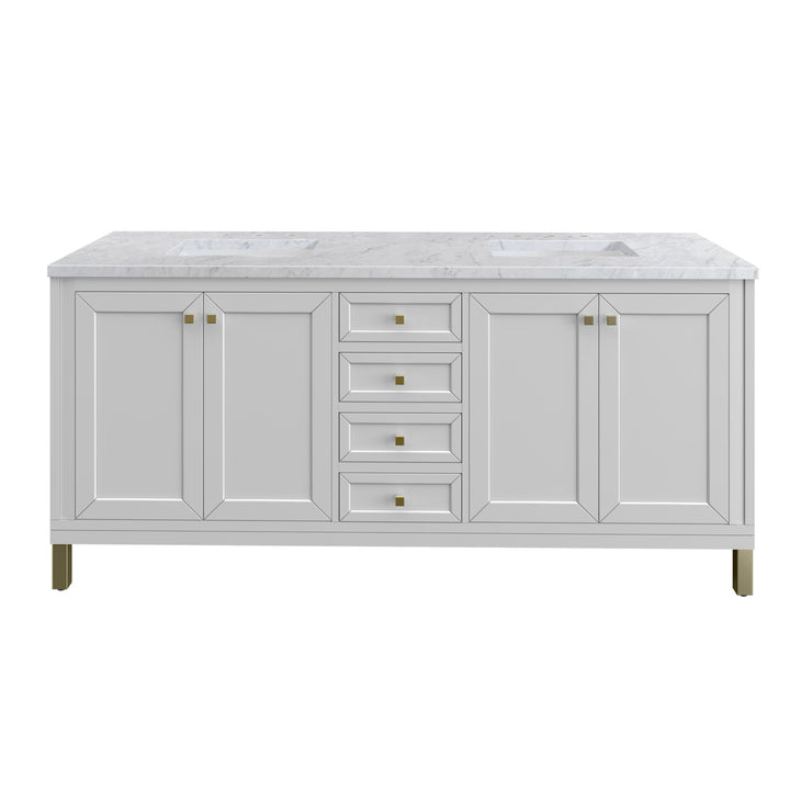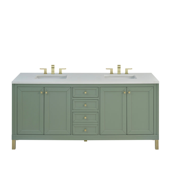 The sophisticated details and clean lines of the Chicago 72" Double Vanity by James Martin Vanities make it the perfect choice for any bathroom. Featuring a Glossy White, Smokey Celadon, or Walnut Whisper finish. This vanity offers ample storage with its two-door cabinet, adjustable interior shelf, and top-row tip-out drawer. Champagne Brass knobs and legs (in Glossy White, Smokey Celadon) or Satin Nickel knobs and legs (Walnut Whisper Only), or choose to forego the metal legs for a modern wall-mounted installation. Complete the look with one of our 3 cm tops.
