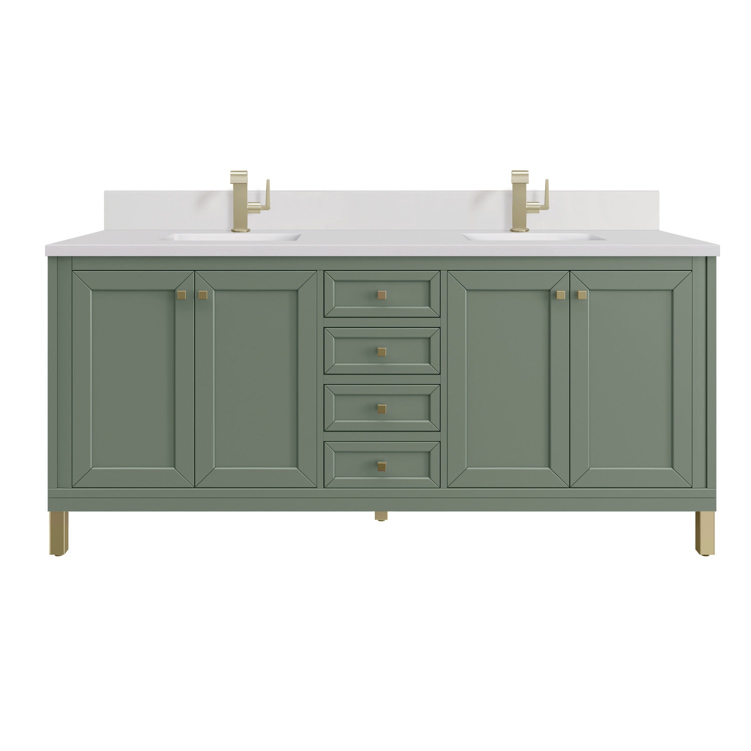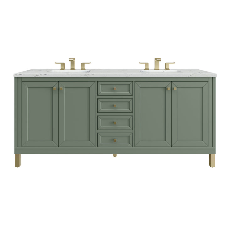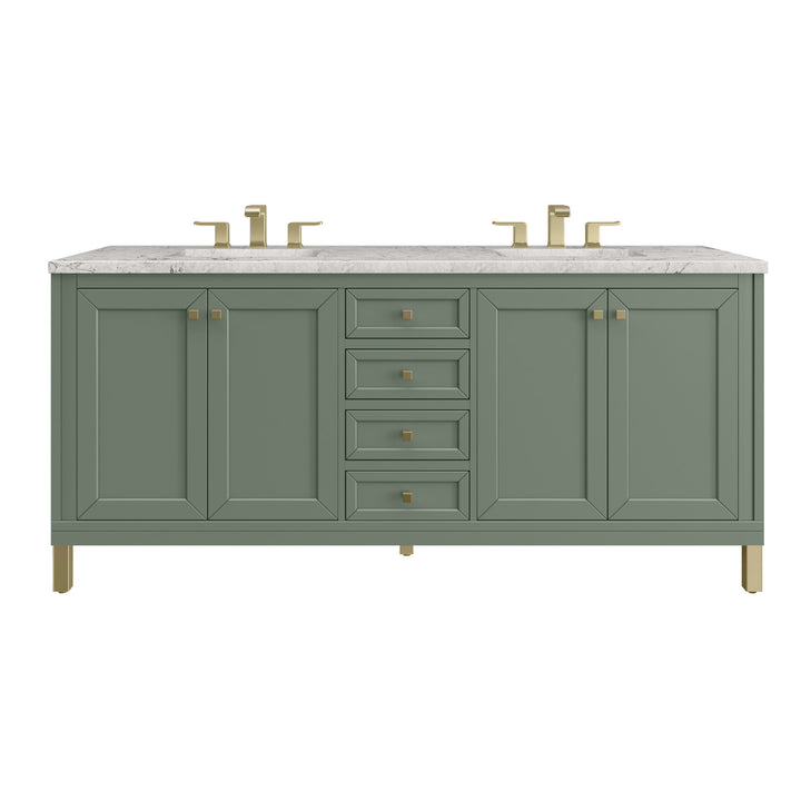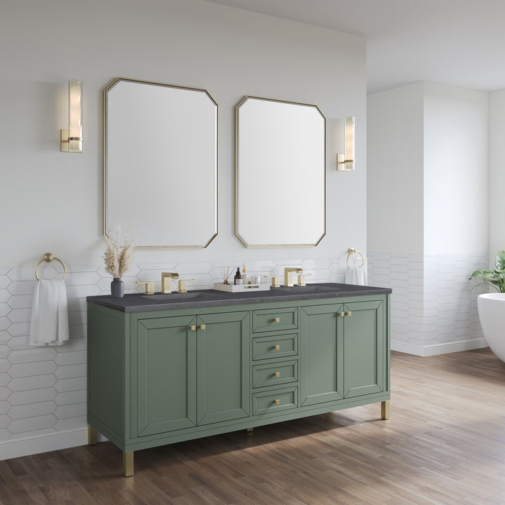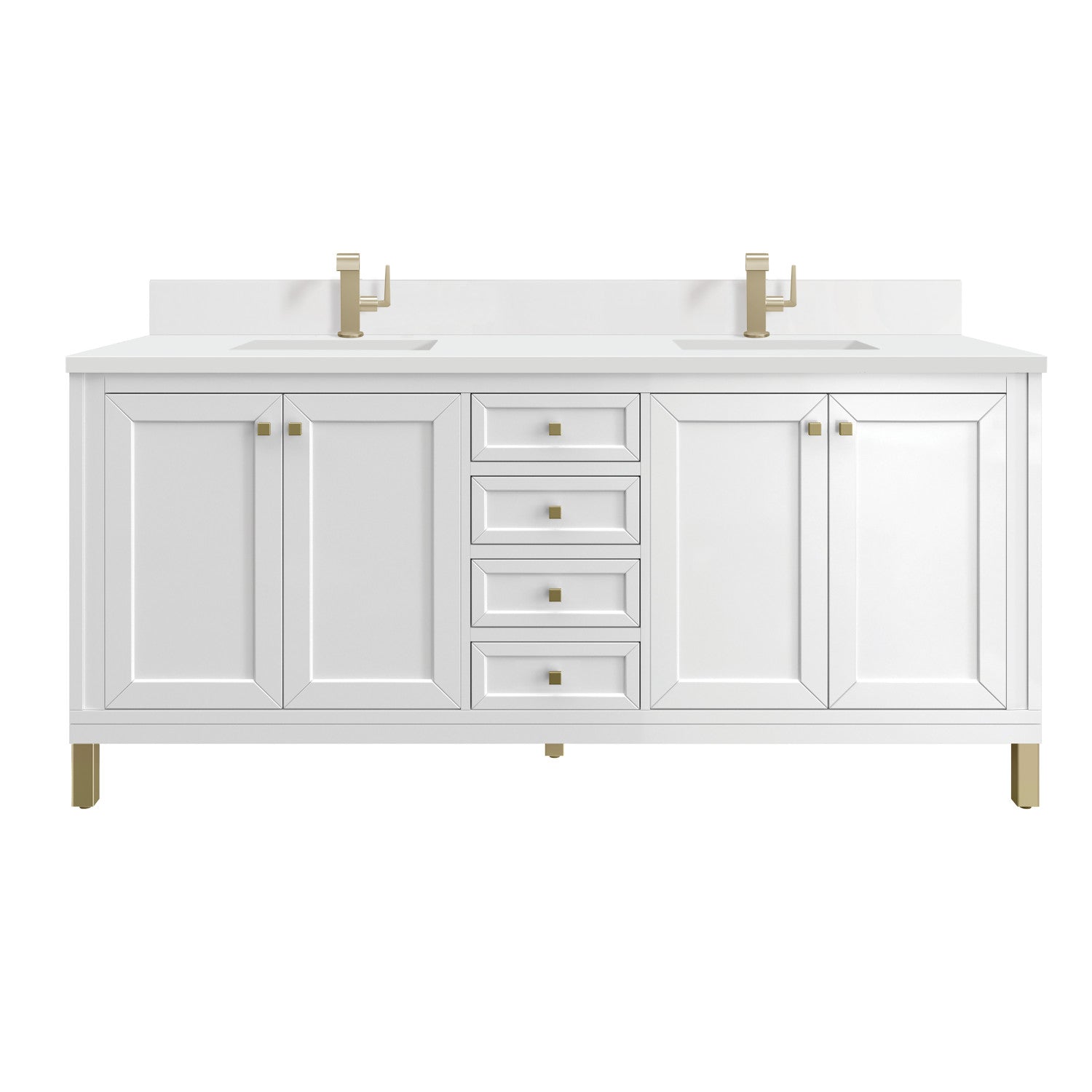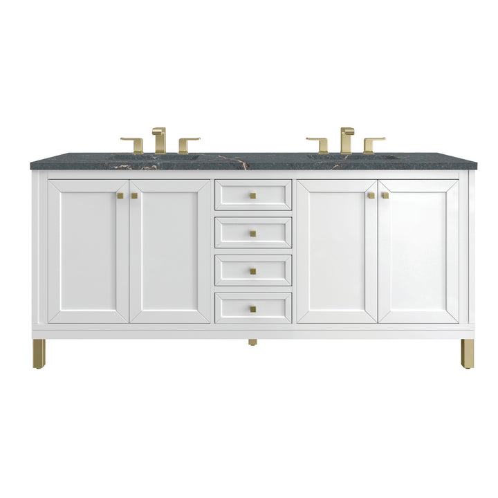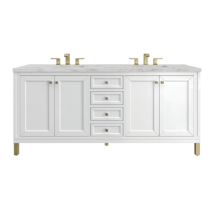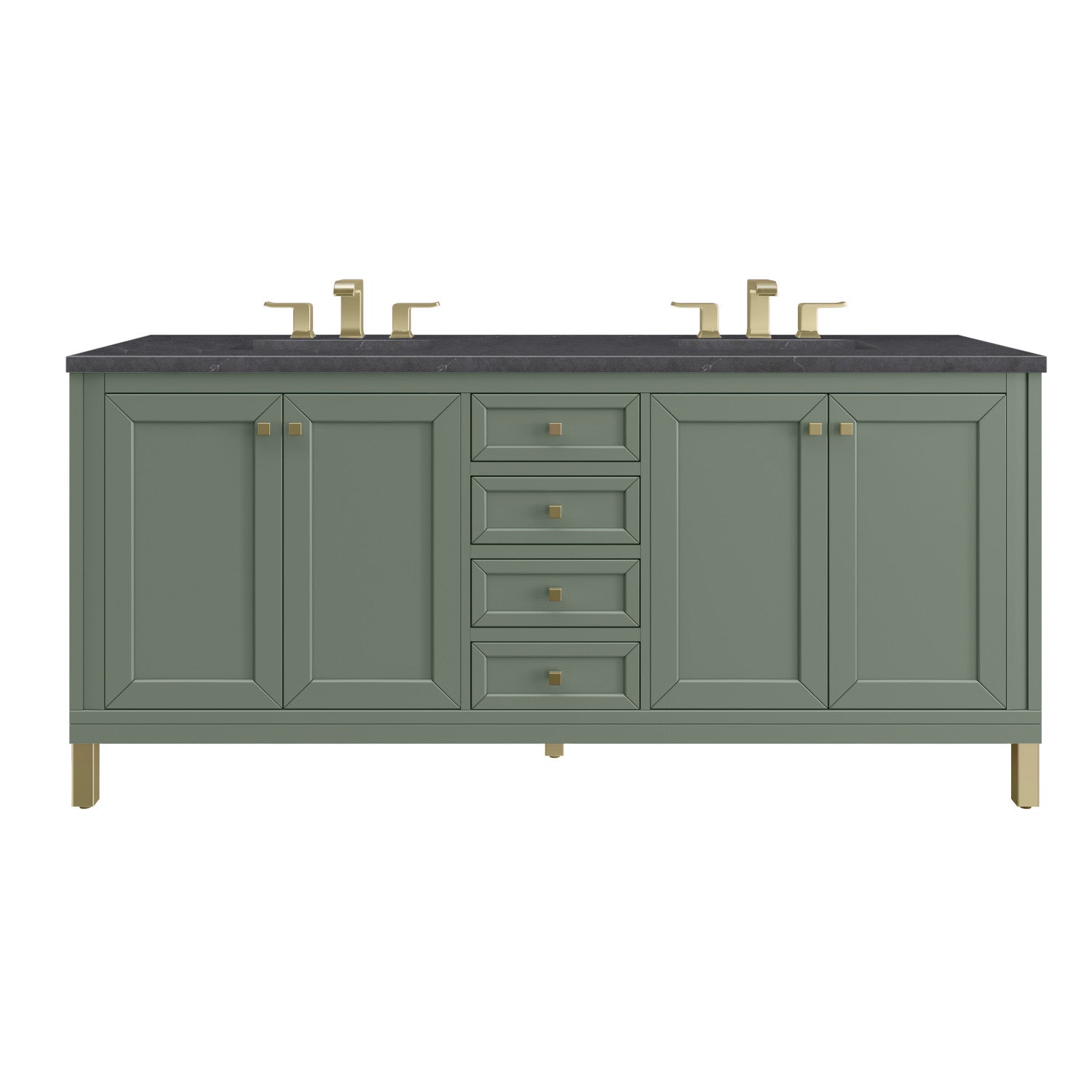 The sophisticated details and clean lines of the Chicago 72" Double Vanity by James Martin Vanities make it the perfect choice for any bathroom. Featuring a Glossy White, Smokey Celadon, or Walnut Whisper finish. This vanity offers ample storage with its two-door cabinet, adjustable interior shelf, and top-row tip-out drawer. Champagne Brass knobs and legs (in Glossy White, Smokey Celadon) or Satin Nickel knobs and legs (Walnut Whisper Only), or choose to forego the metal legs for a modern wall-mounted installation. Complete the look with one of our 3 cm tops.