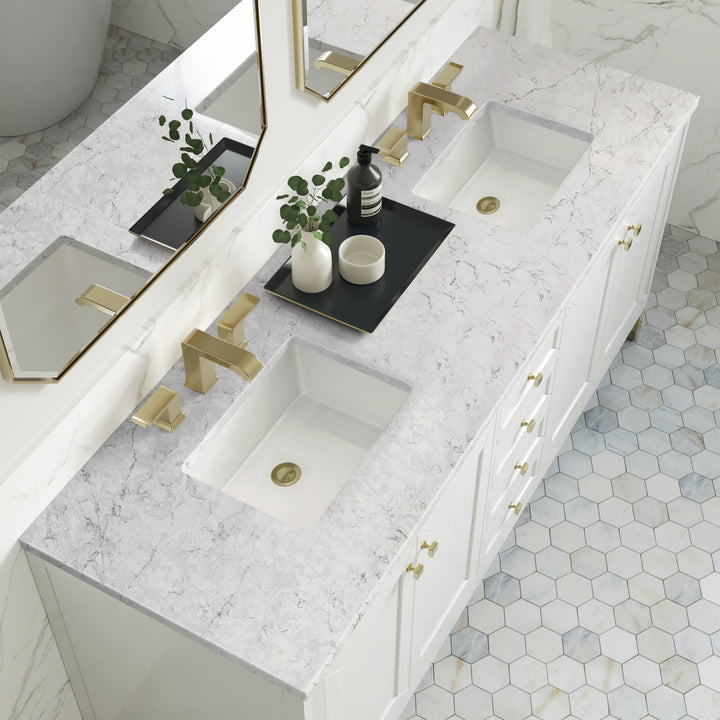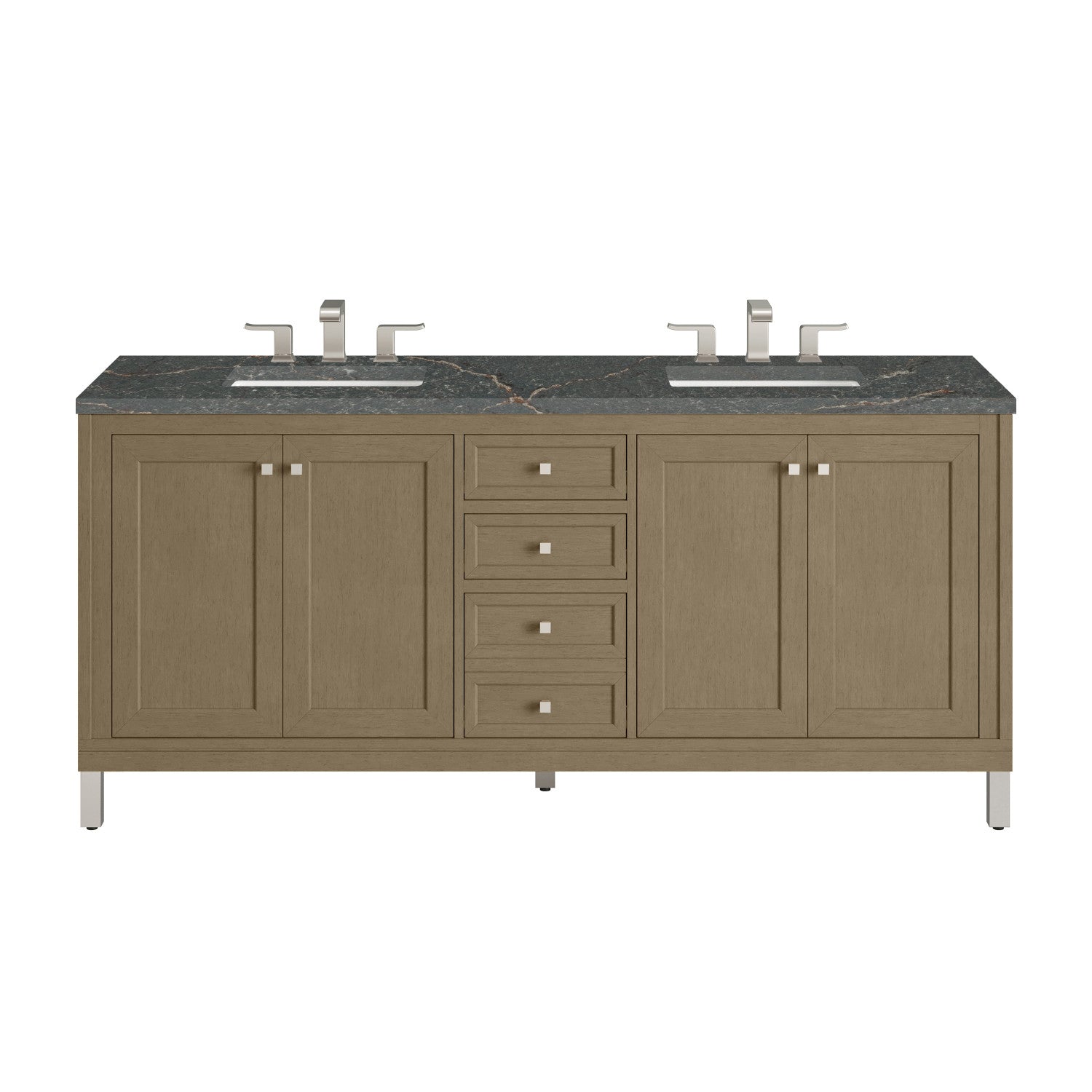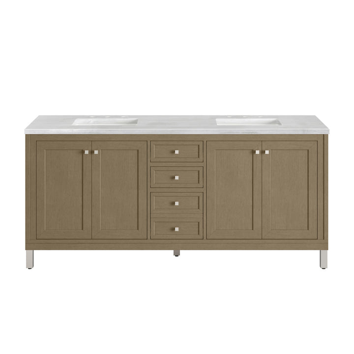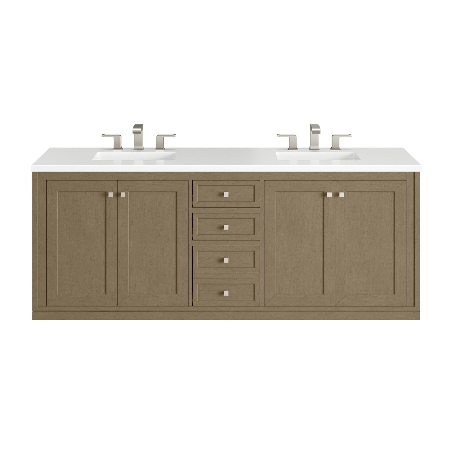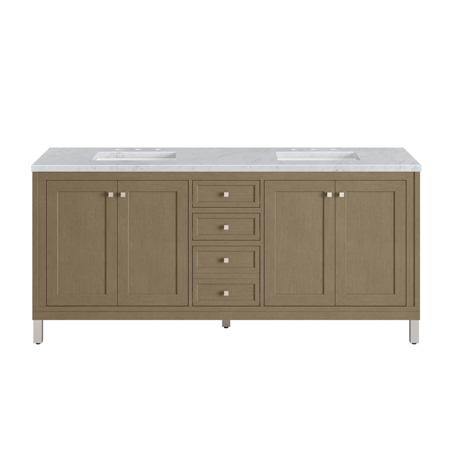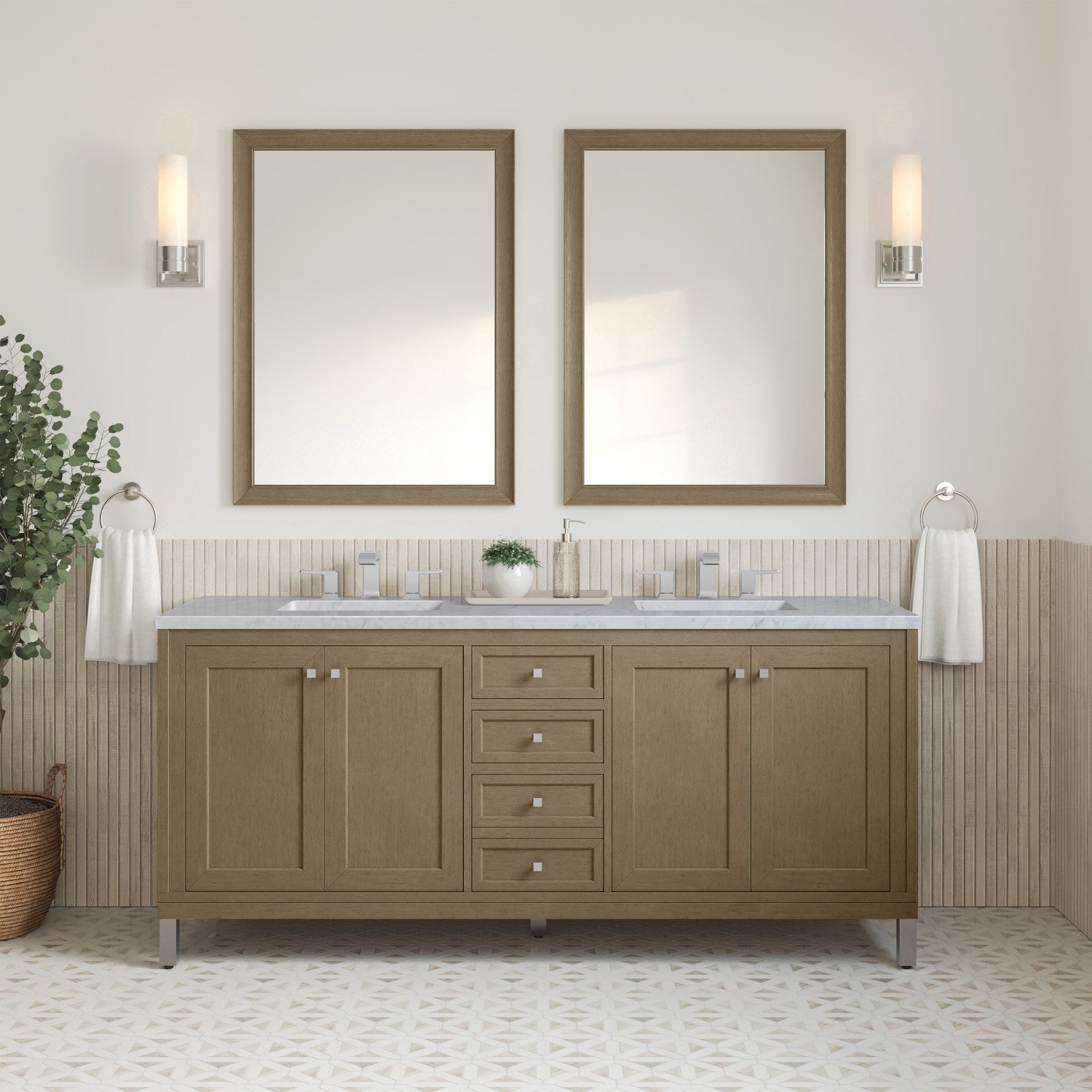 The sophisticated details and clean lines of the Chicago 72" Double Vanity by James Martin Vanities make it the perfect choice for any bathroom. Featuring a Glossy White, Smokey Celadon, or Walnut Whisper finish. This vanity offers ample storage with its two-door cabinet, adjustable interior shelf, and top-row tip-out drawer. Champagne Brass knobs and legs (in Glossy White, Smokey Celadon) or Satin Nickel knobs and legs (Walnut Whisper Only), or choose to forego the metal legs for a modern wall-mounted installation. Complete the look with one of our 3 cm tops.