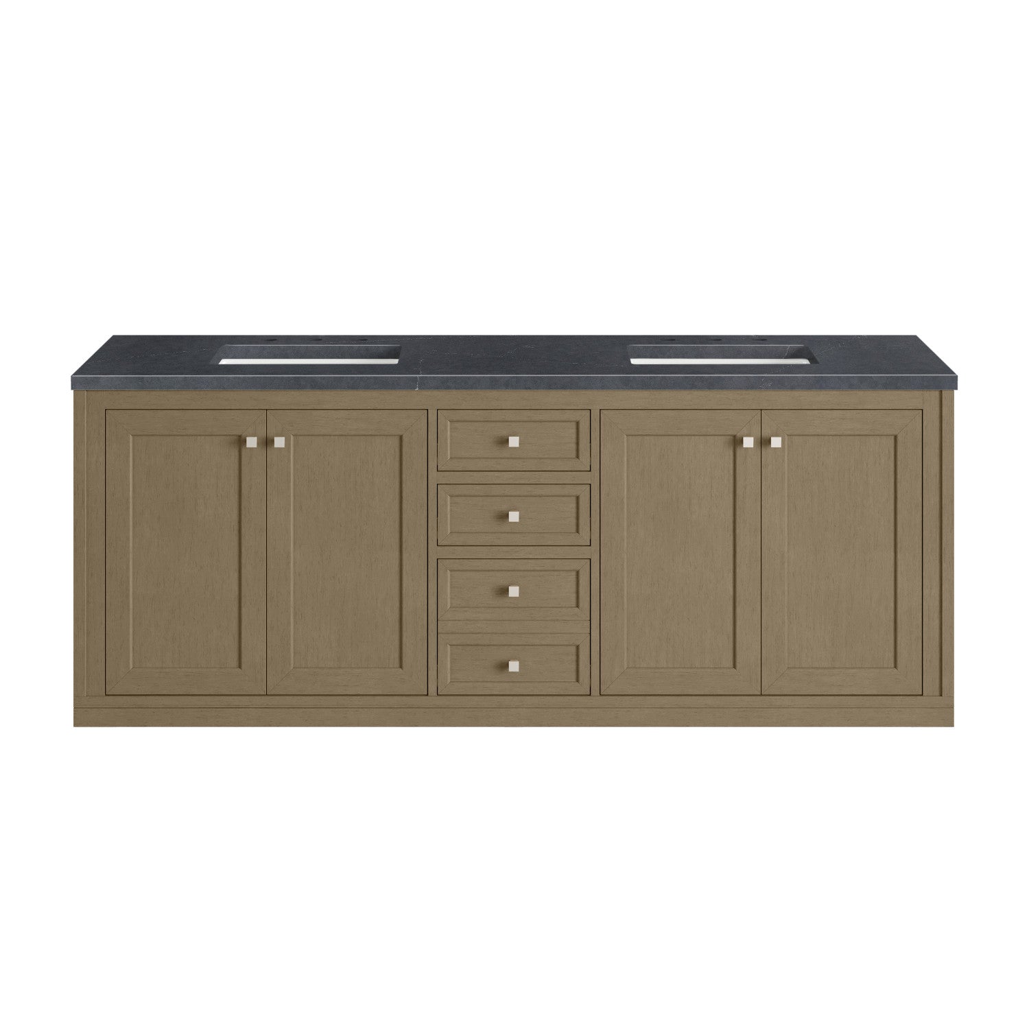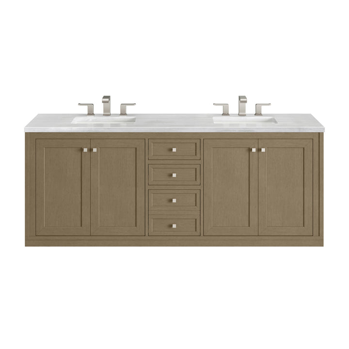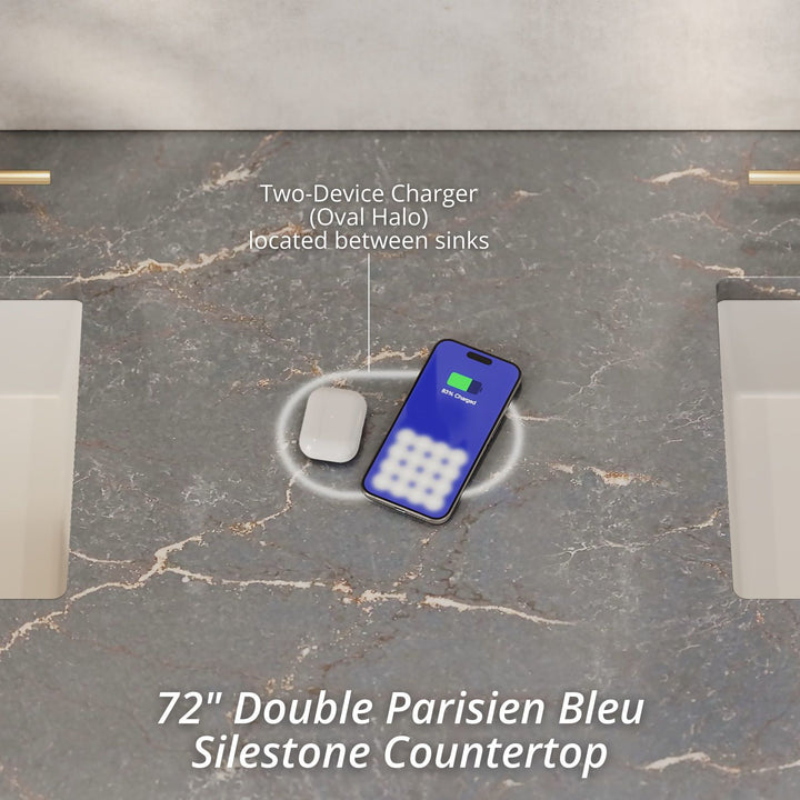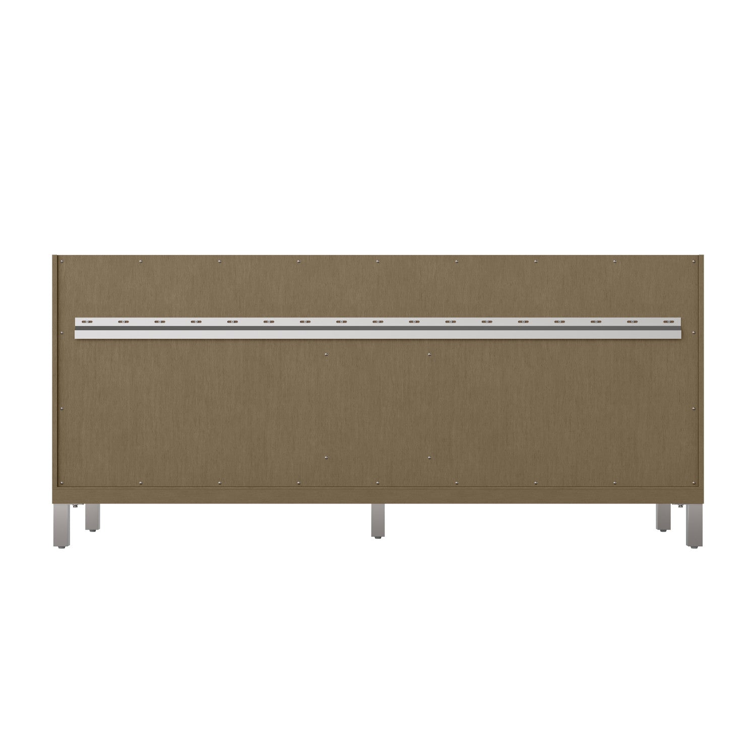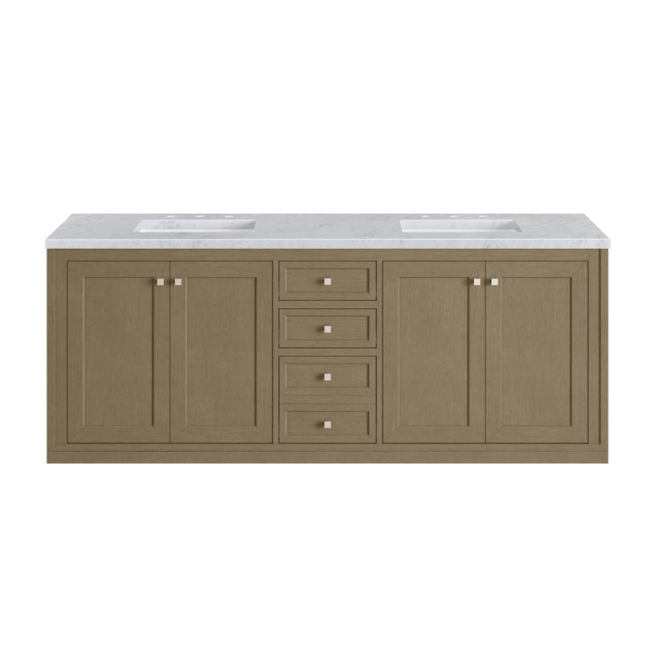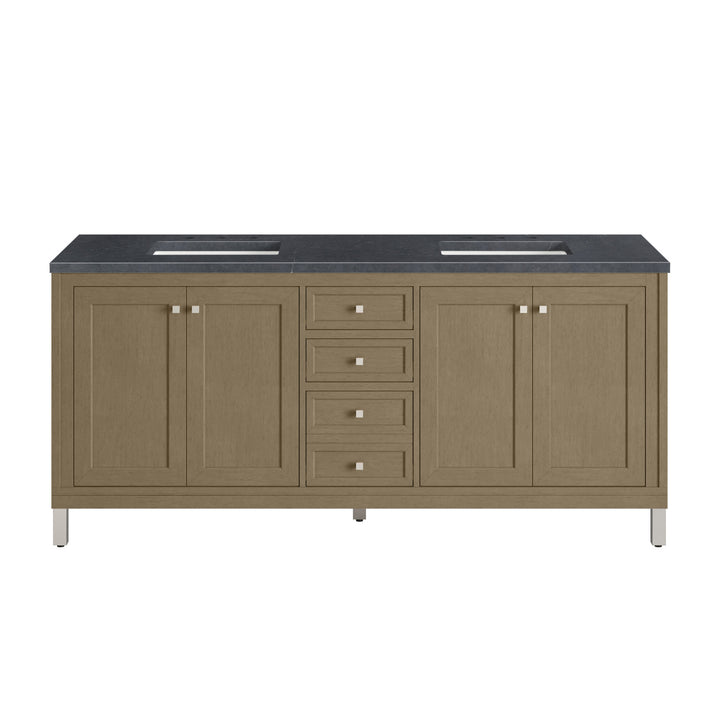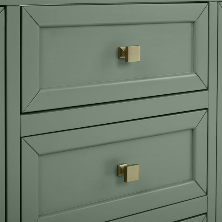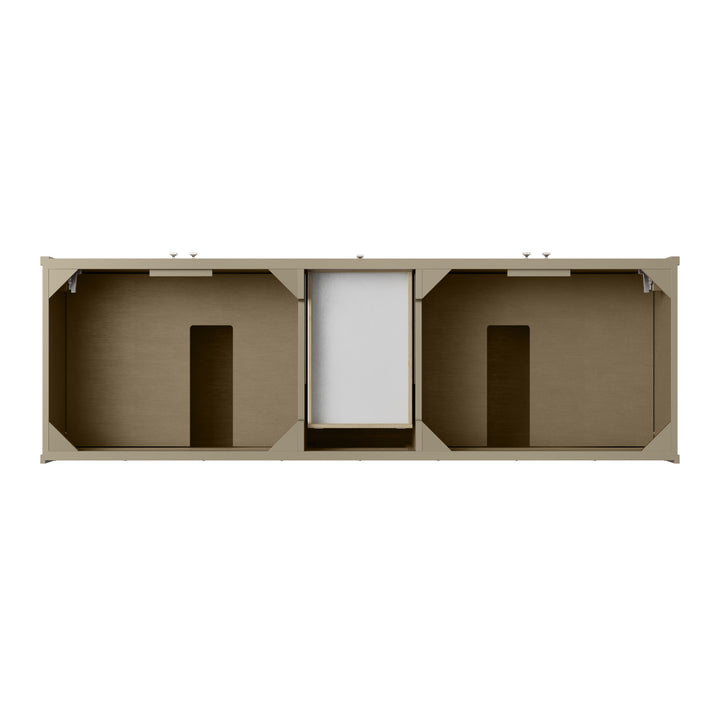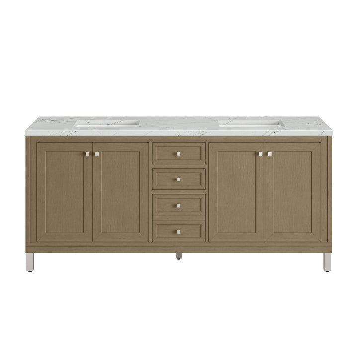 The sophisticated details and clean lines of the Chicago 72" Double Vanity by James Martin Vanities make it the perfect choice for any bathroom. Featuring a Glossy White, Smokey Celadon, or Walnut Whisper finish. This vanity offers ample storage with its two-door cabinet, adjustable interior shelf, and top-row tip-out drawer. Champagne Brass knobs and legs (in Glossy White, Smokey Celadon) or Satin Nickel knobs and legs (Walnut Whisper Only), or choose to forego the metal legs for a modern wall-mounted installation. Complete the look with one of our 3 cm tops.