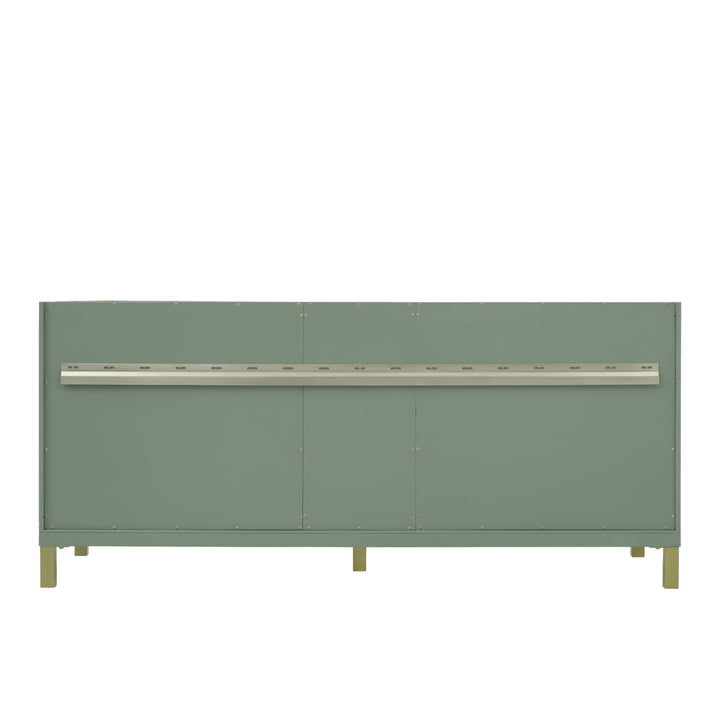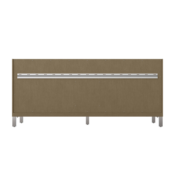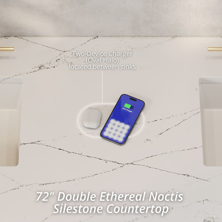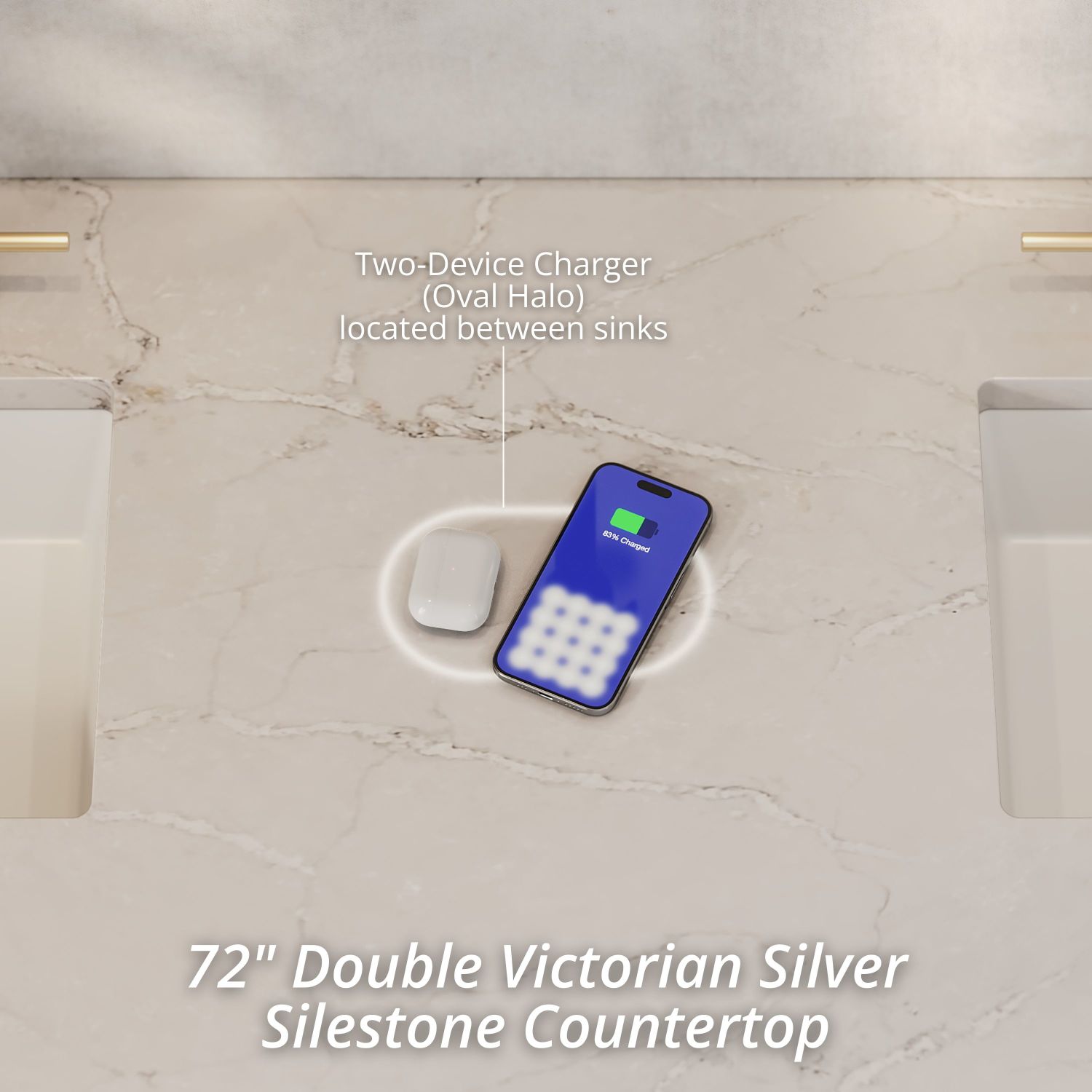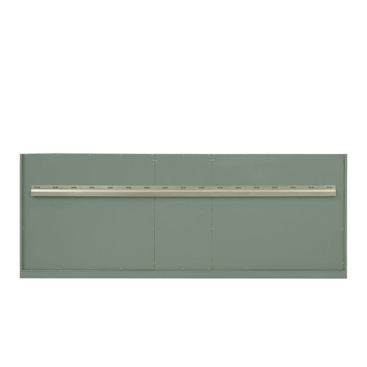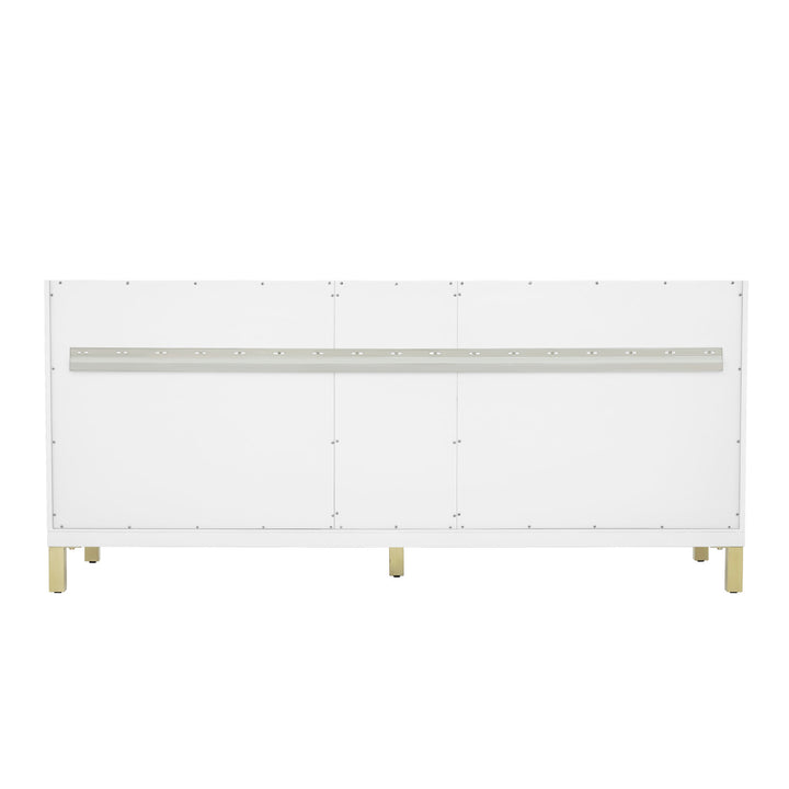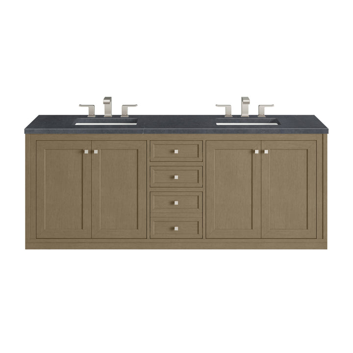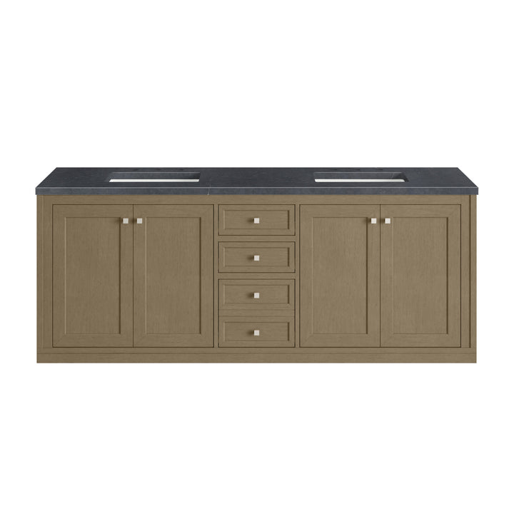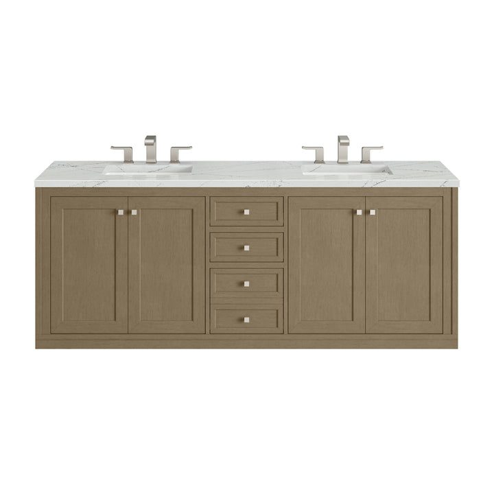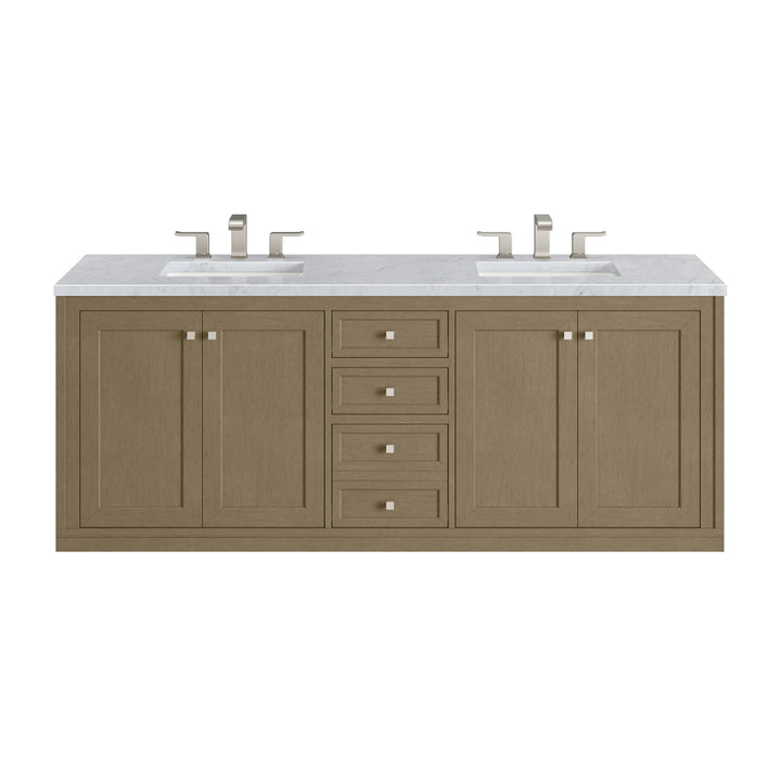 The sophisticated details and clean lines of the Chicago 72" Double Vanity by James Martin Vanities make it the perfect choice for any bathroom. Featuring a Glossy White, Smokey Celadon, or Walnut Whisper finish. This vanity offers ample storage with its two-door cabinet, adjustable interior shelf, and top-row tip-out drawer. Champagne Brass knobs and legs (in Glossy White, Smokey Celadon) or Satin Nickel knobs and legs (Walnut Whisper Only), or choose to forego the metal legs for a modern wall-mounted installation. Complete the look with one of our 3 cm tops.
