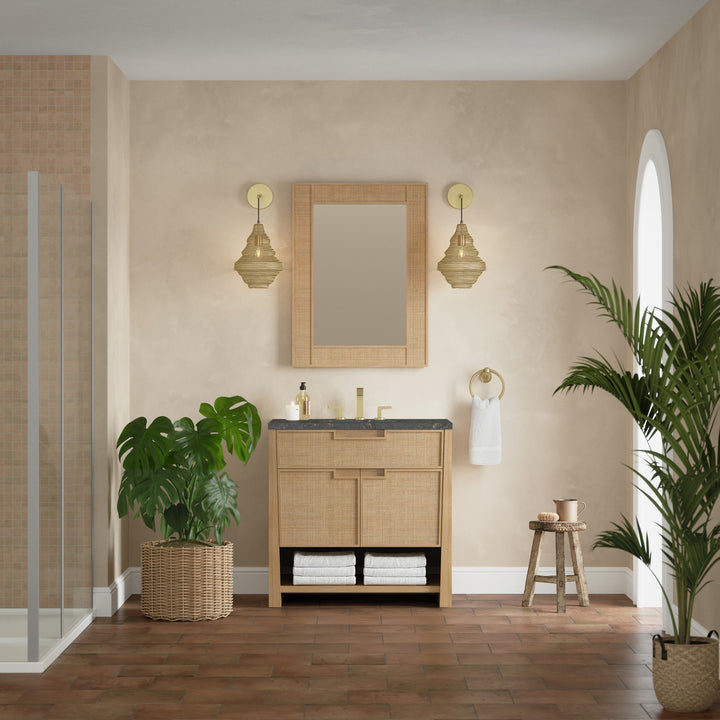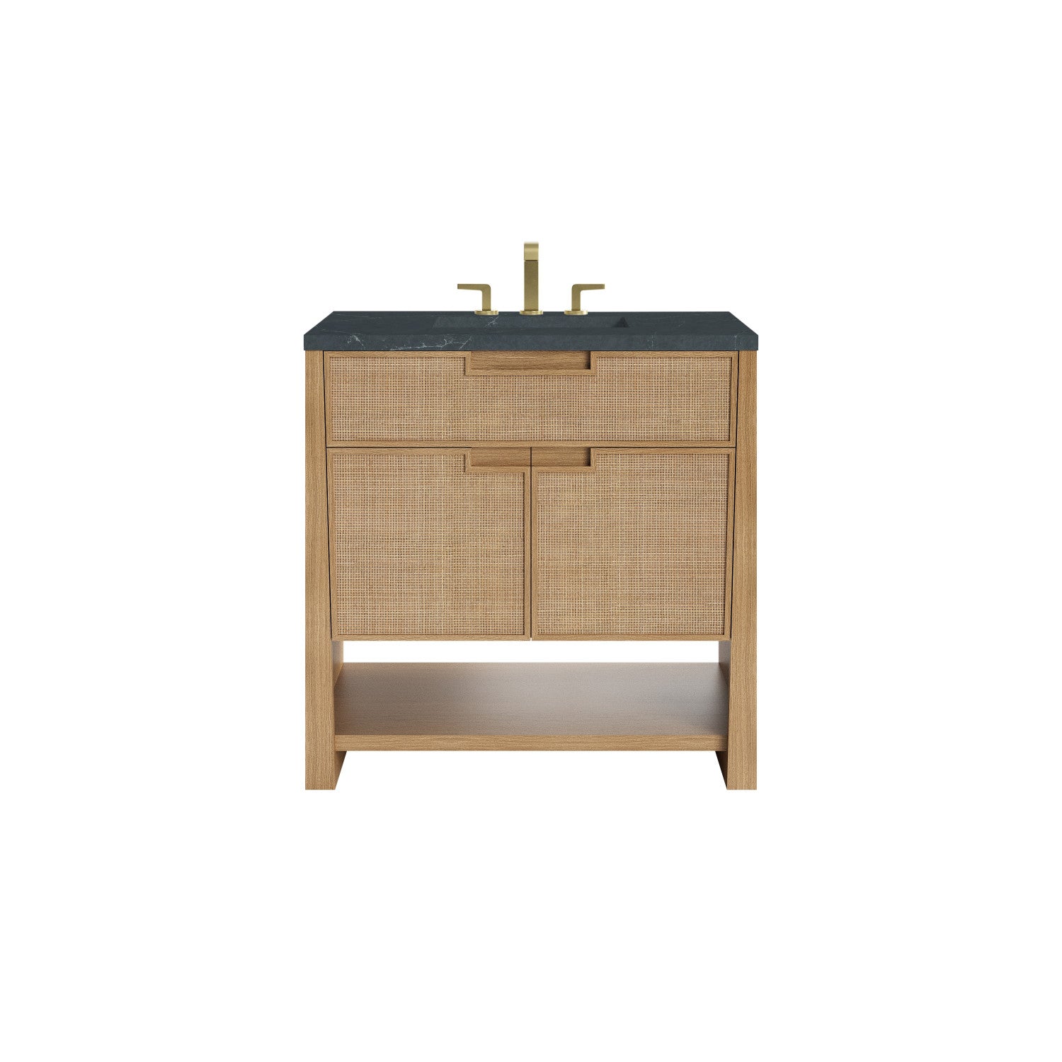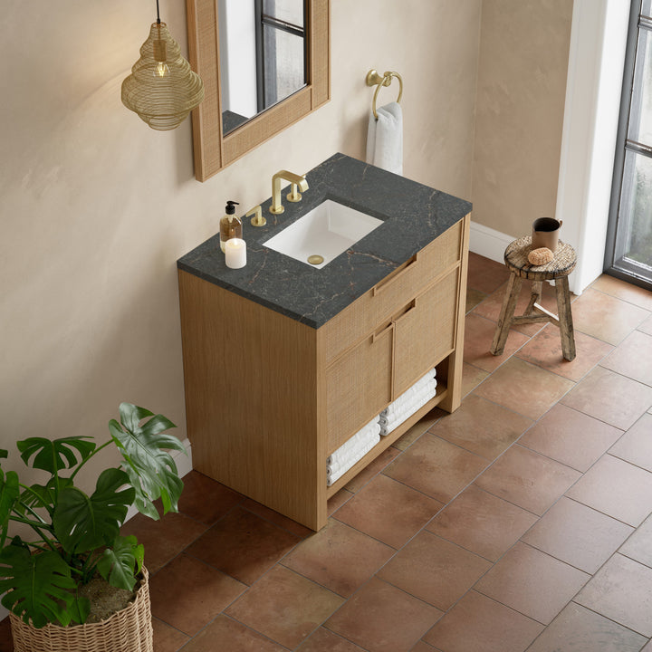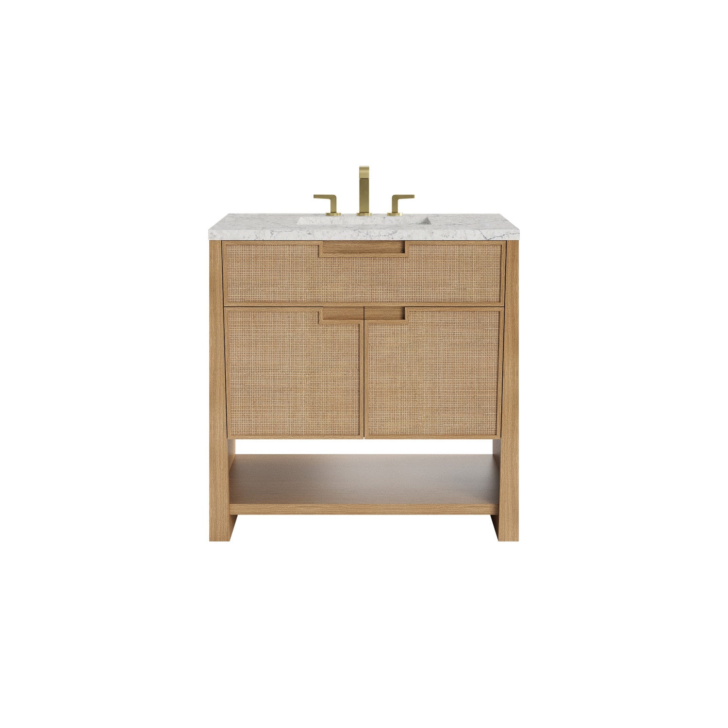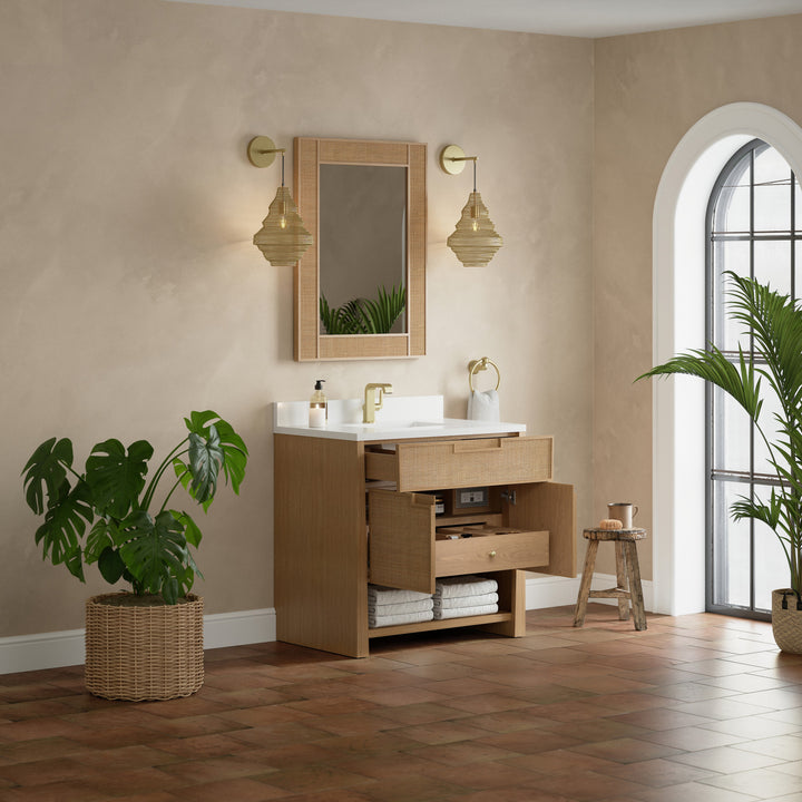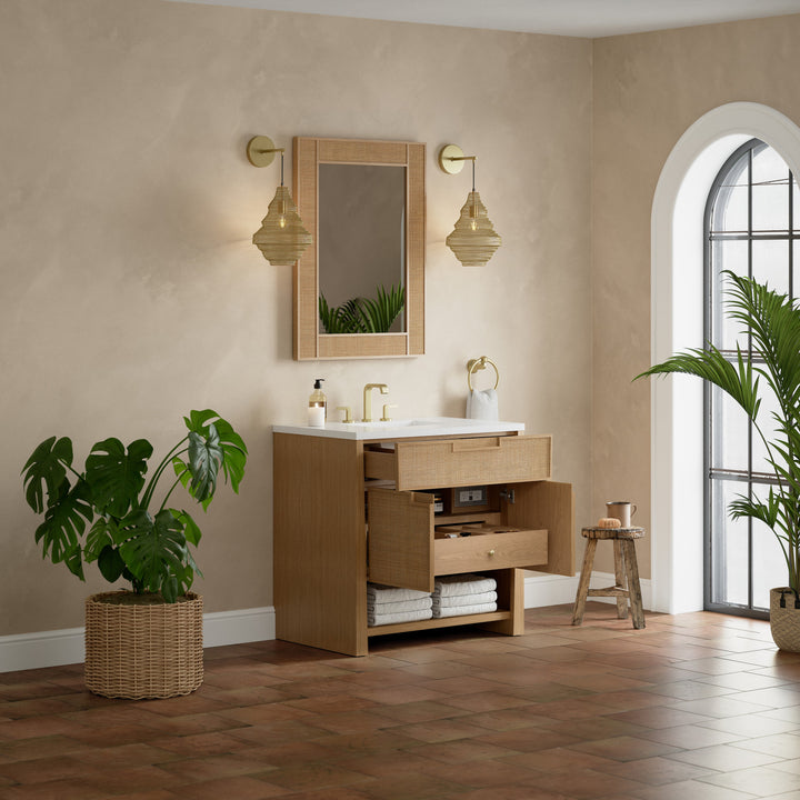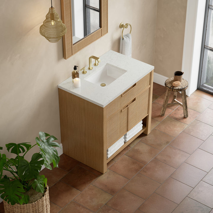 The Solene 36" Single Vanity elegantly weaves together a beautiful blend of natural materials. Framed in solid White Oak, the natural Cane detail and warm Seaside Oak finish make the Solene a stunning centerpiece for your bathroom. The subtle reverse-tapered legs and modern cutout cabinet pulls add visual intrigue to your space. Featuring an integrated USB/120V power unit and removable White Oak drawer organizer, this vanity offers ample storage with its two-door cabinet, full-extension exterior drawer, interior shelf, and internal drawer, in addition to an open lower shelf. Complete the look with one of our 3 cm tops and bring your bathroom to life with the natural elements and contemporary aesthetic of Solene.