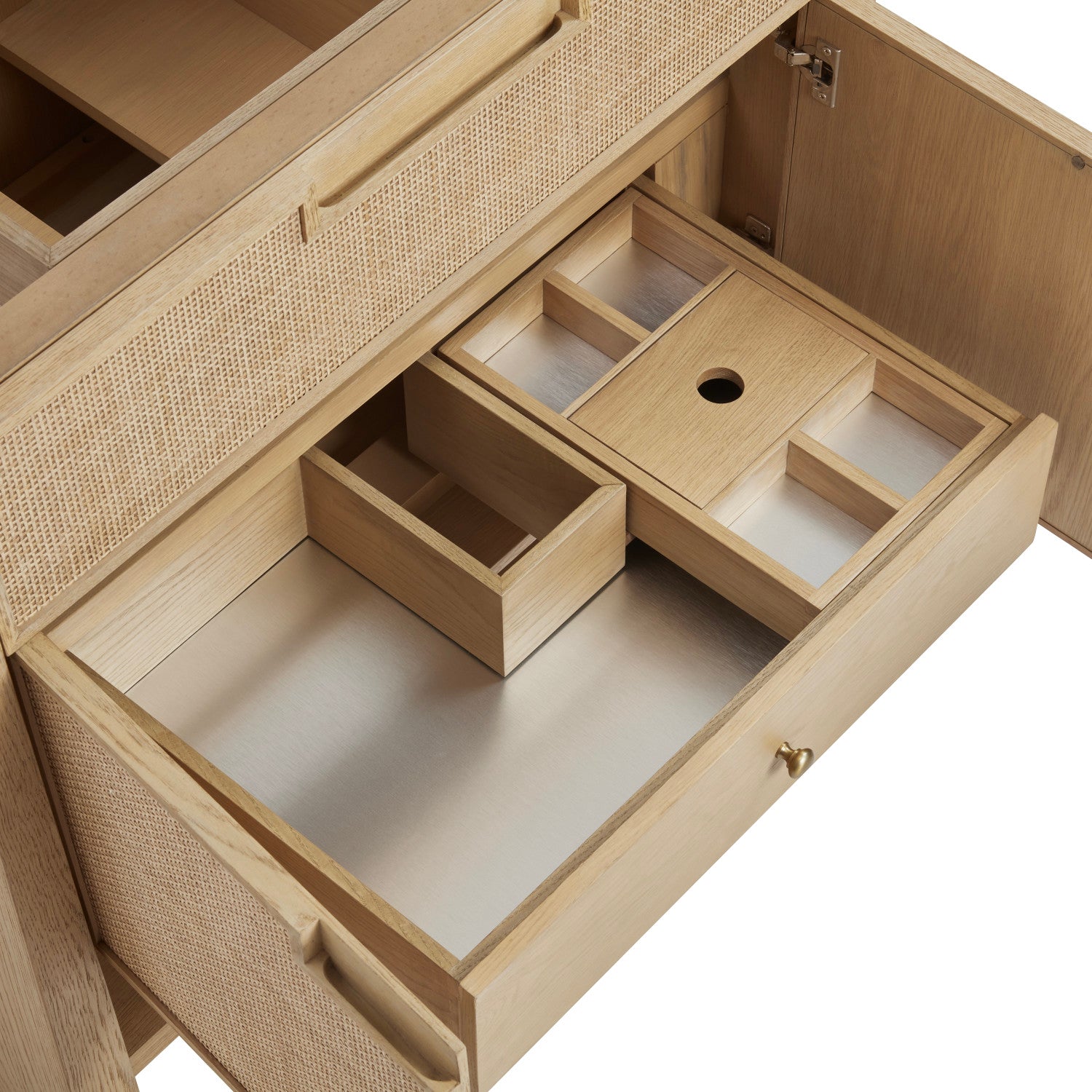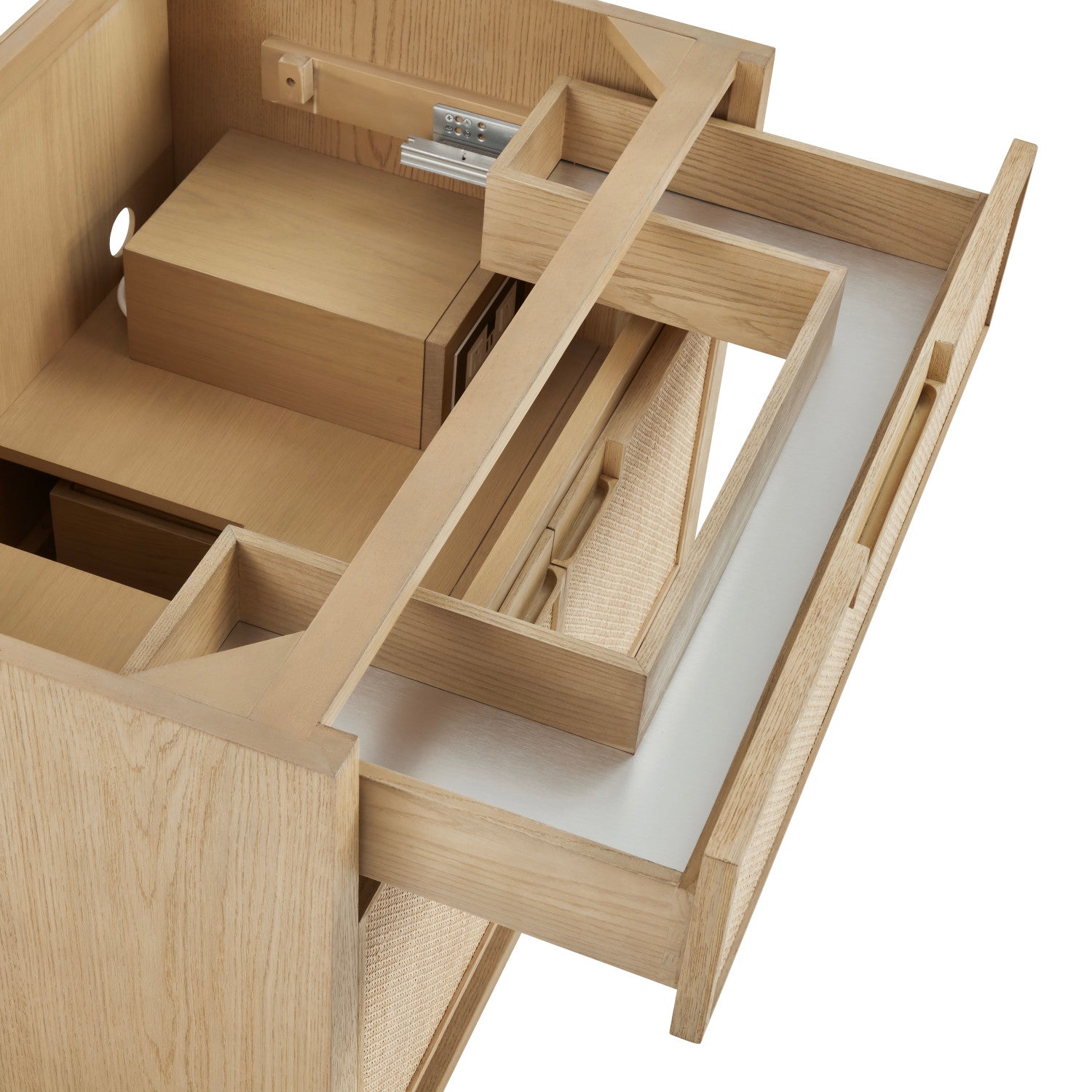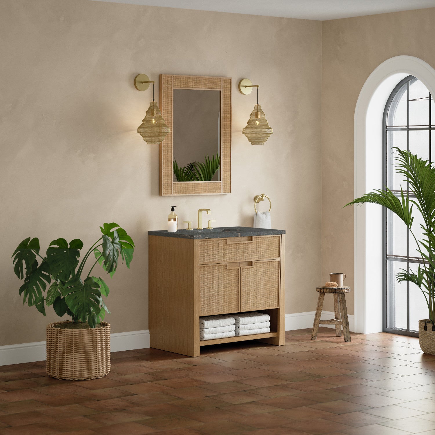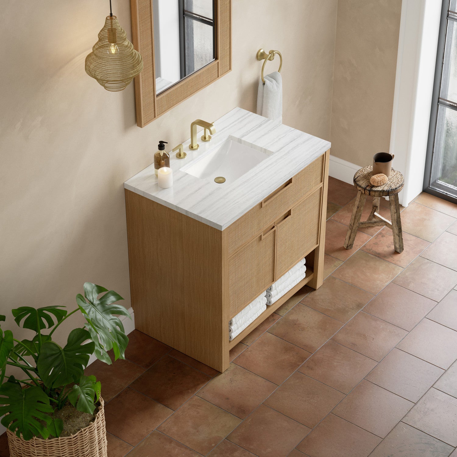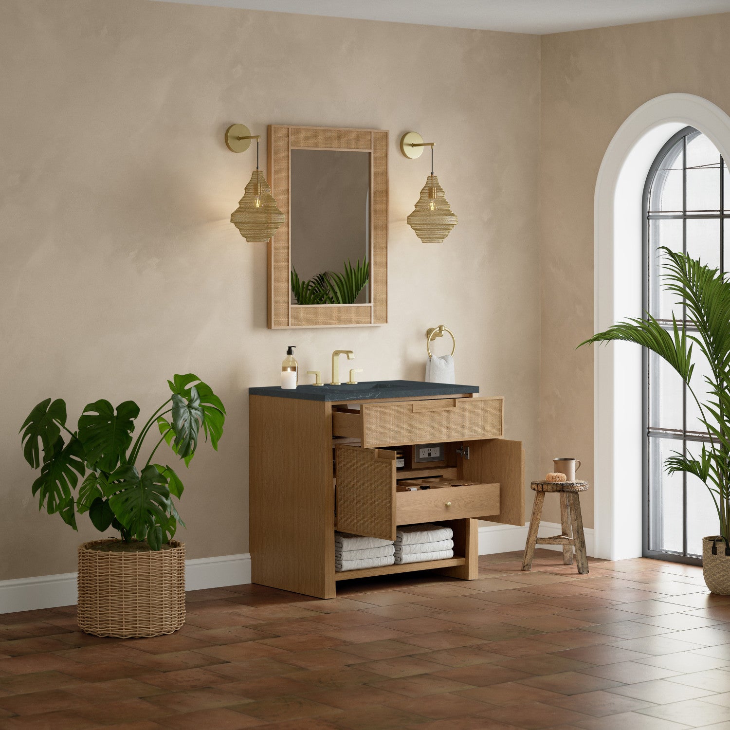 The Solene 36" Single Vanity elegantly weaves together a beautiful blend of natural materials. Framed in solid White Oak, the natural Cane detail and warm Seaside Oak finish make the Solene a stunning centerpiece for your bathroom. The subtle reverse-tapered legs and modern cutout cabinet pulls add visual intrigue to your space. Featuring an integrated USB/120V power unit and removable White Oak drawer organizer, this vanity offers ample storage with its two-door cabinet, full-extension exterior drawer, interior shelf, and internal drawer, in addition to an open lower shelf. Complete the look with one of our 3 cm tops and bring your bathroom to life with the natural elements and contemporary aesthetic of Solene.